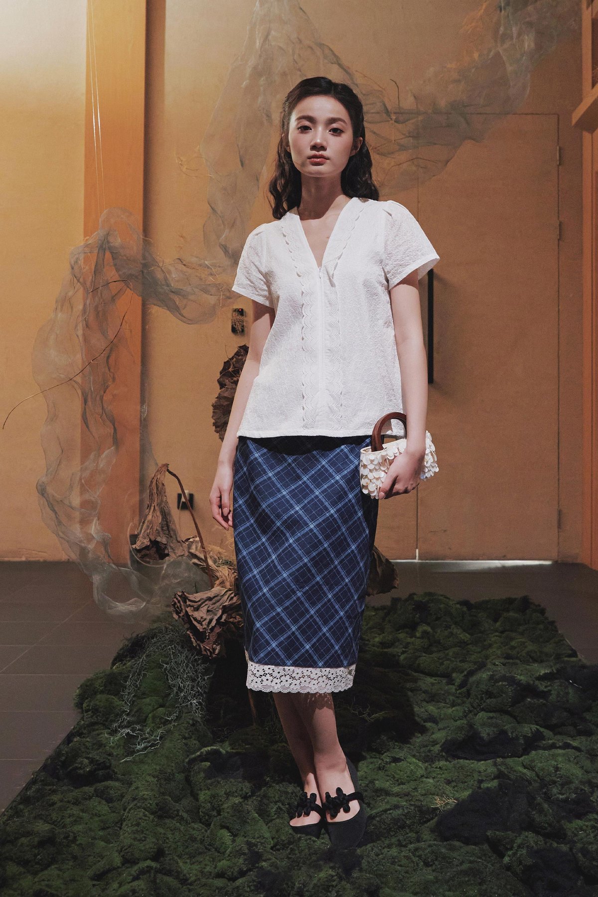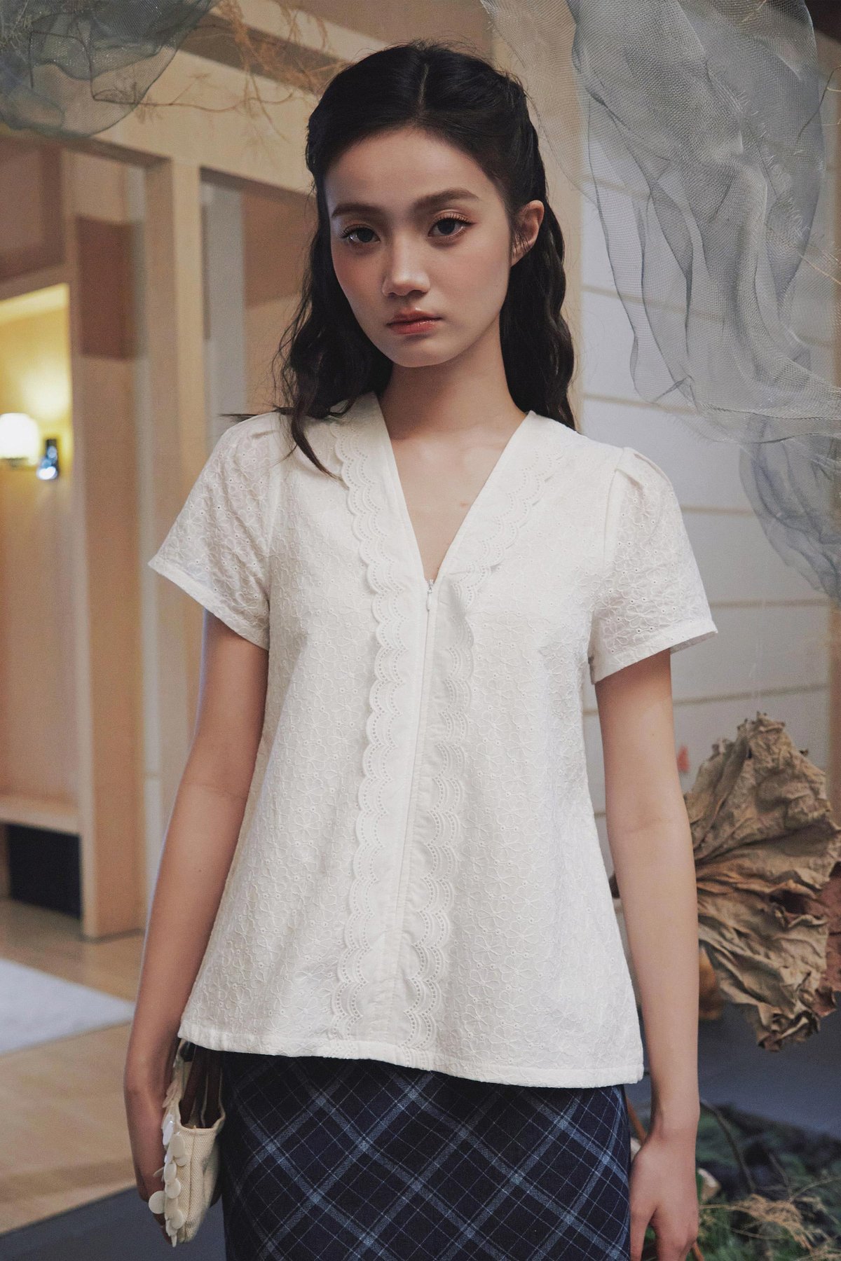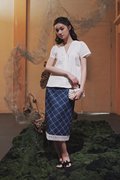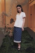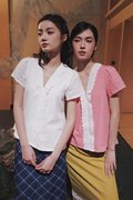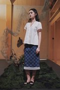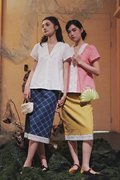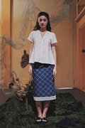 A short sleeve kebaya top designed with a lined bodice, double scallop trimmings at the neckline, a front concealed zipper, and an A-line silhouette.