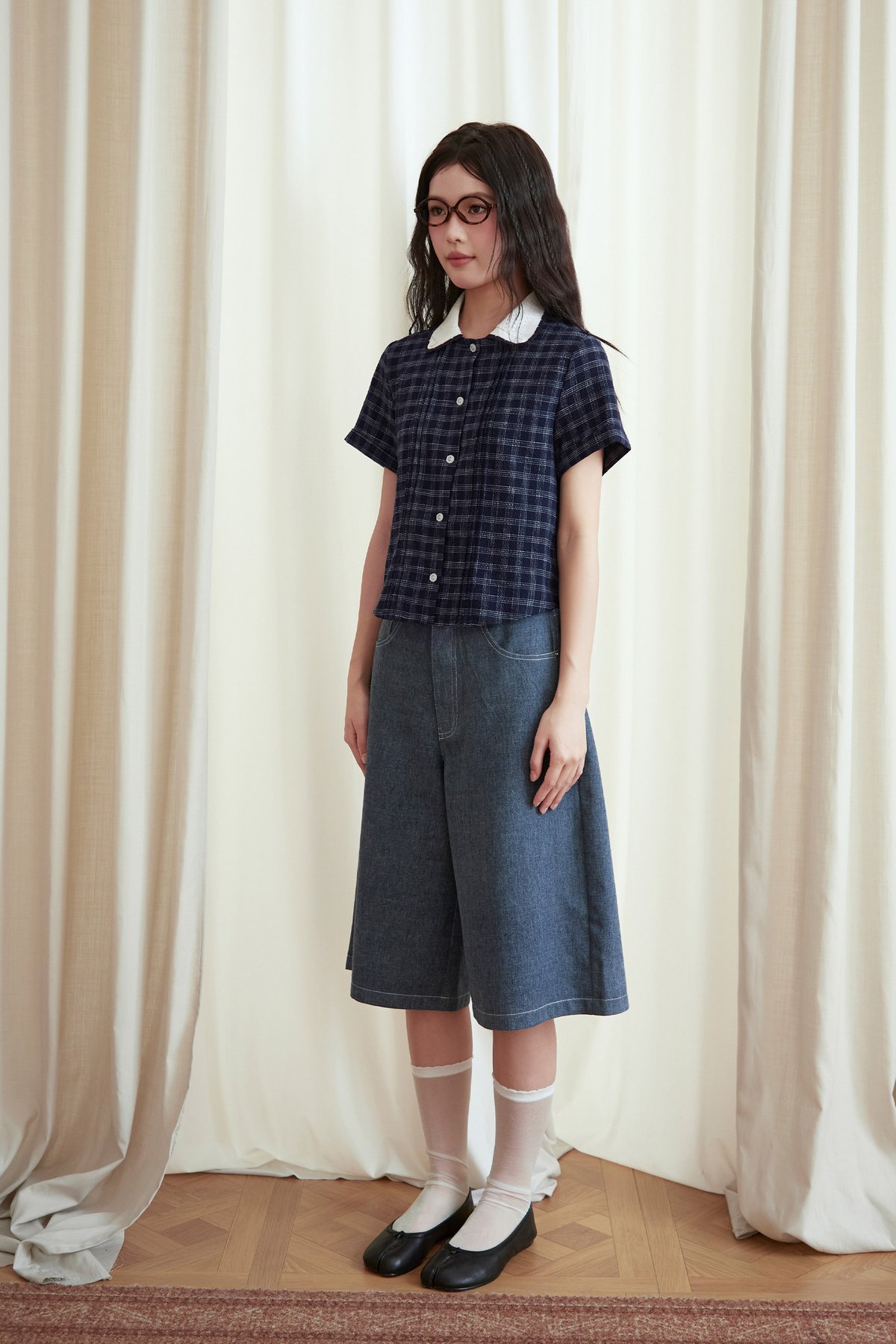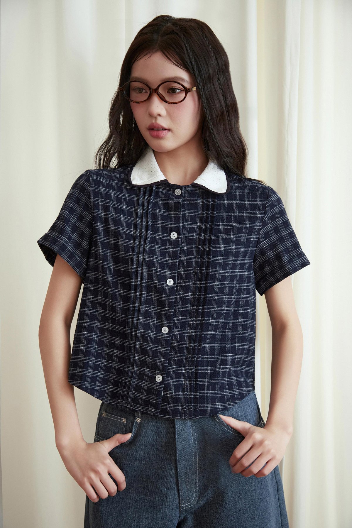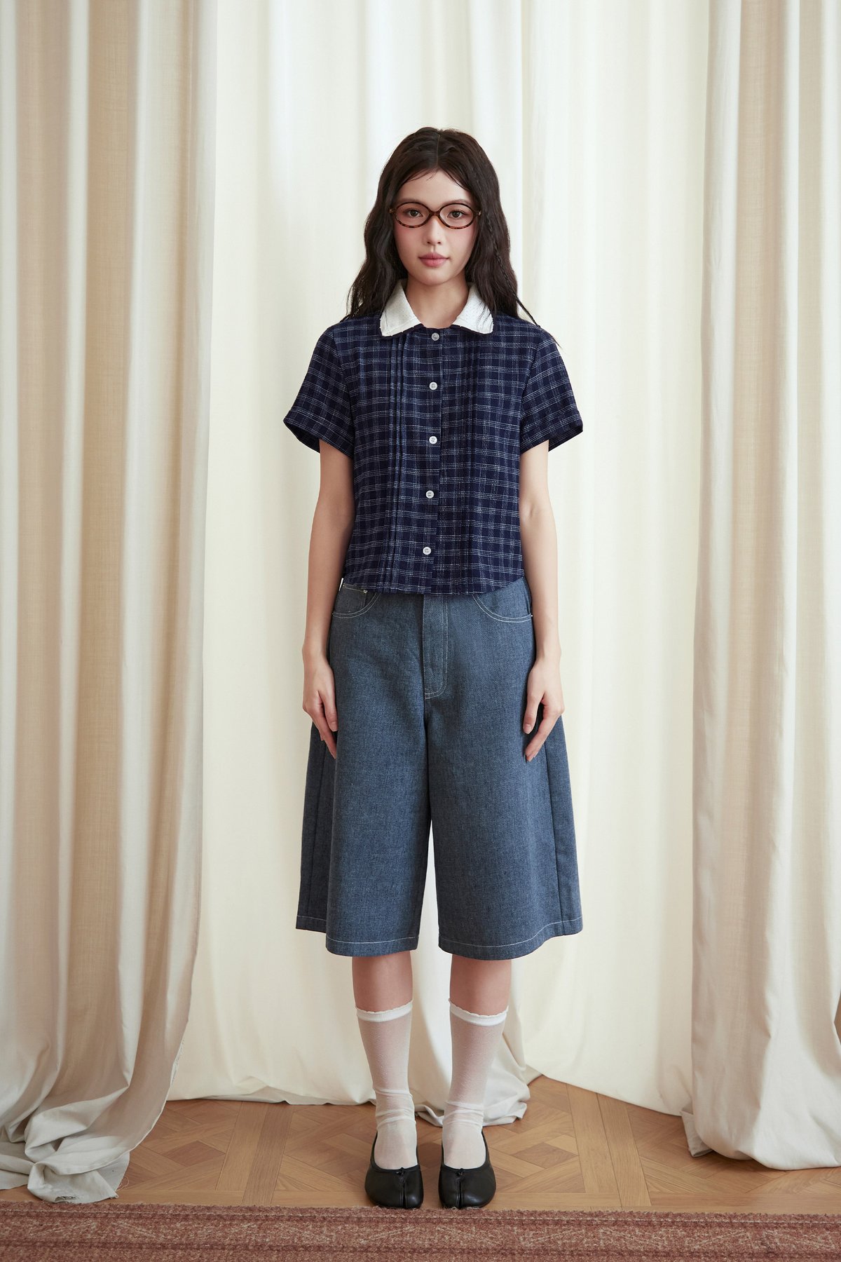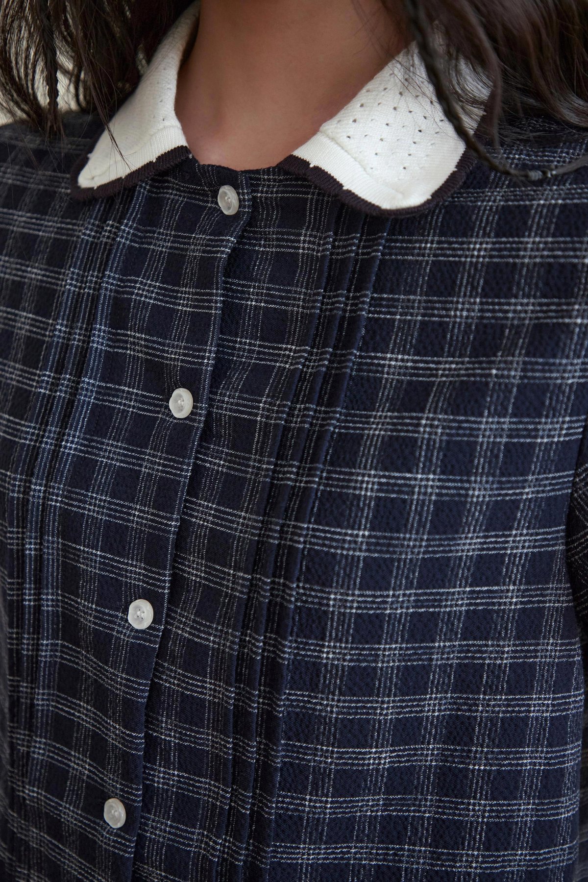 A slightly oversized shirt with contrast navy-edged collar, cuffed sleeves, front pintuck details, curved hem, and functional front buttons.