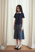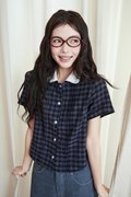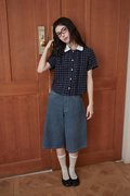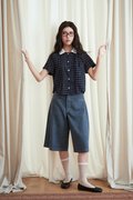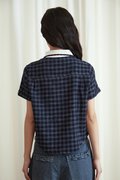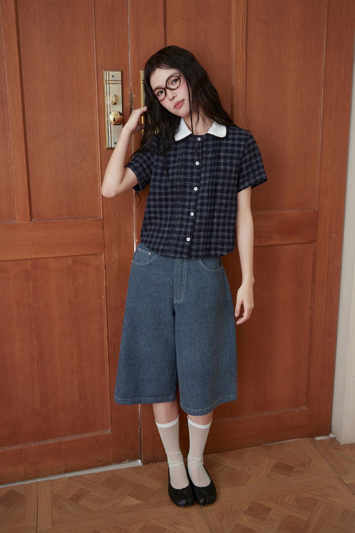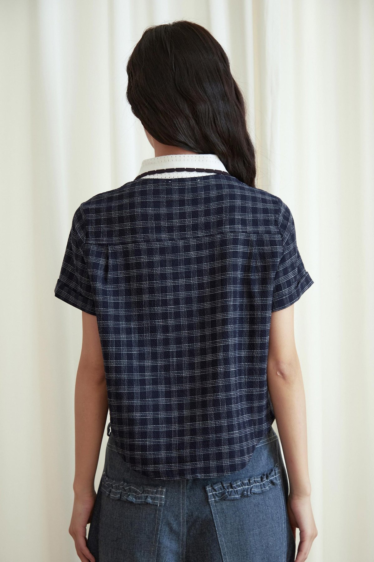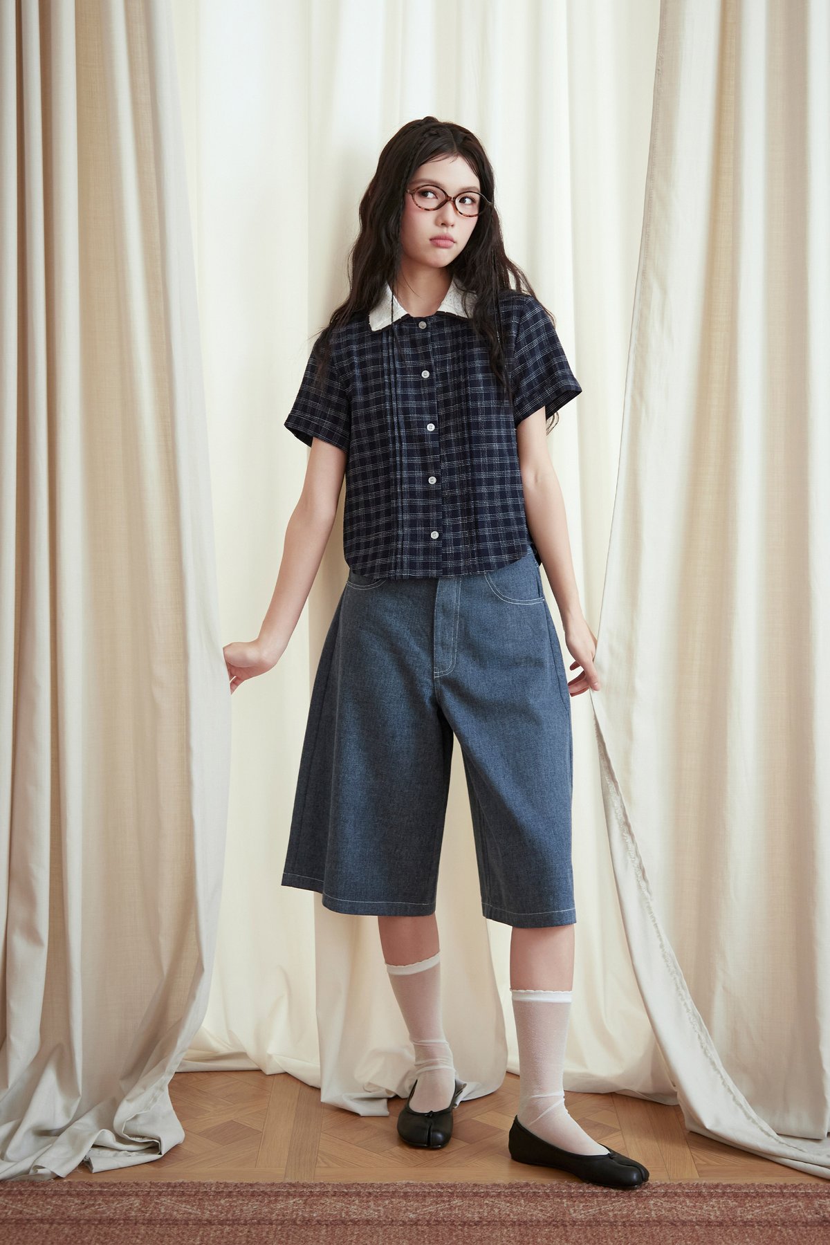 A slightly oversized shirt with contrast navy-edged collar, cuffed sleeves, front pintuck details, curved hem, and functional front buttons.