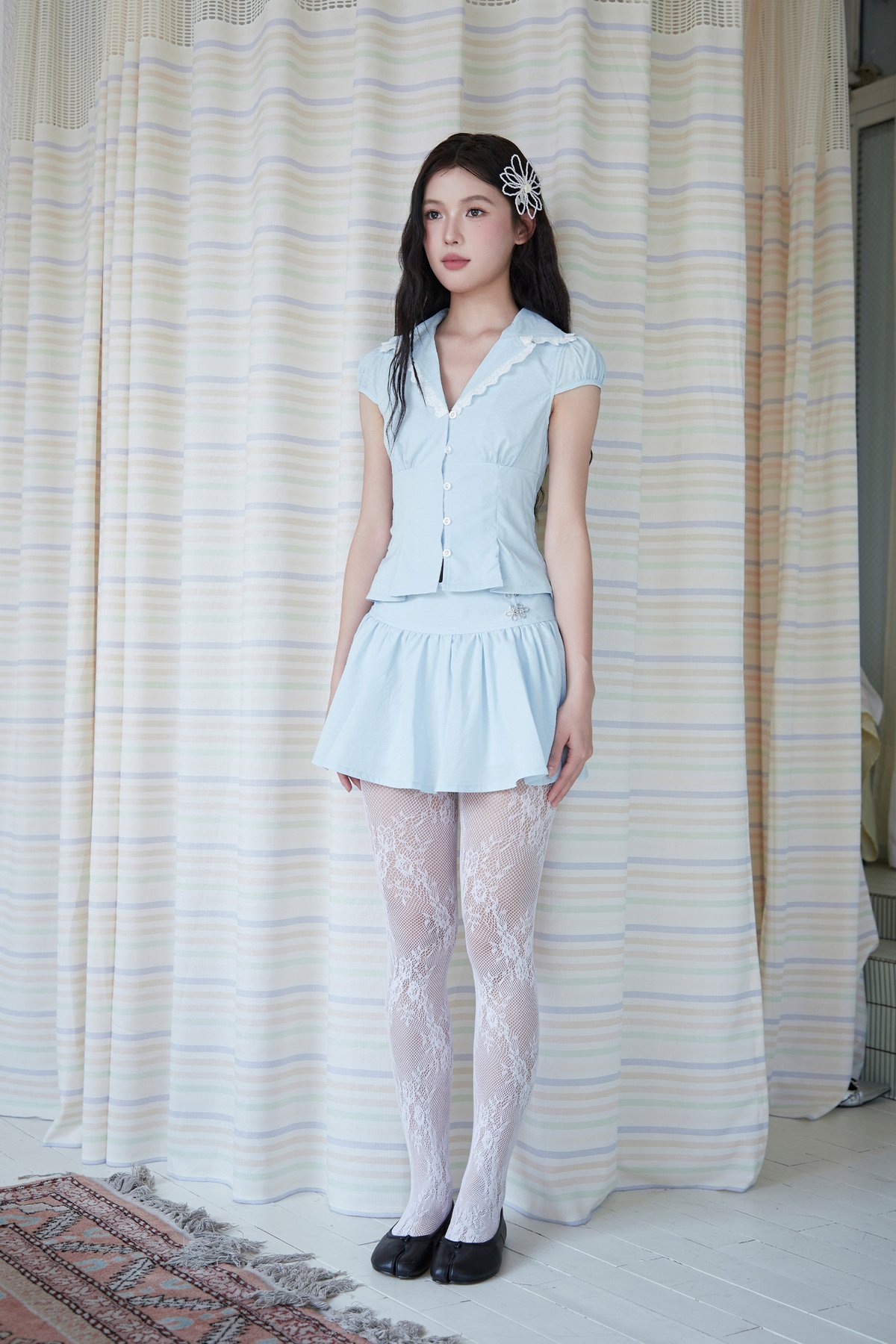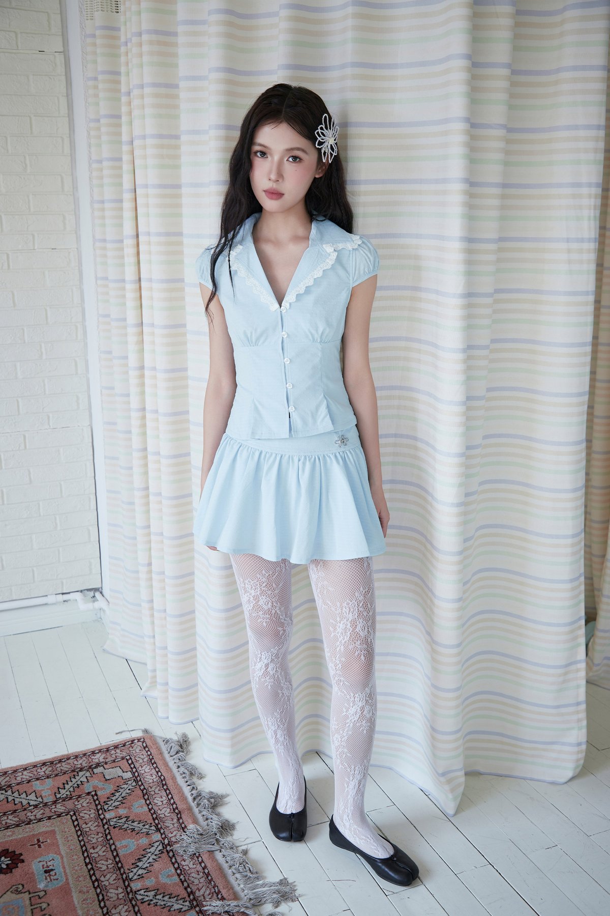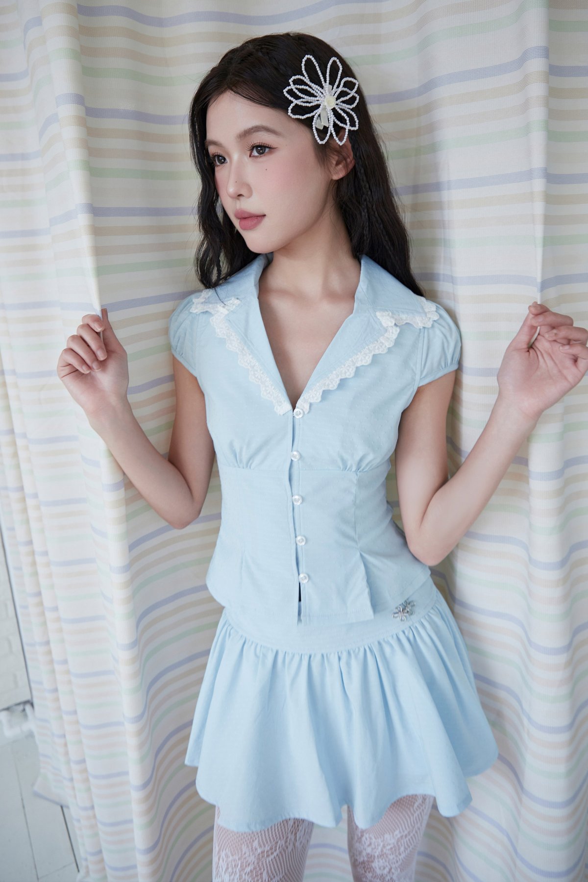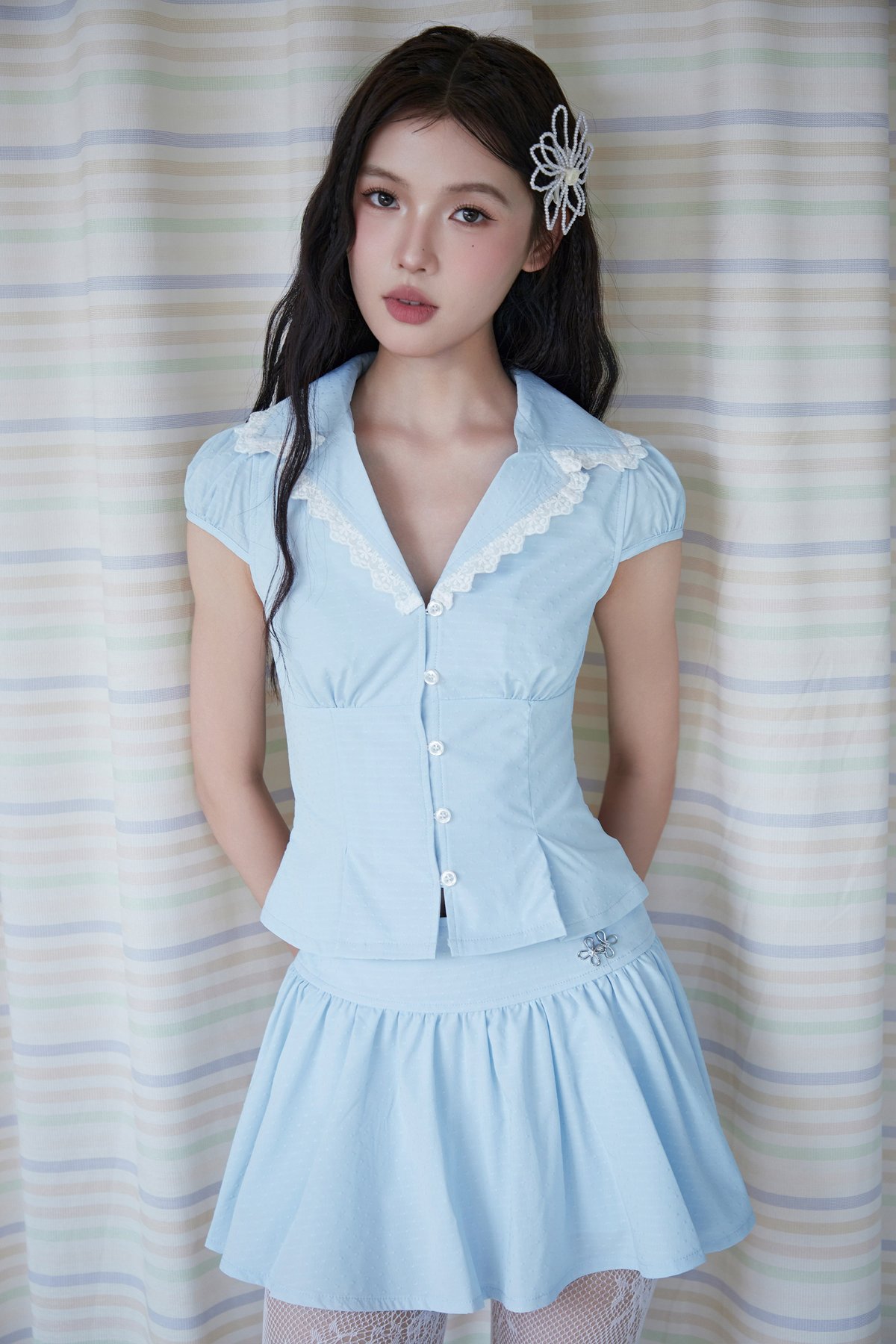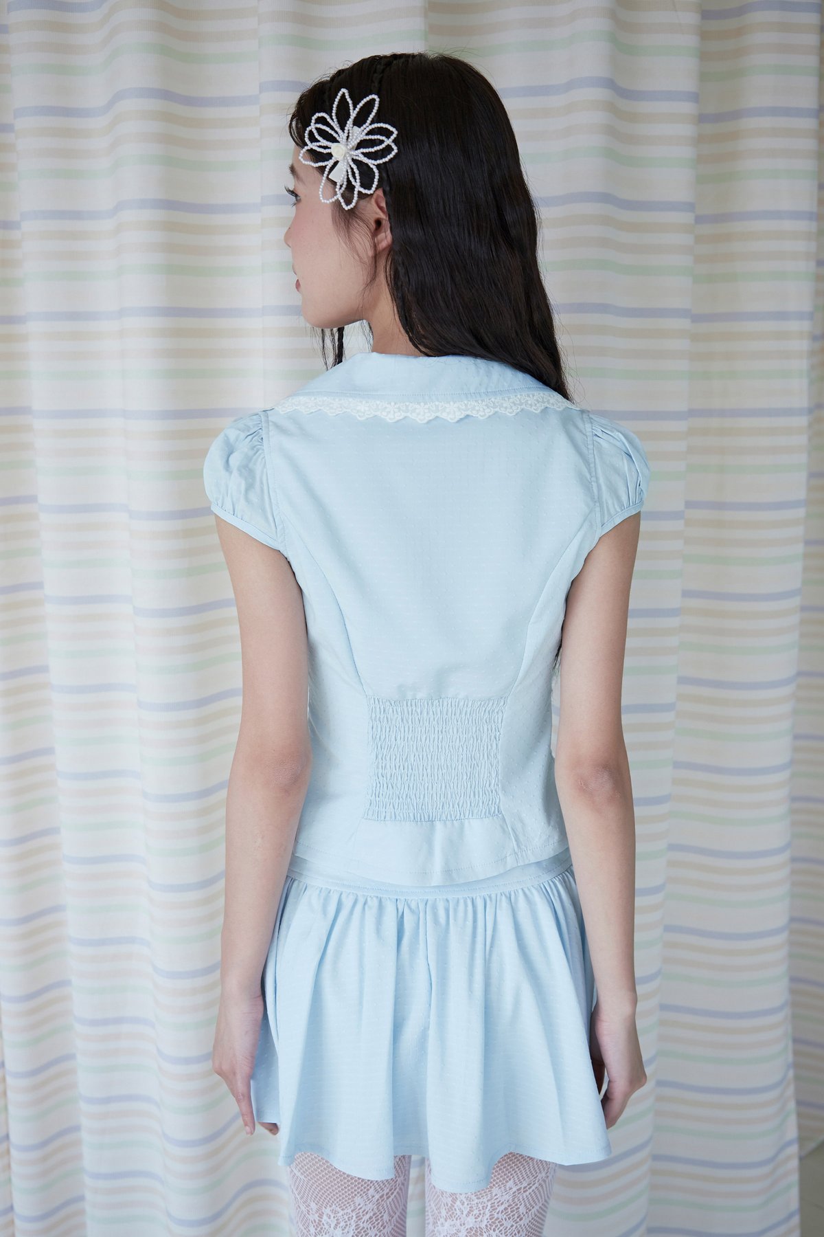 This blouse is styled with functional front buttons and a deep V-neckline, framed by delicate trimmings around the collar. It features cap sleeves without elastic, a smocked back for added comfort, and subtle pleated details near the hem for a soft finish.