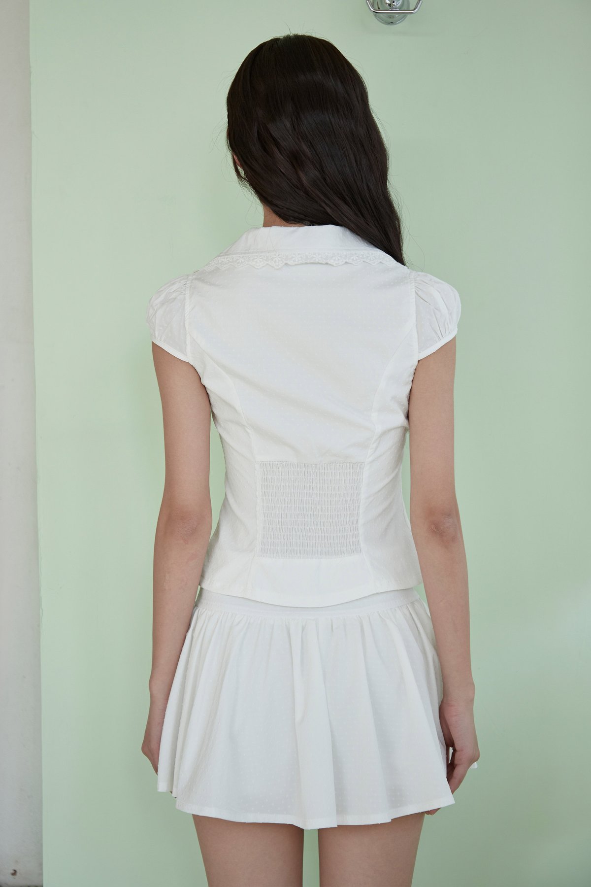 This blouse is styled with functional front buttons and a deep V-neckline, framed by delicate trimmings around the collar. It features cap sleeves without elastic, a smocked back for added comfort, and subtle pleated details near the hem for a soft finish.