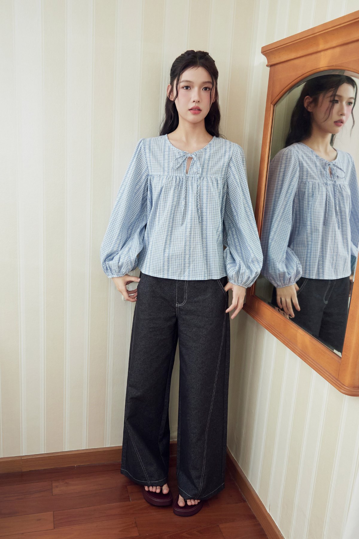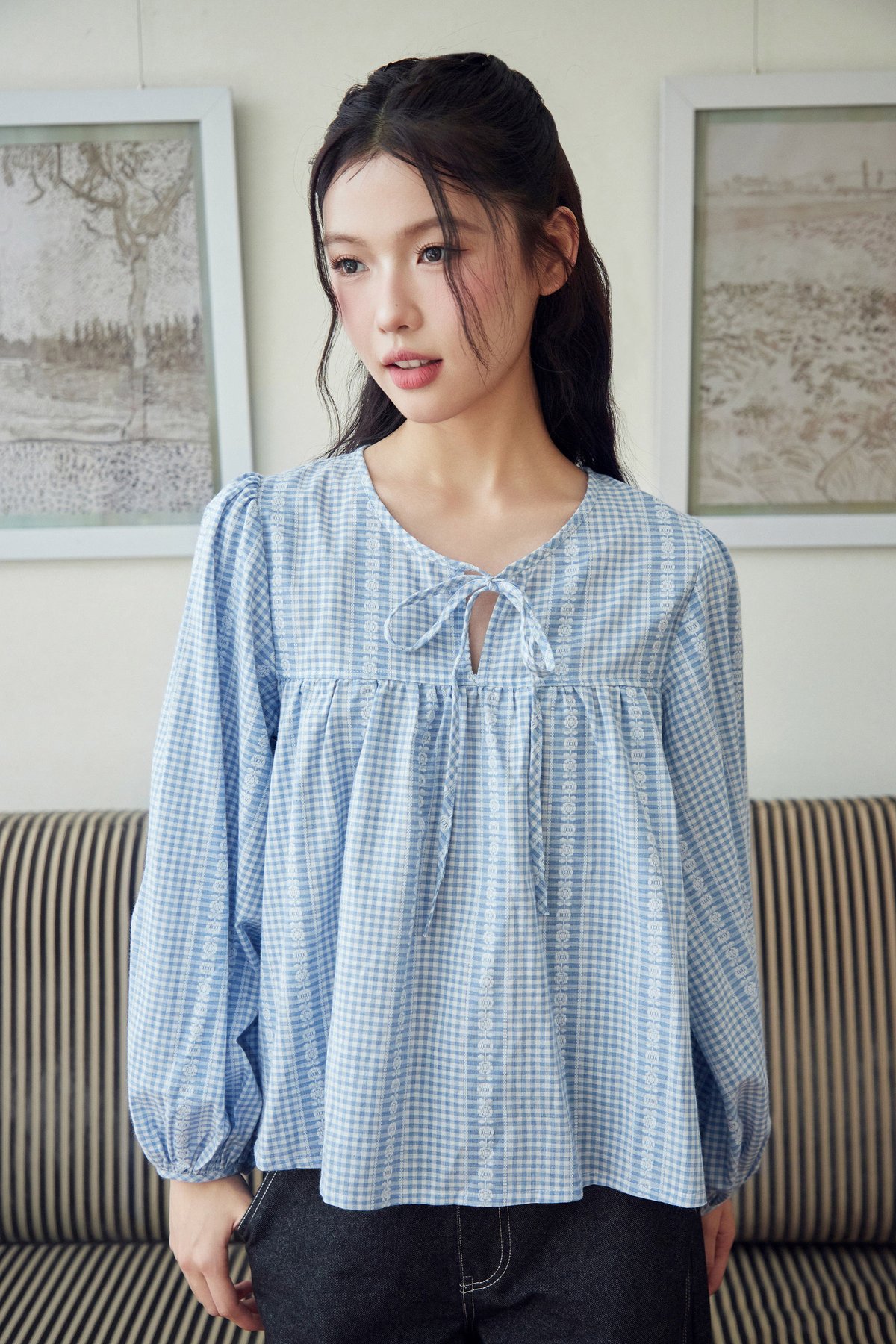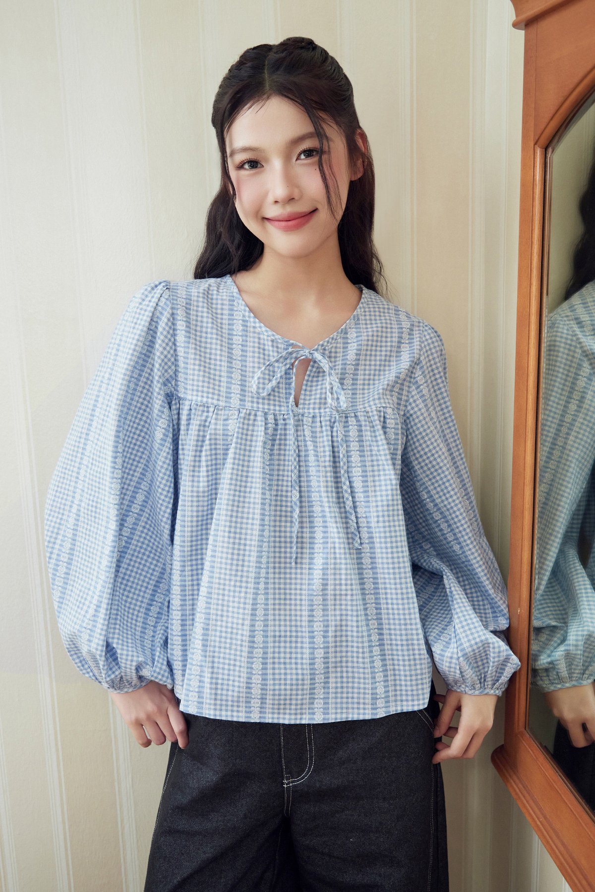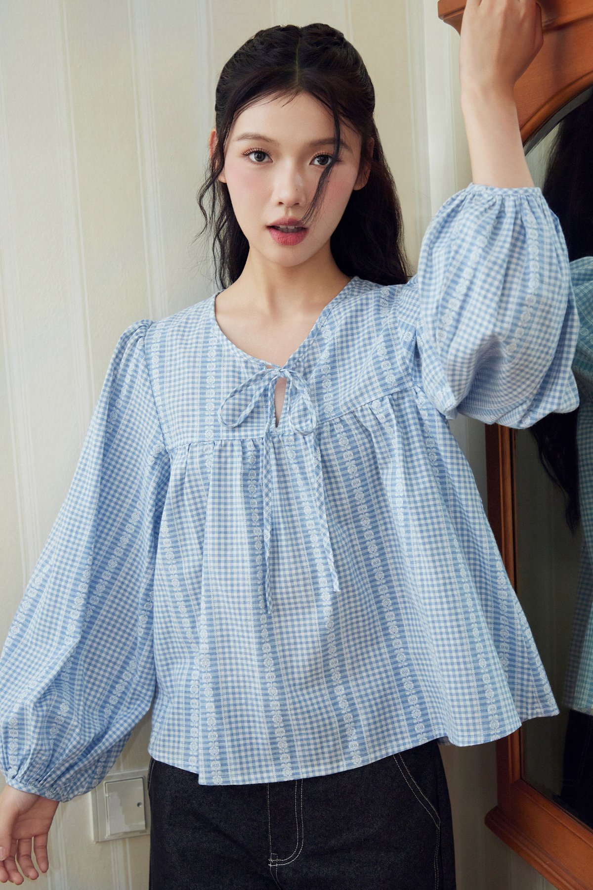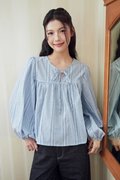 Meet Addison Sister, Bennie! A balloon sleeve blouse with adjustable front ribbon tie.