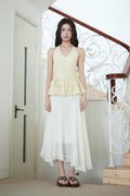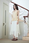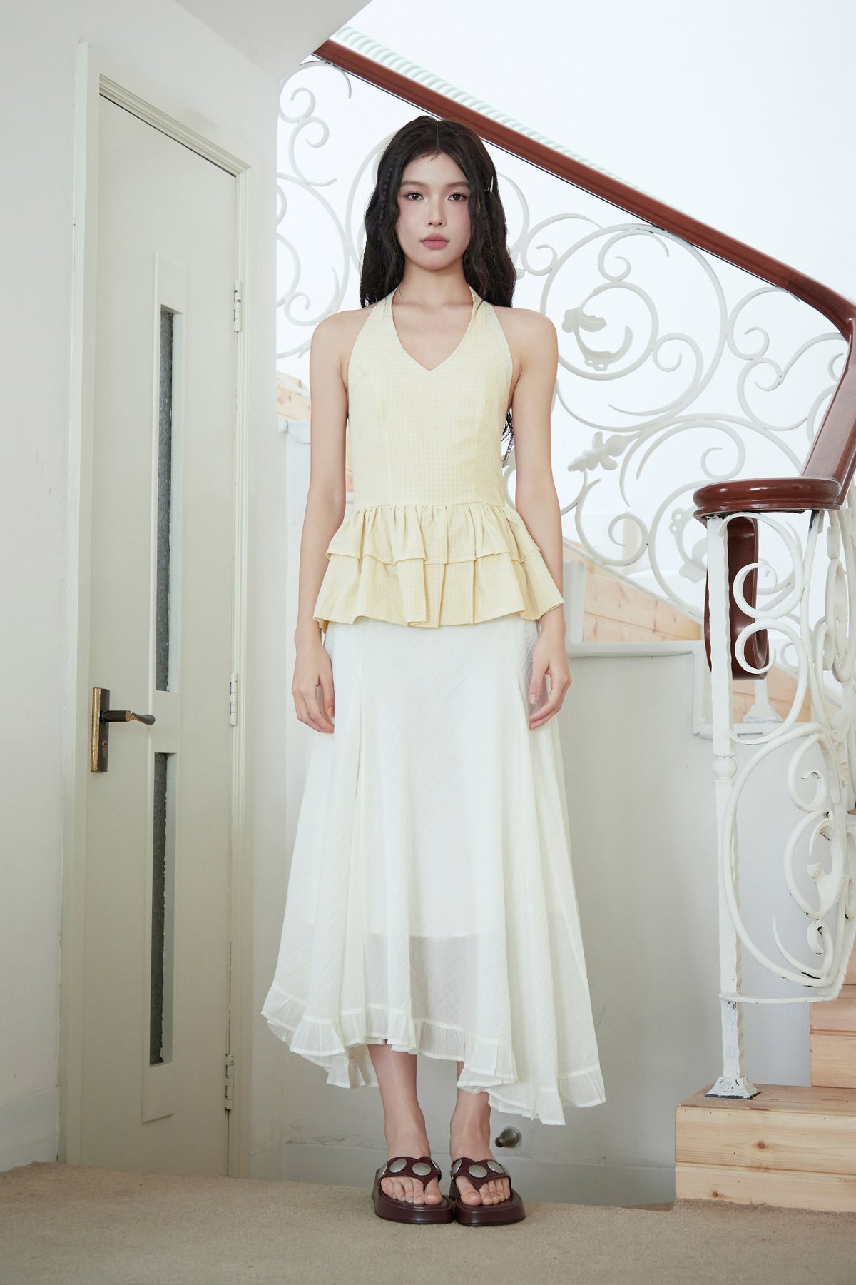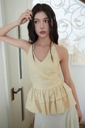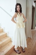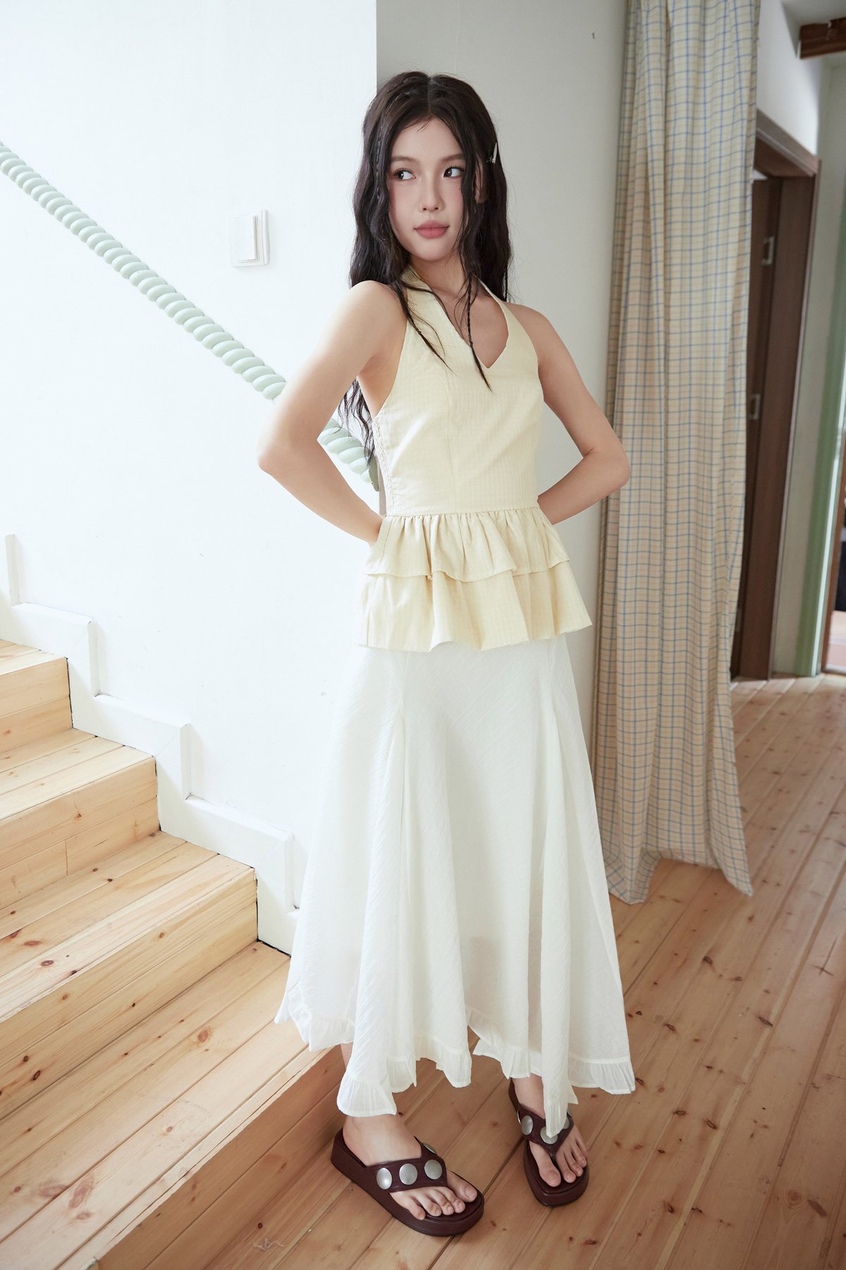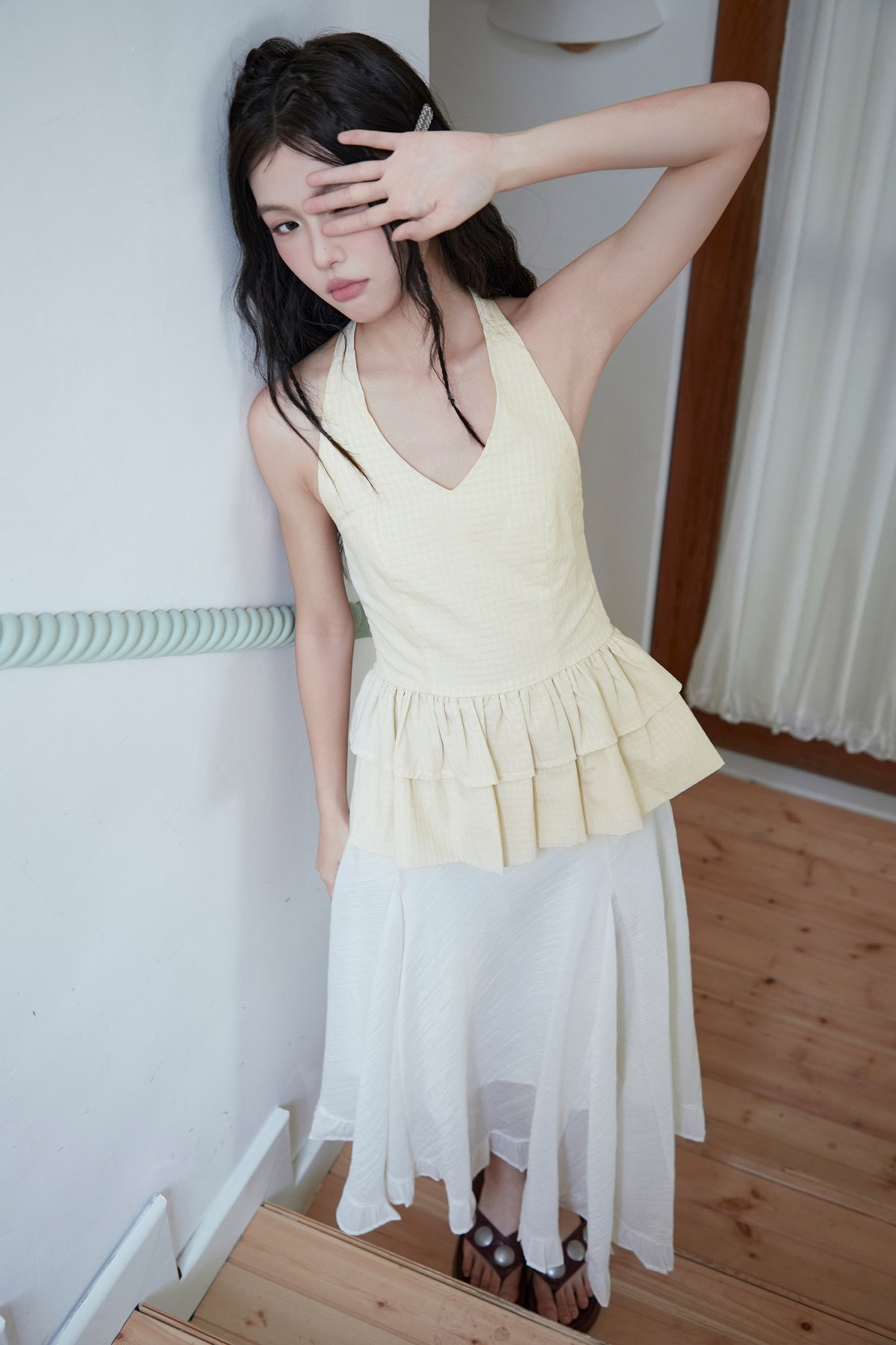 A halter top featuring an adjustable ribbon tie, double-tiered peplum design, lined bodice, and smocked back for comfort. Easy slip-on style.