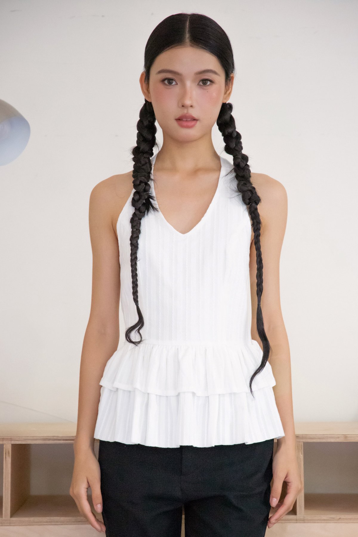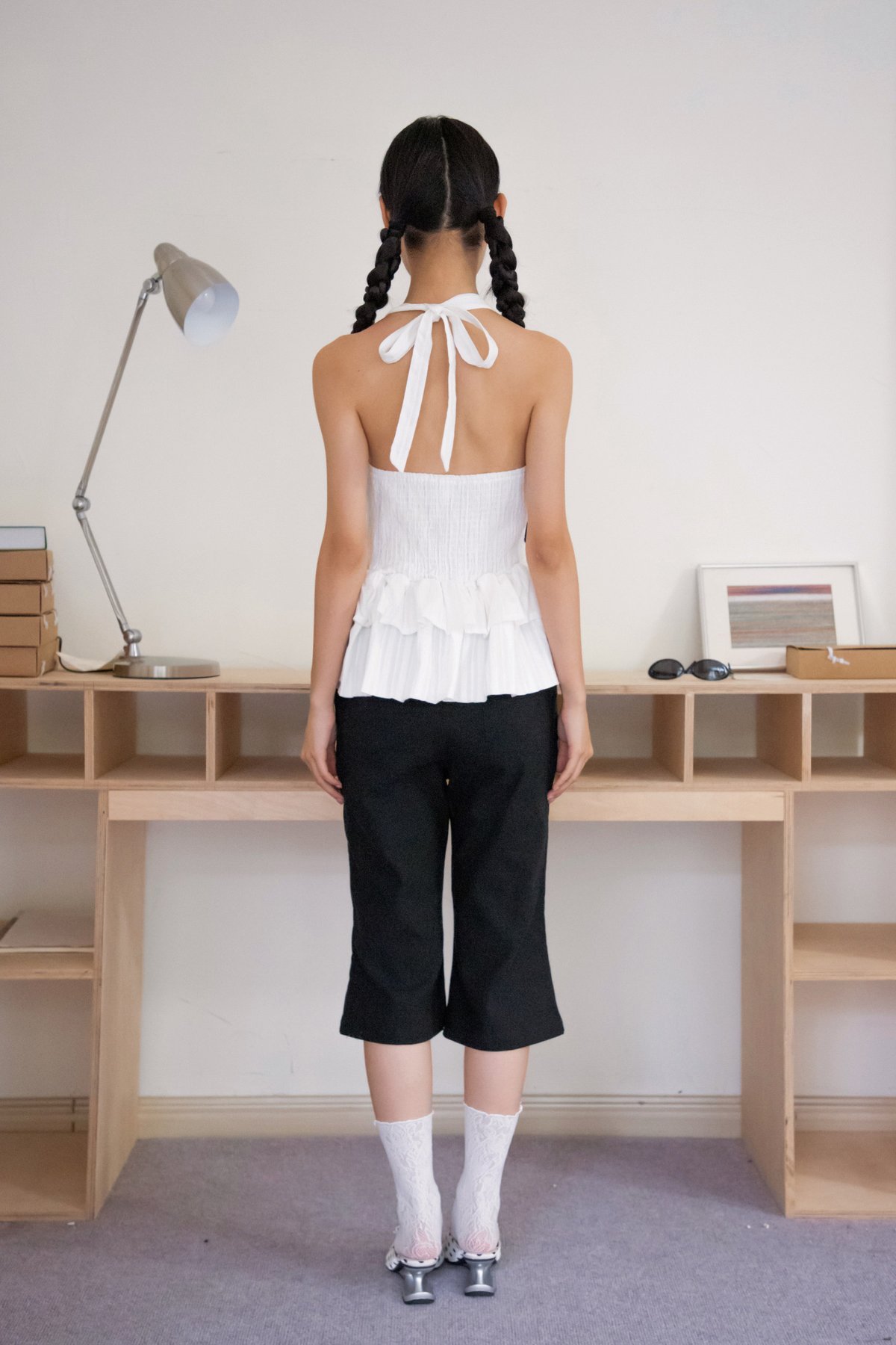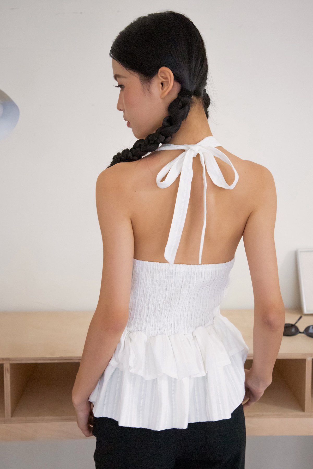 A halter top featuring an adjustable ribbon tie, double-tiered peplum design, lined bodice, and smocked back for comfort. Easy slip-on style.