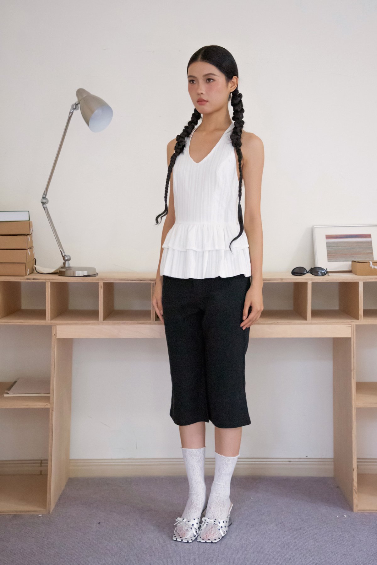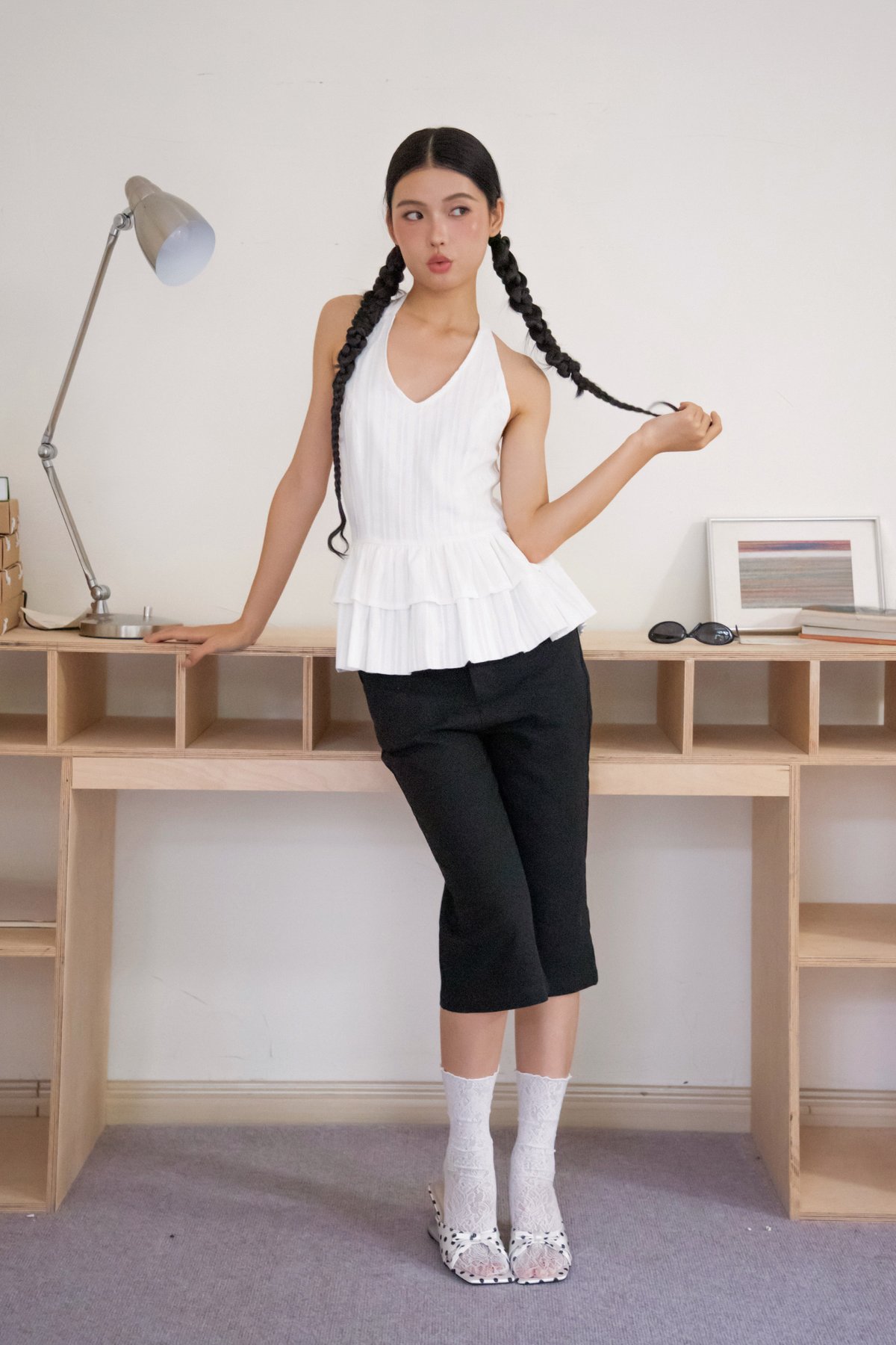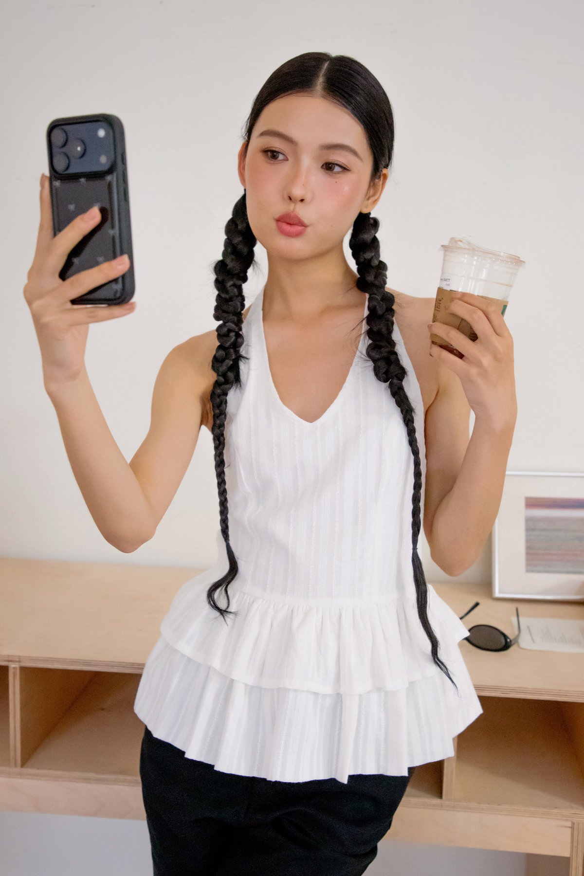 A halter top featuring an adjustable ribbon tie, double-tiered peplum design, lined bodice, and smocked back for comfort. Easy slip-on style.