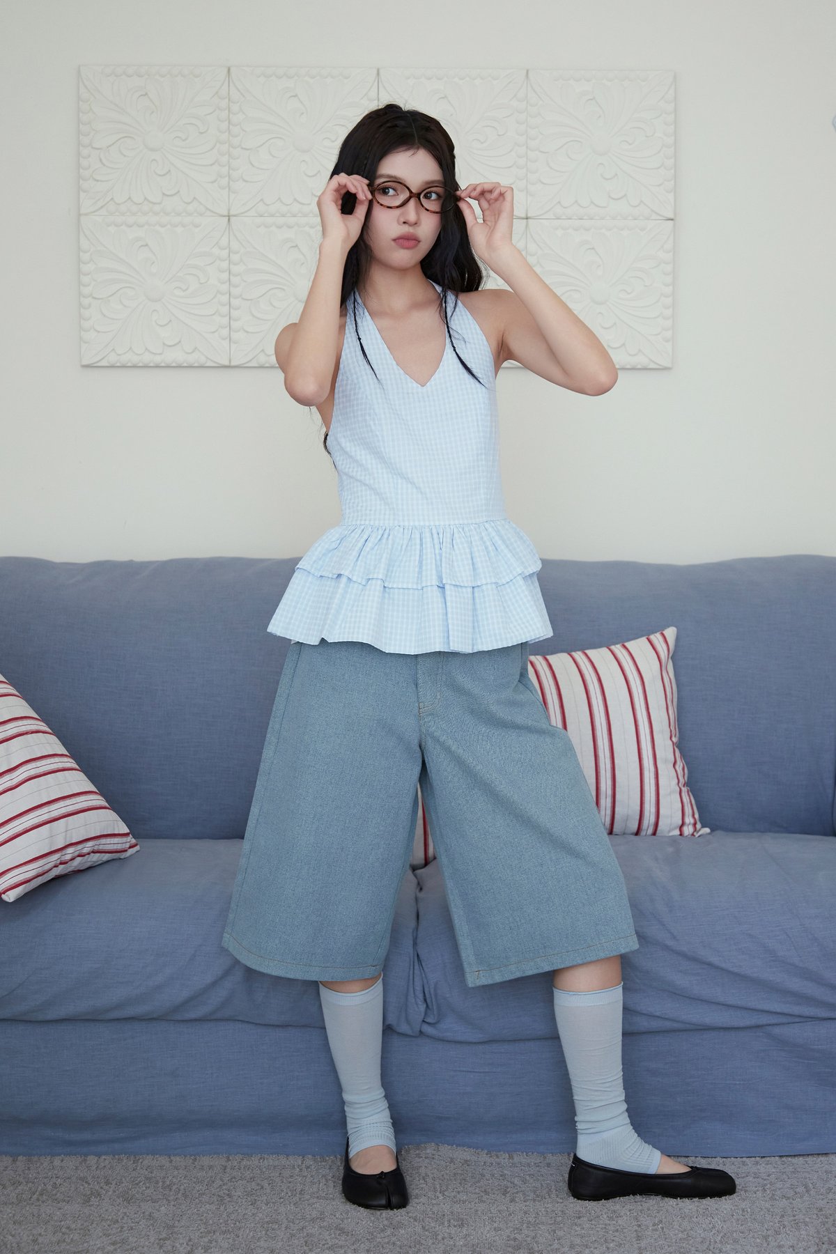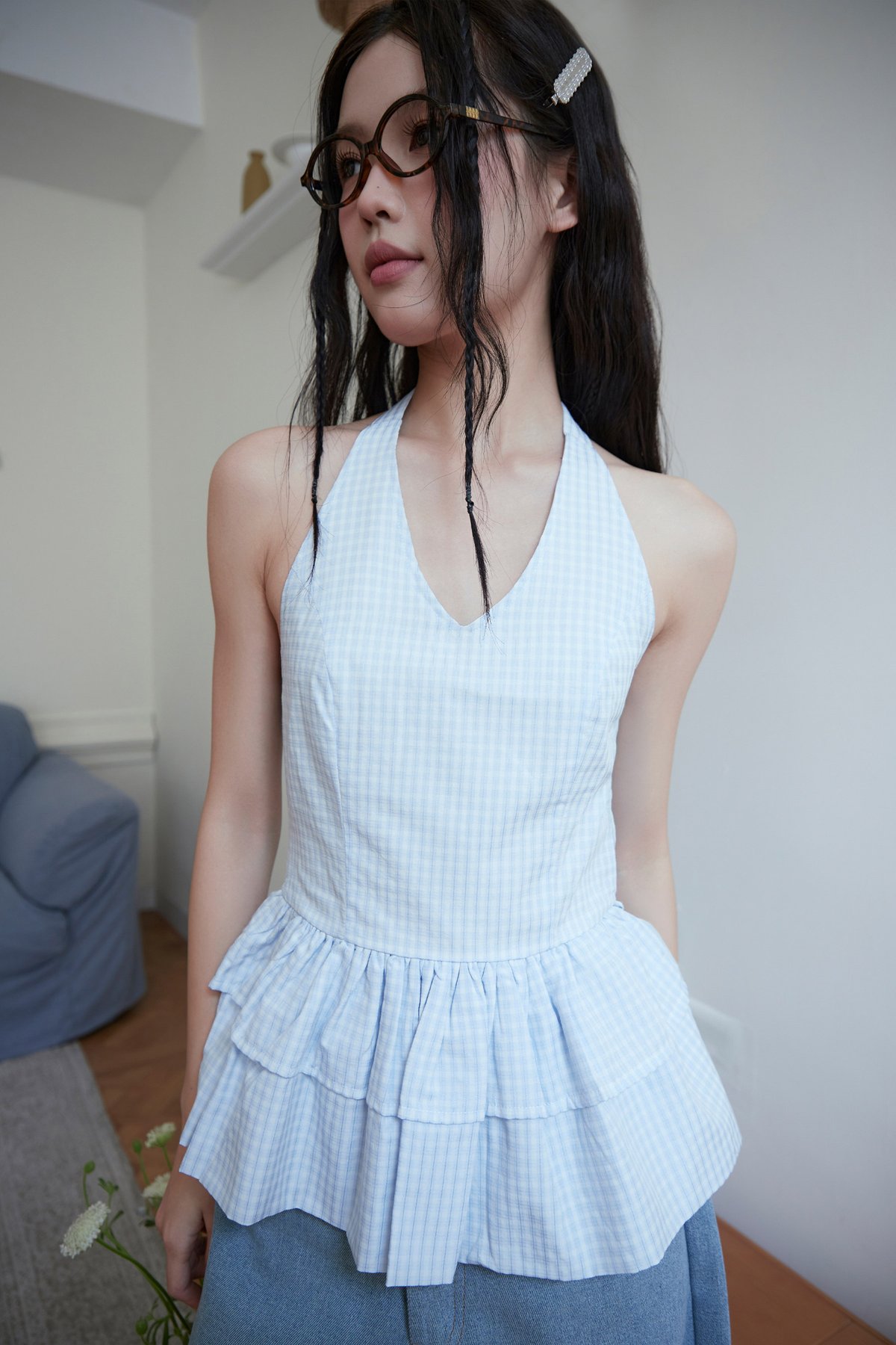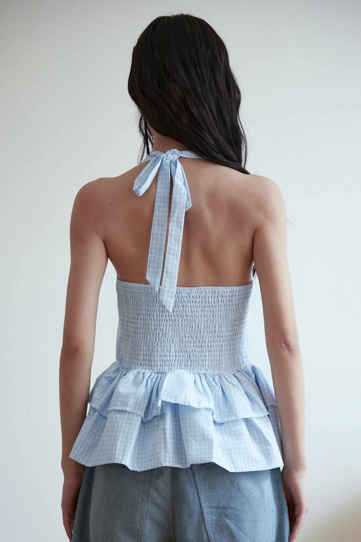 A halter top featuring an adjustable ribbon tie, double-tiered peplum design, lined bodice, and smocked back for comfort. Easy slip-on style.