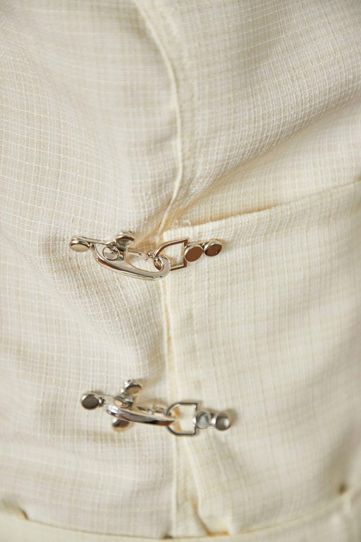 Designed with light puff sleeves and a statement metal buckle detail, finished with a back concealed zipper for a clean, structured fit.
