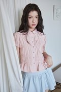 A modern twist on the classic blouse featuring a Peter Pan collar, cap sleeves with gathered hems, a button-down front and contour-enhancing elastic at the waist and bust.