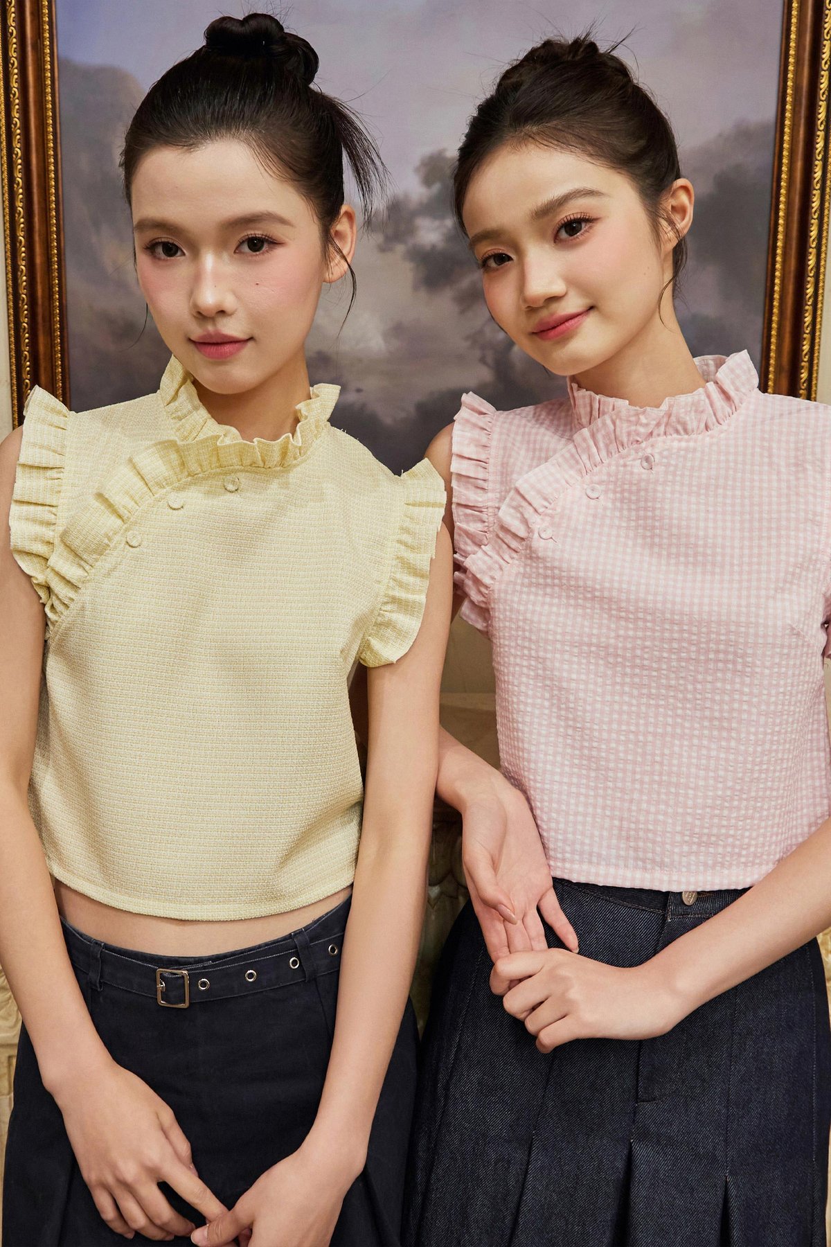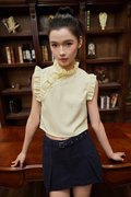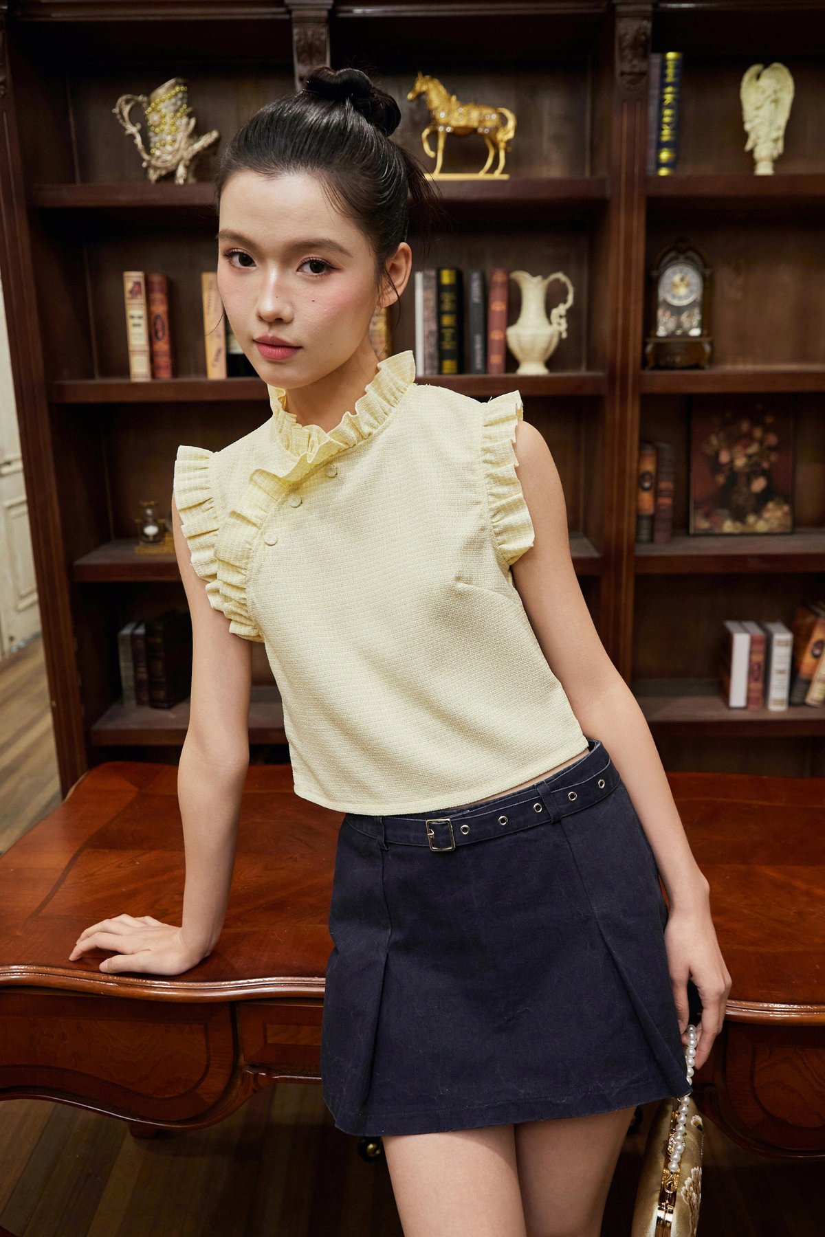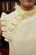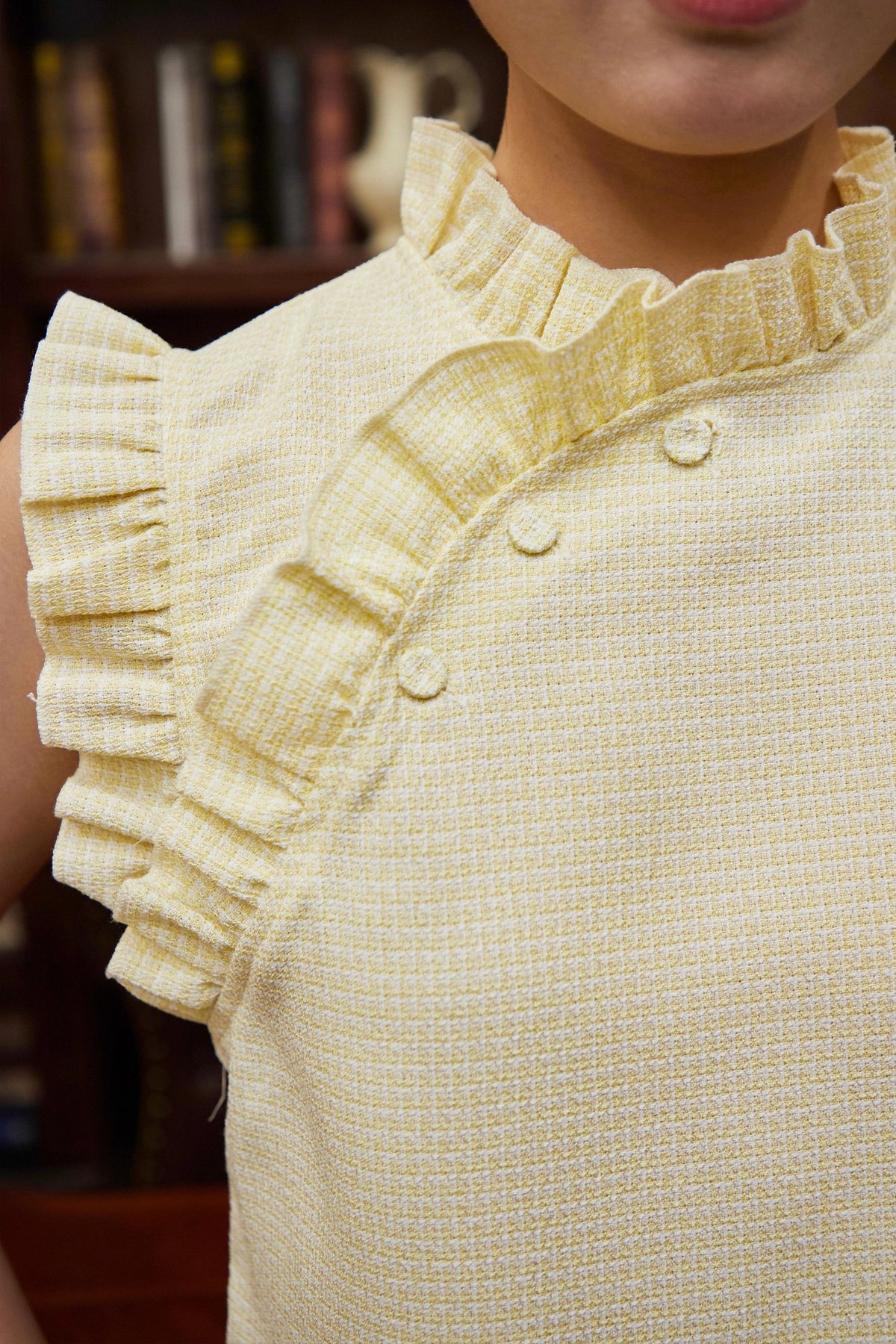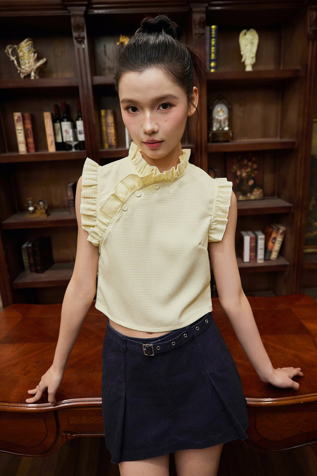 A top featuring ruffled details at the sleeves, collar, and neckline, finished with asymmetrical buttons and a back concealed zipper.