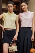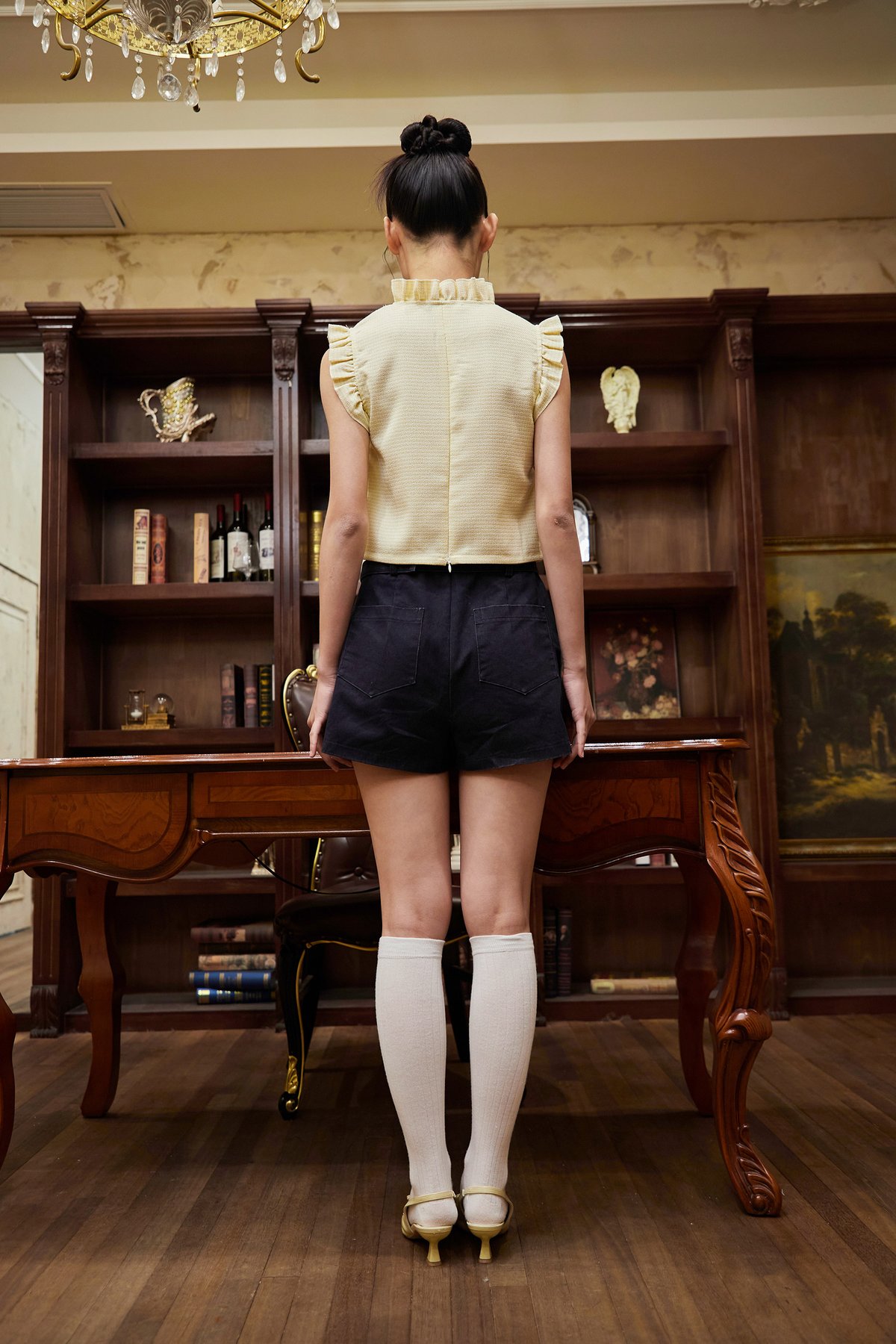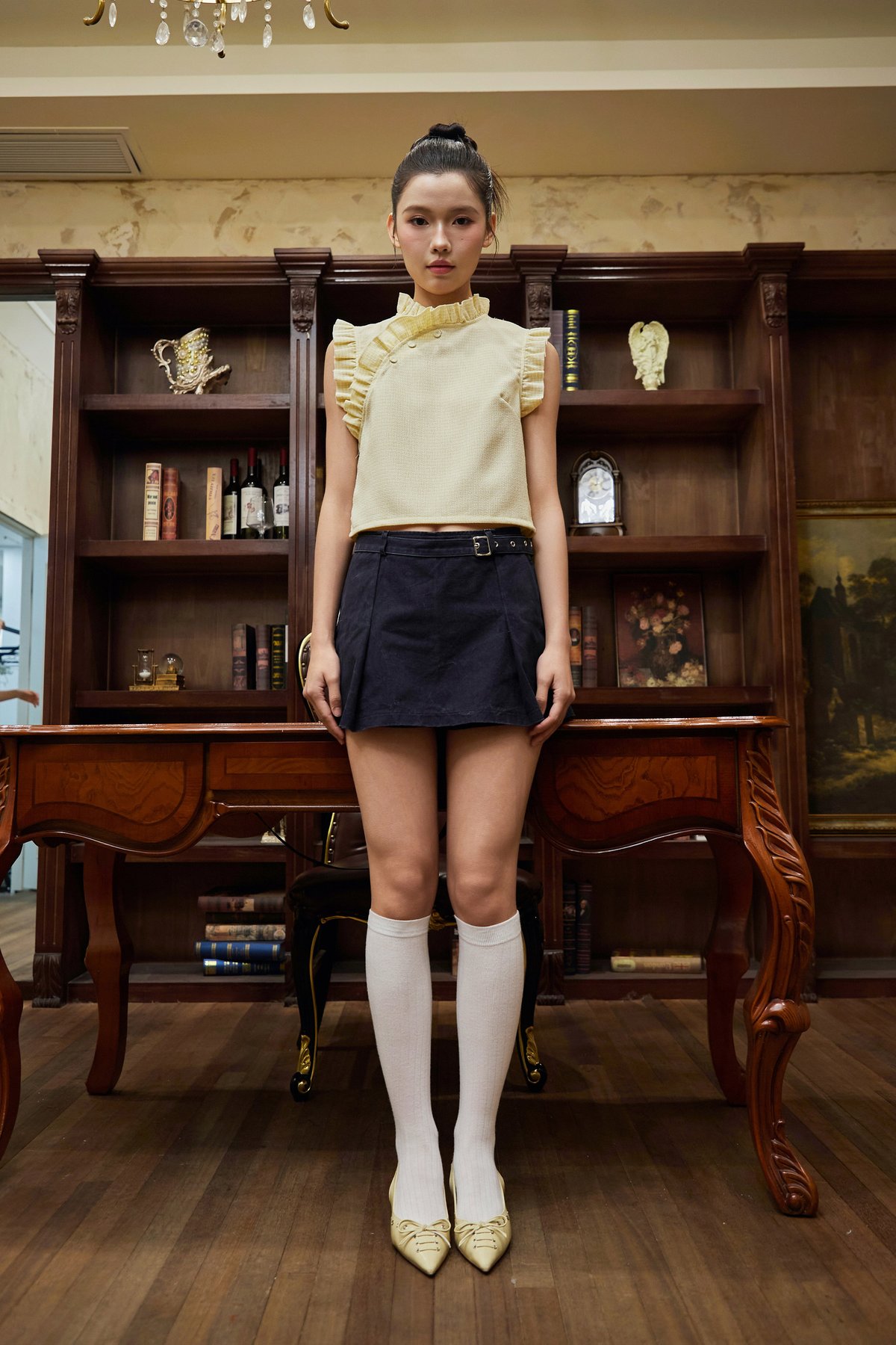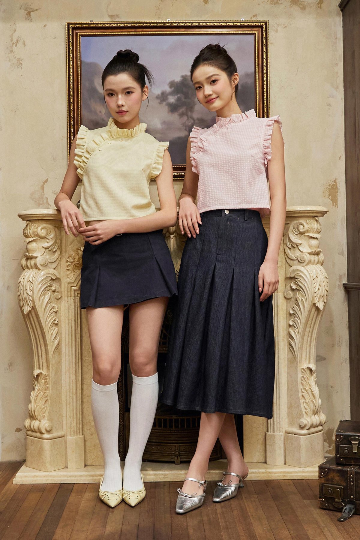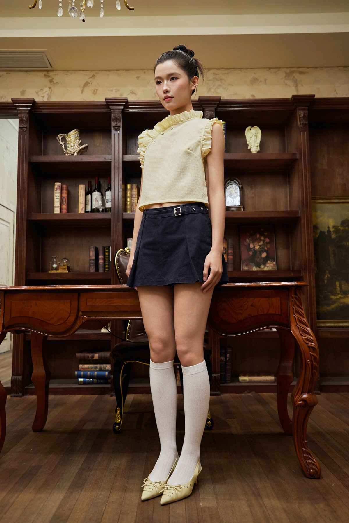 A top featuring ruffled details at the sleeves, collar, and neckline, finished with asymmetrical buttons and a back concealed zipper.