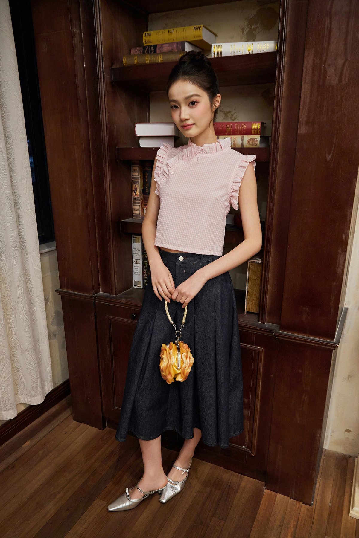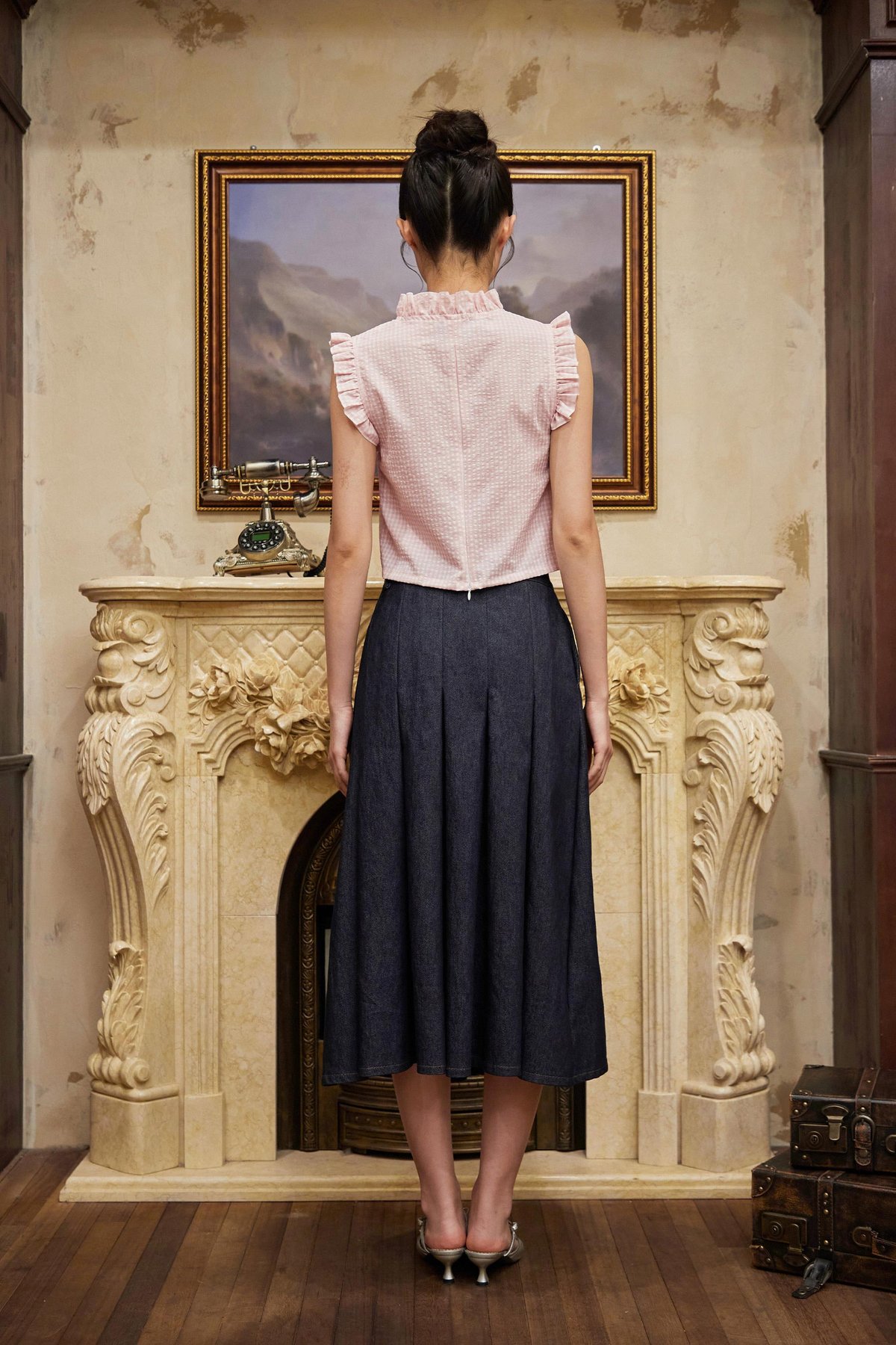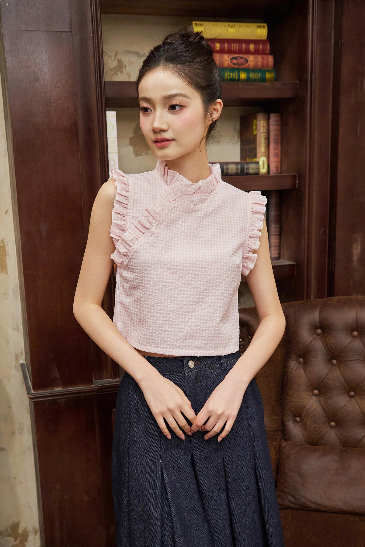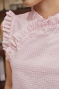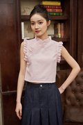 A top featuring ruffled details at the sleeves, collar, and neckline, finished with asymmetrical buttons and a back concealed zipper.