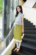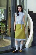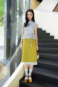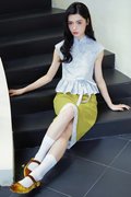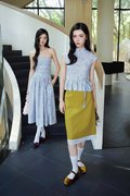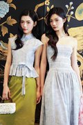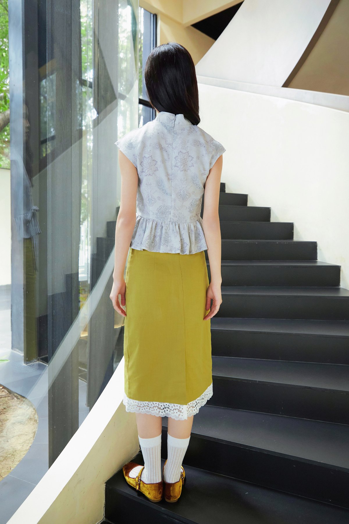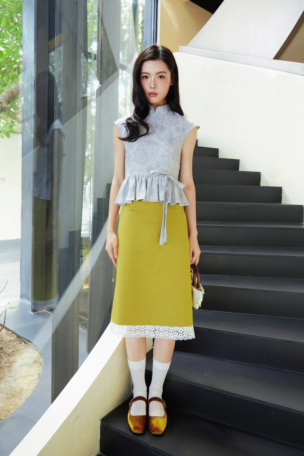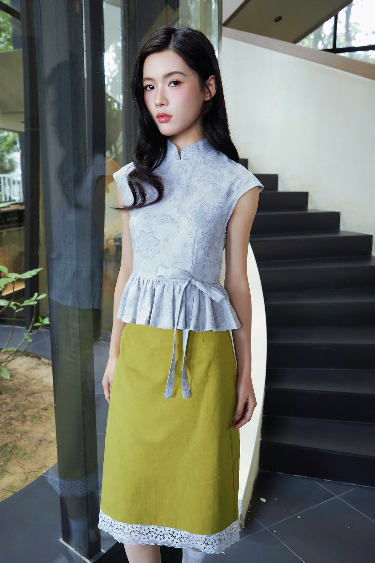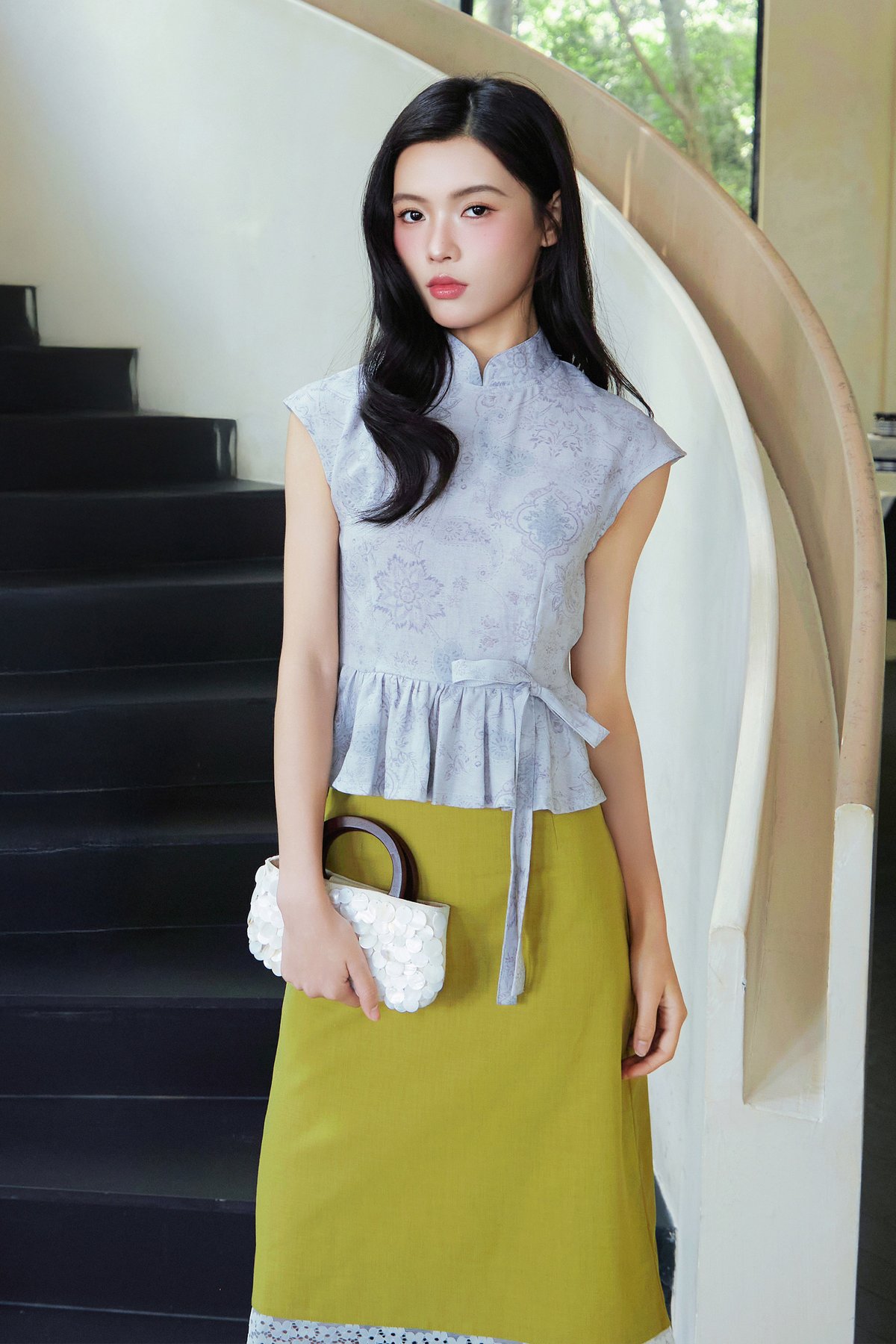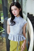 A top with a Chinese stand collar, peplum silhouette, back concealed zipper, and a faux ribbon detail at the front waist.