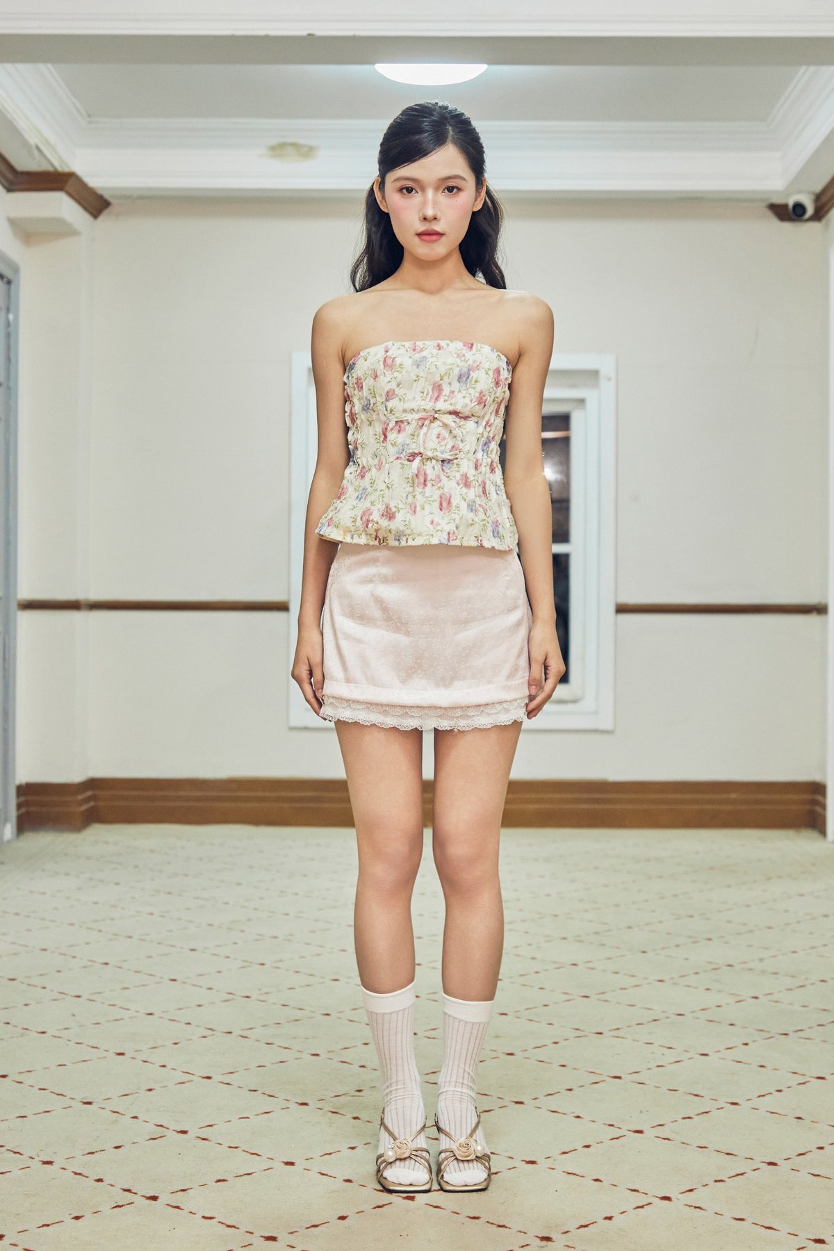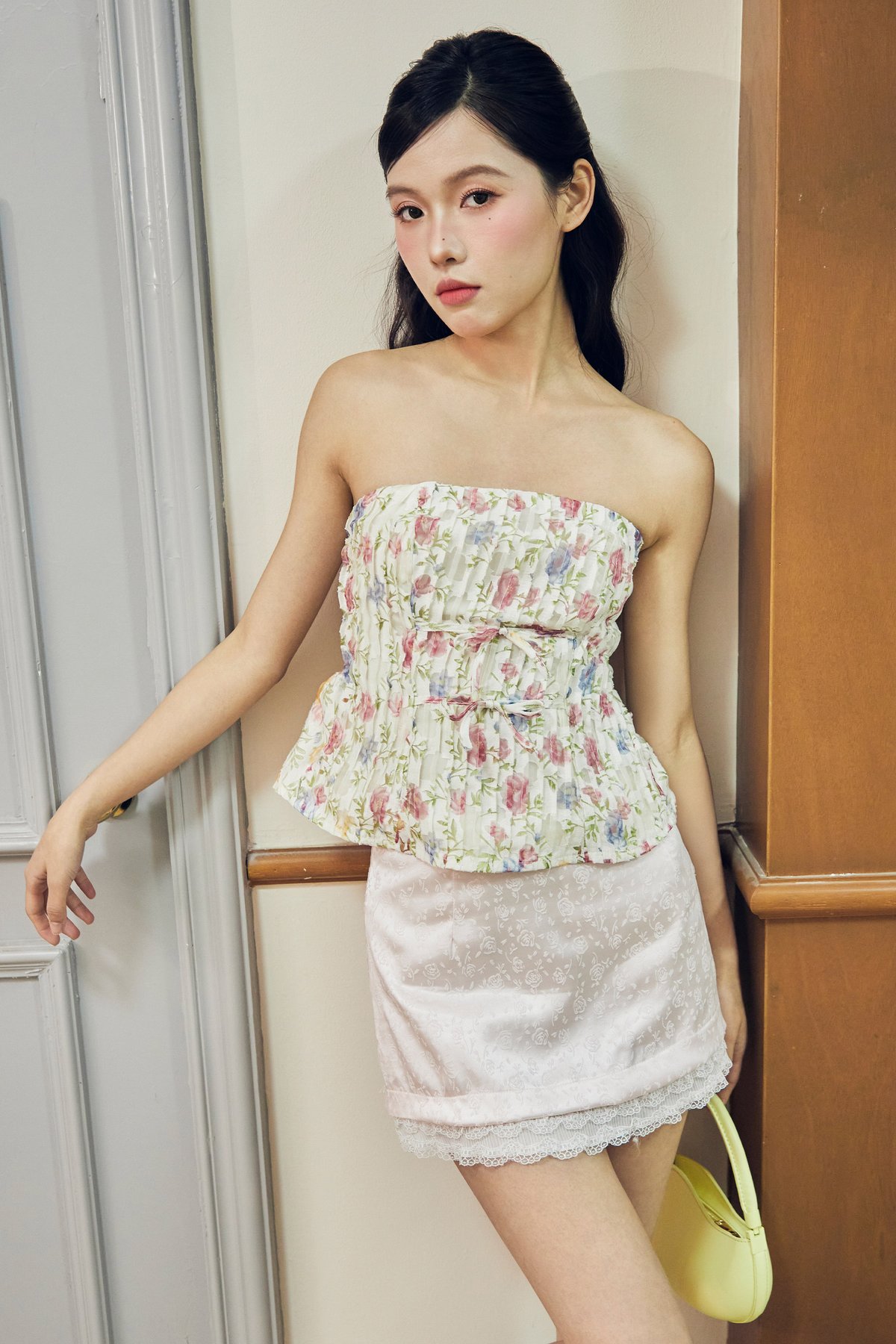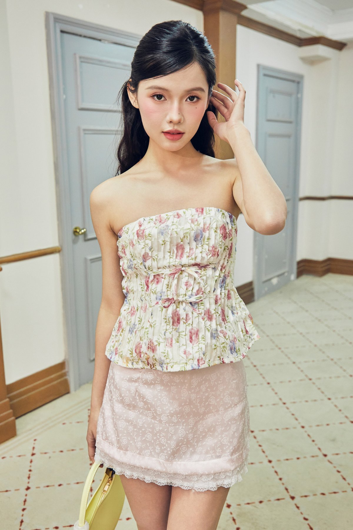 This tube top features two faux front ribbon details and a fully pleated front. Designed with a smocked back for comfort and flexibility, it is finished with a concealed zipper at the back for a clean, structured fit.