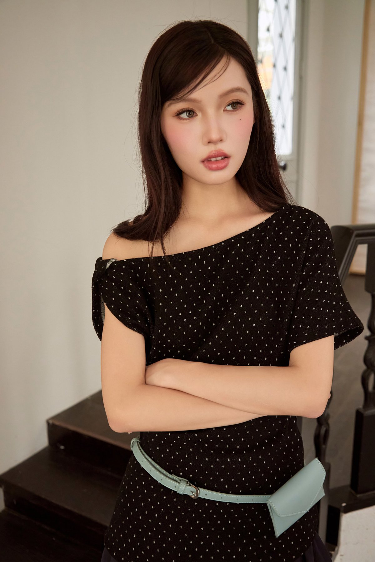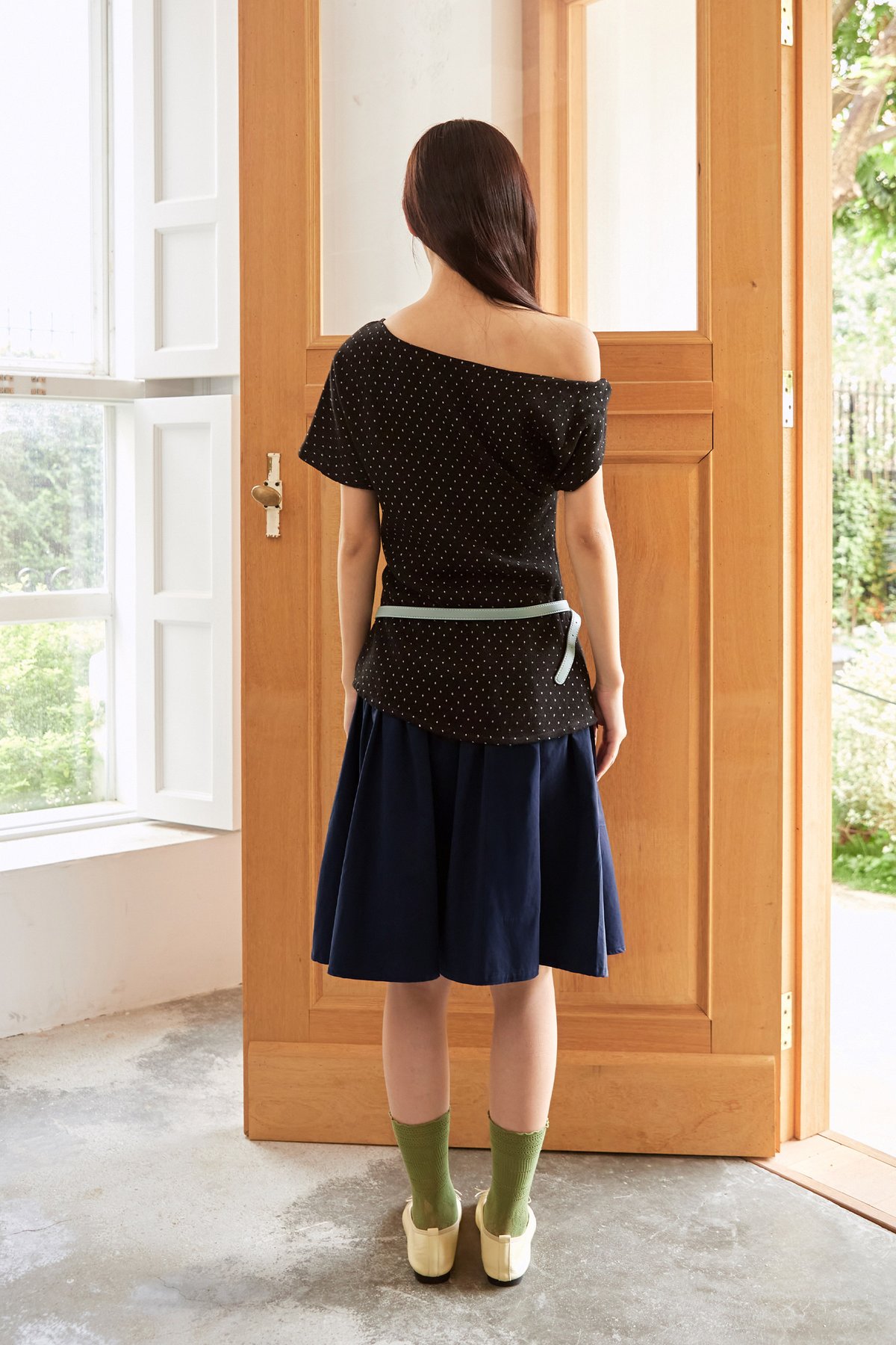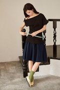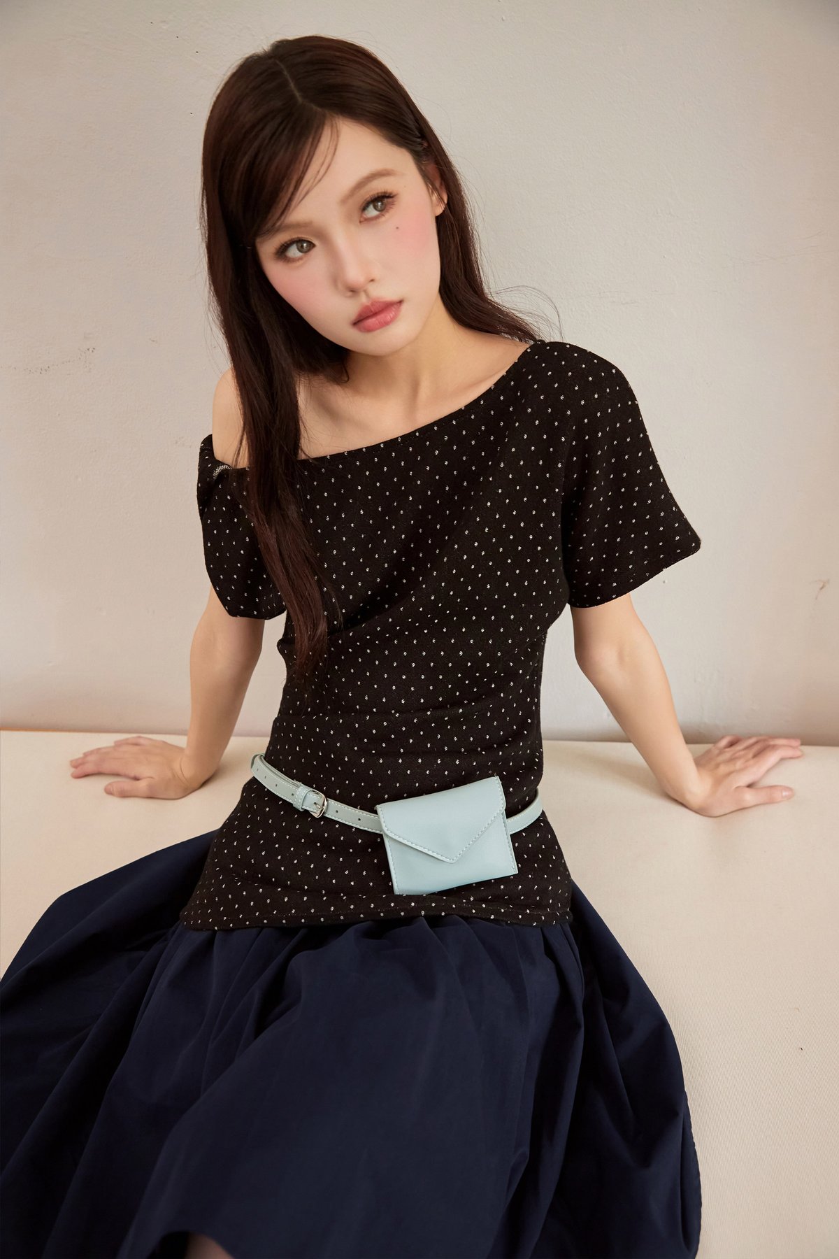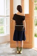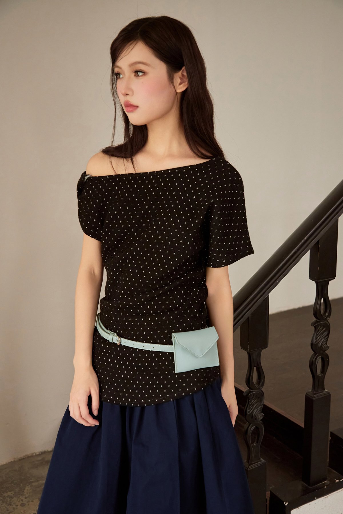 A top with an asymmetrical toga neckline and a side sleeve knot detail.