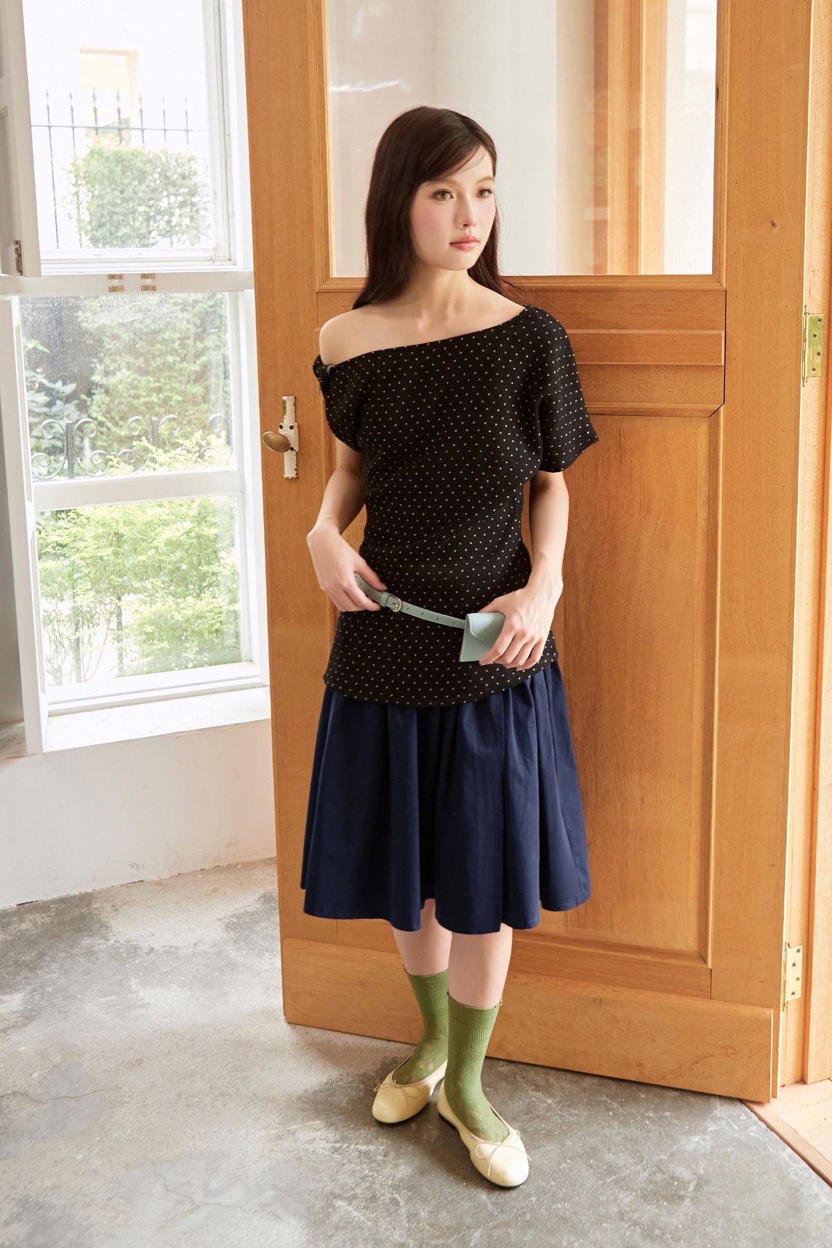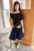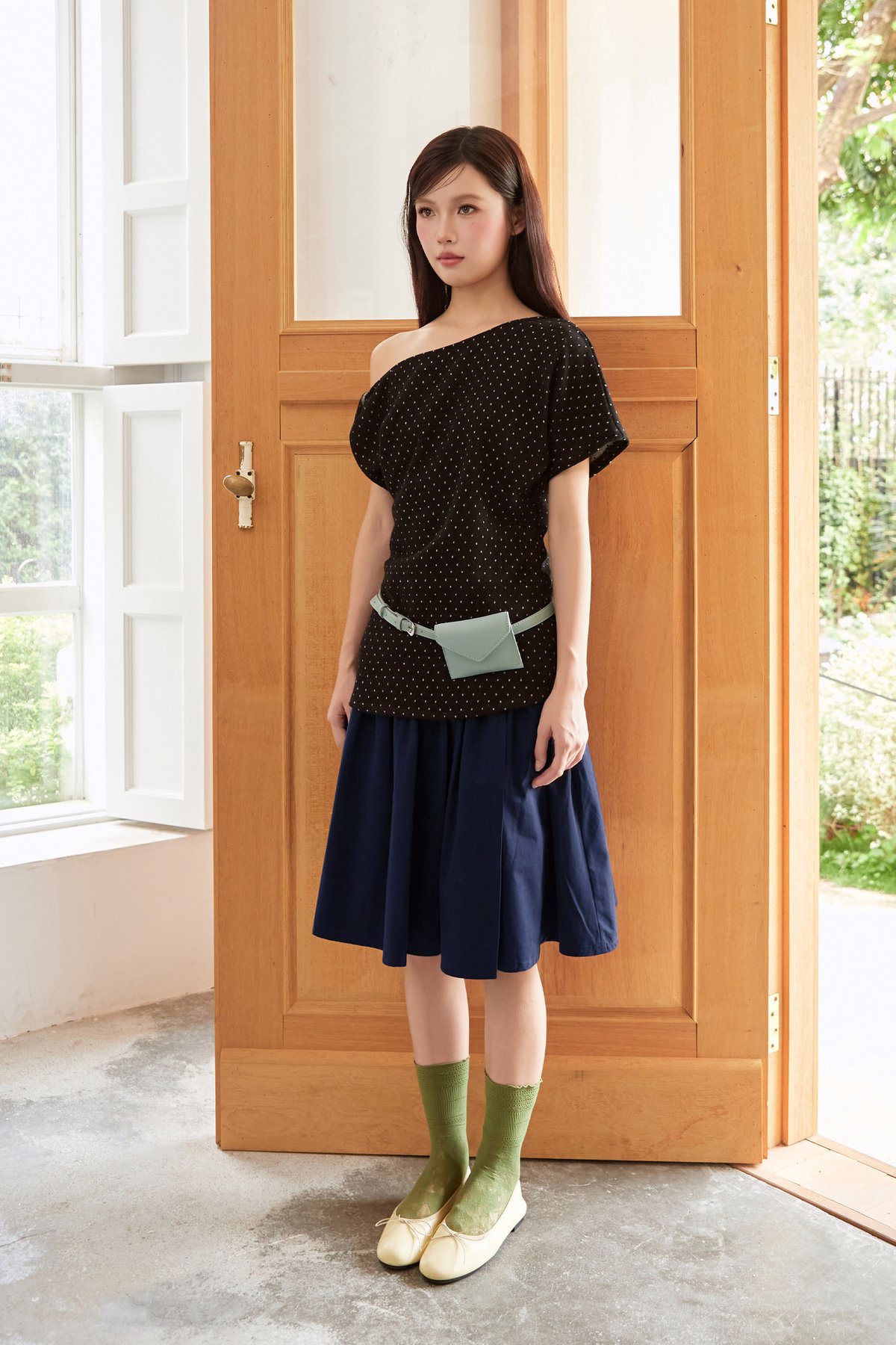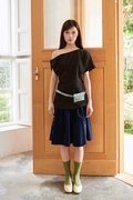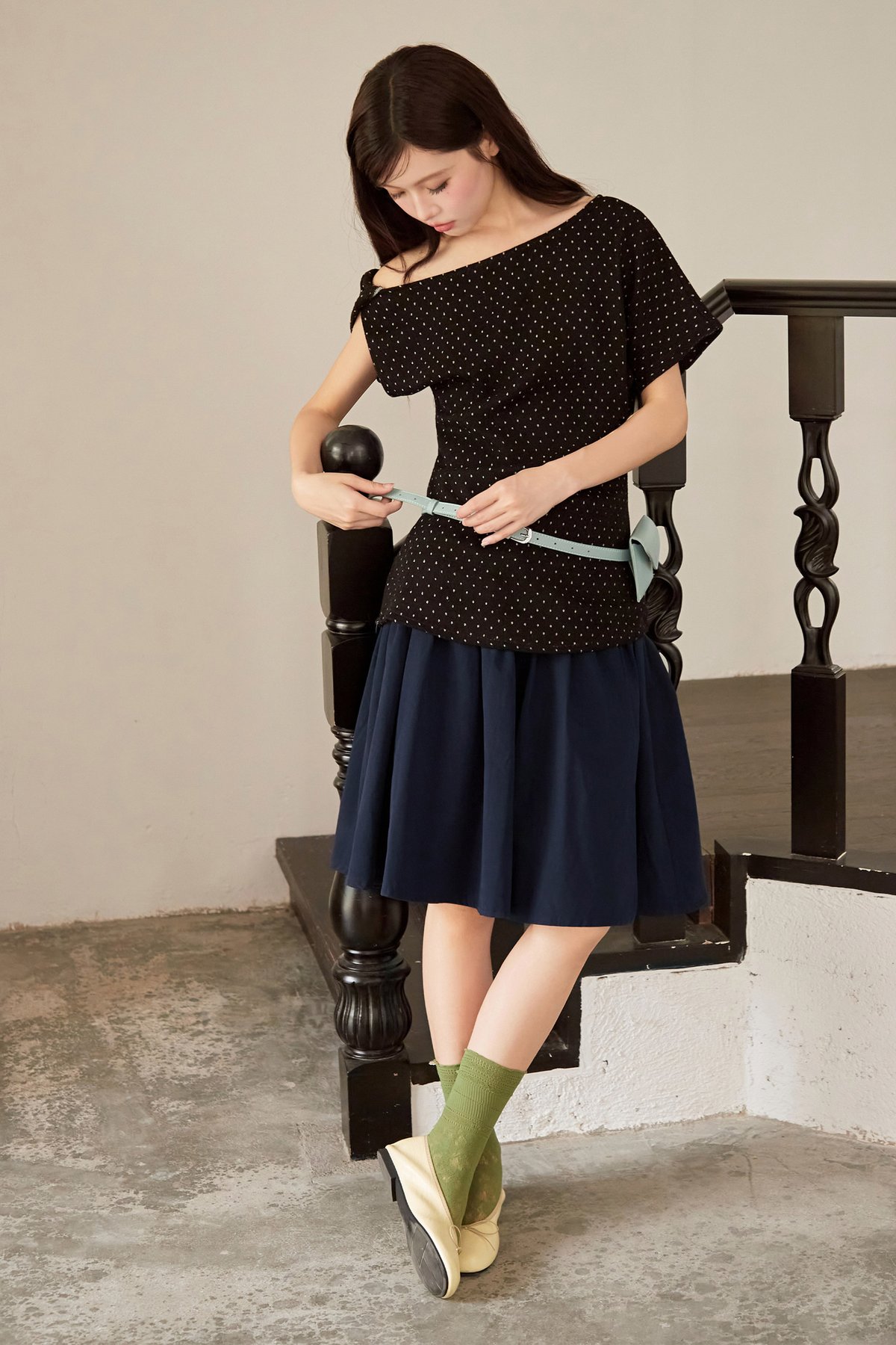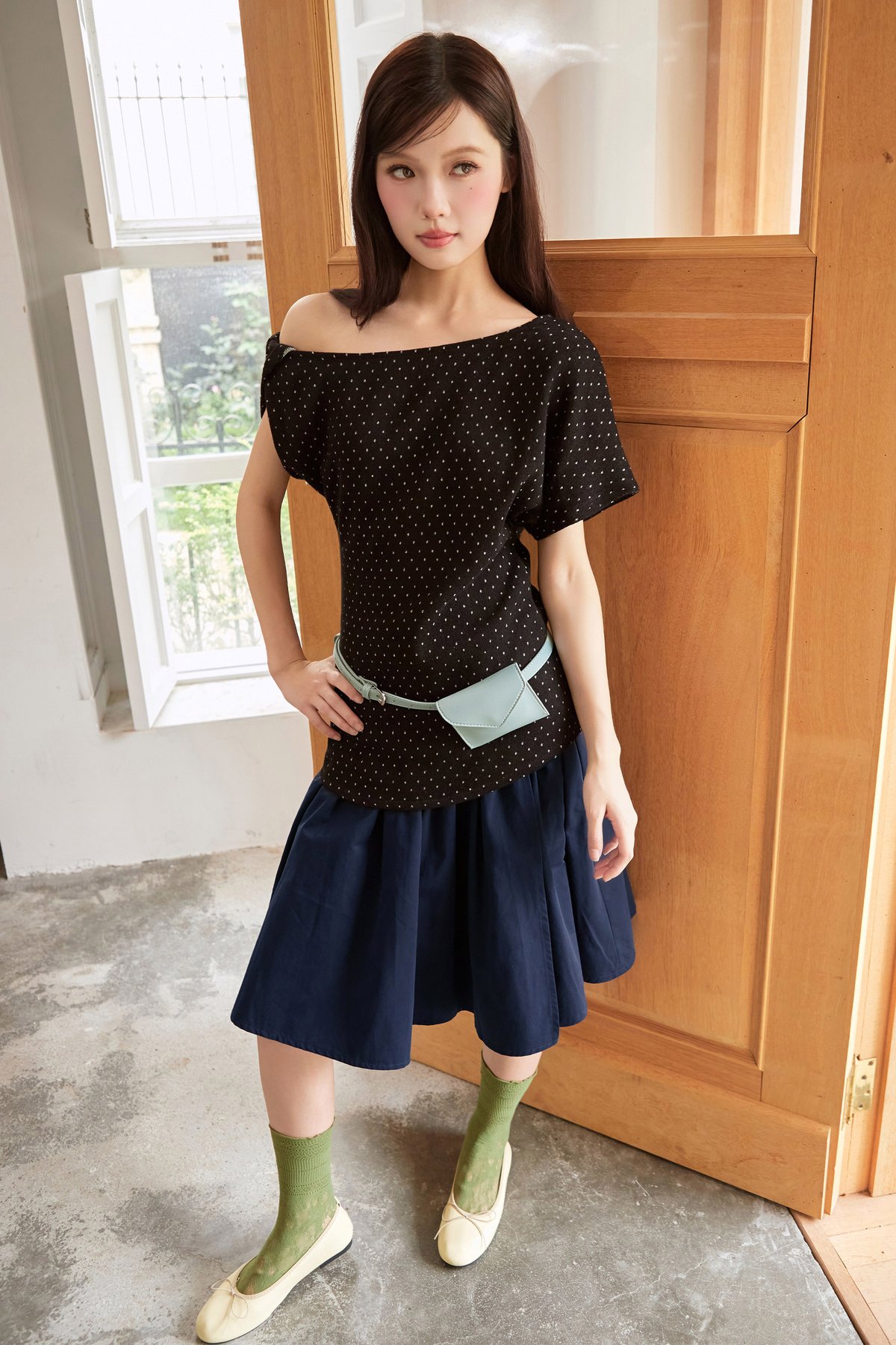 A top with an asymmetrical toga neckline and a side sleeve knot detail.