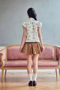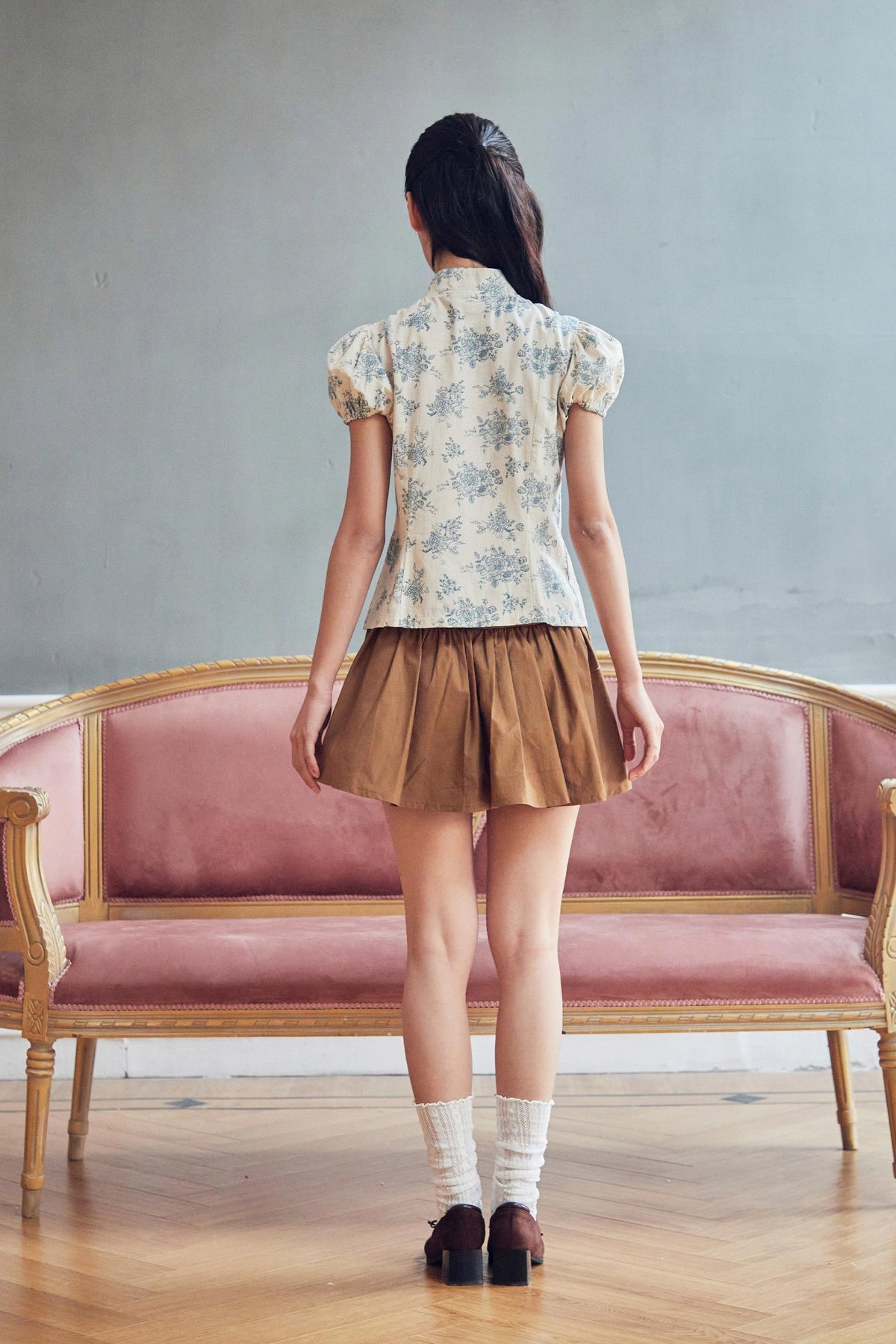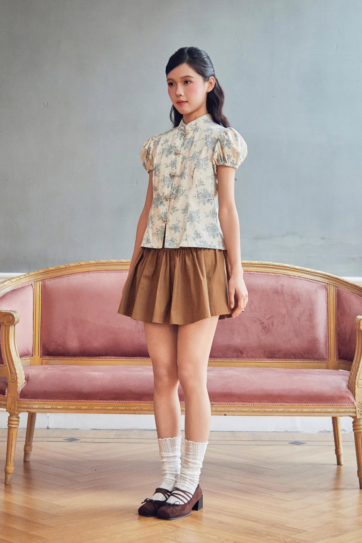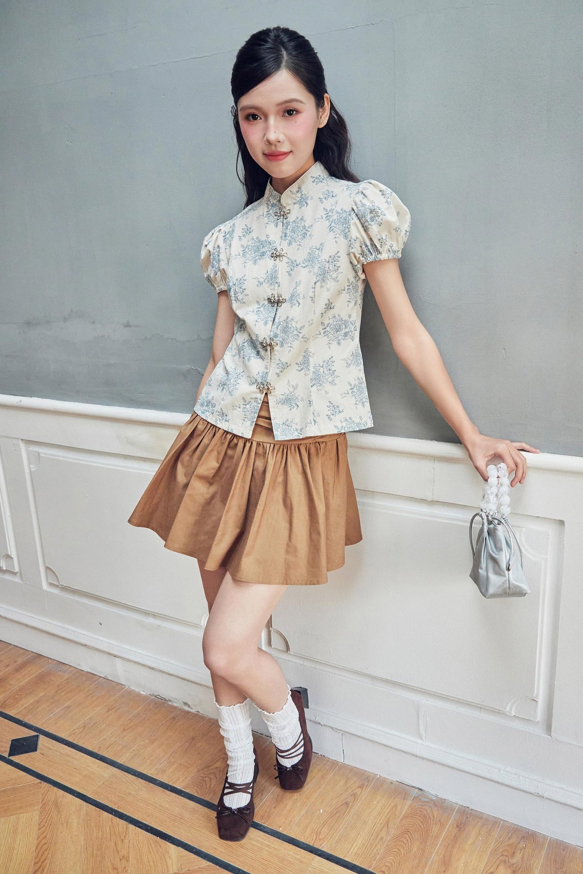 This cheongsam top features a Chinese stand collar with a functional metal hook button for a refined touch. Designed with puff sleeves finished with elasticated hems, it offers an easy slip-on fit that balances structure with everyday comfort.