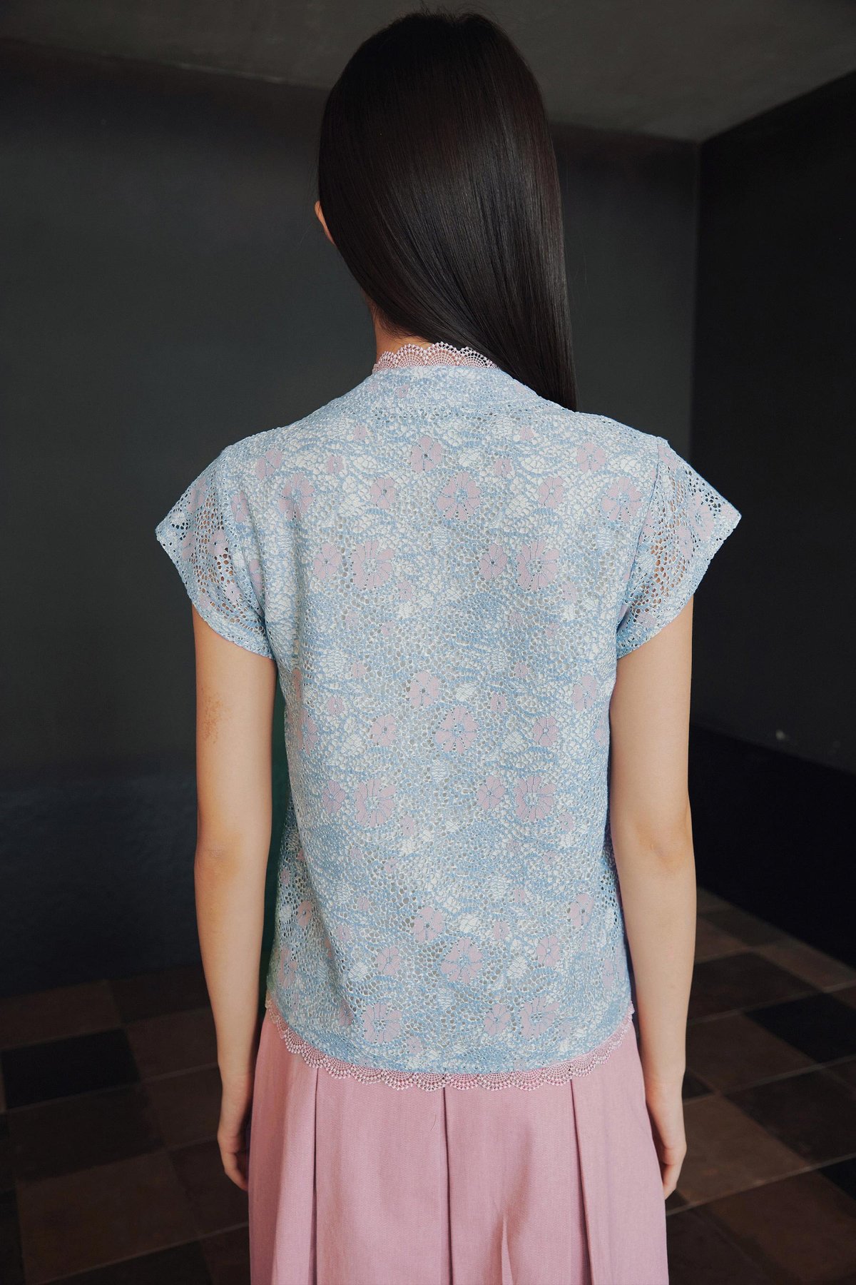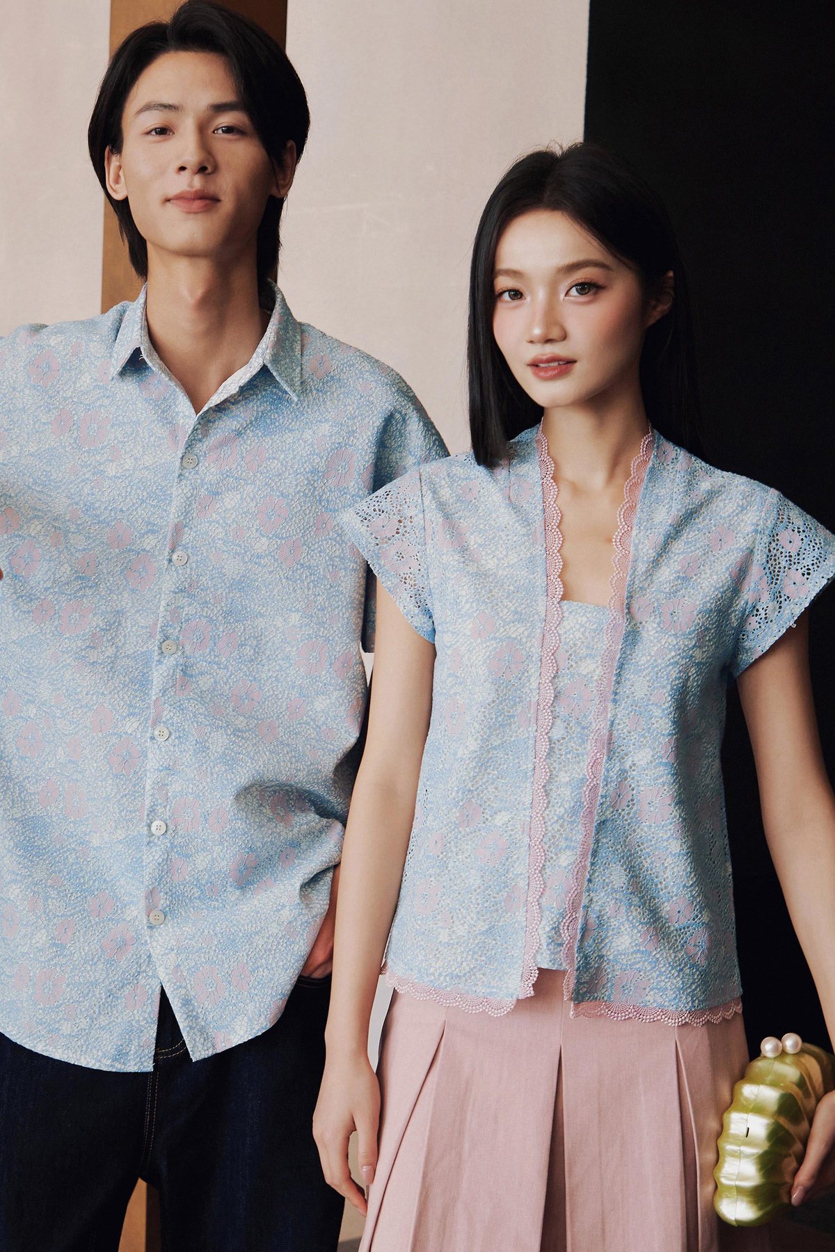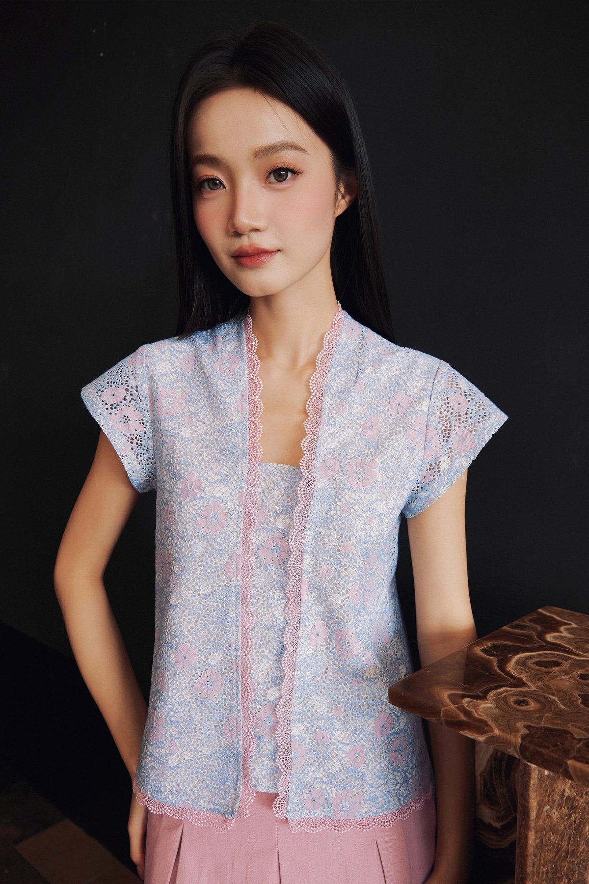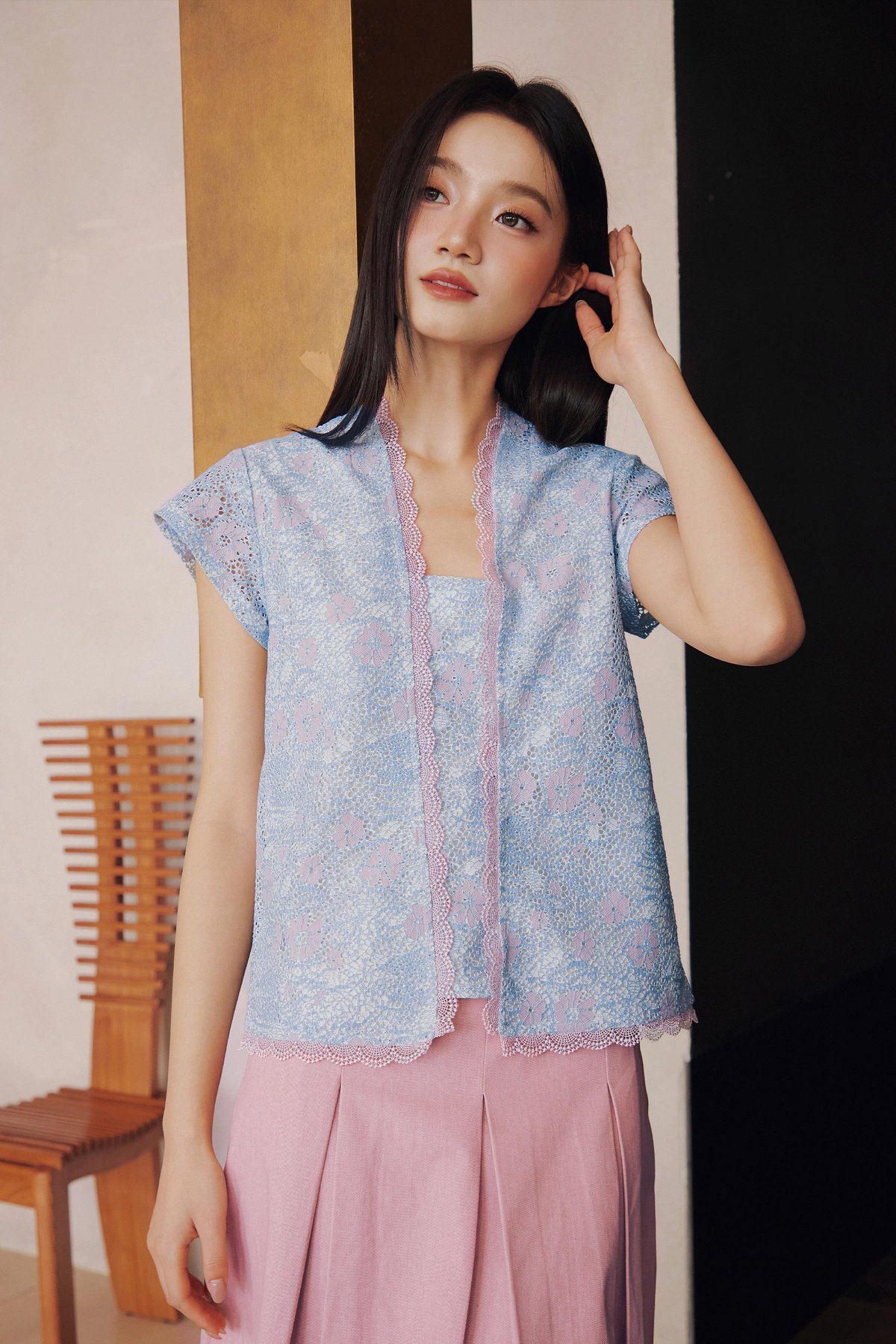 A Peranakan-inspired kebaya top featuring hidden front snap buttons and delicate lace trimmings along the neckline and hem.