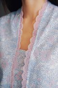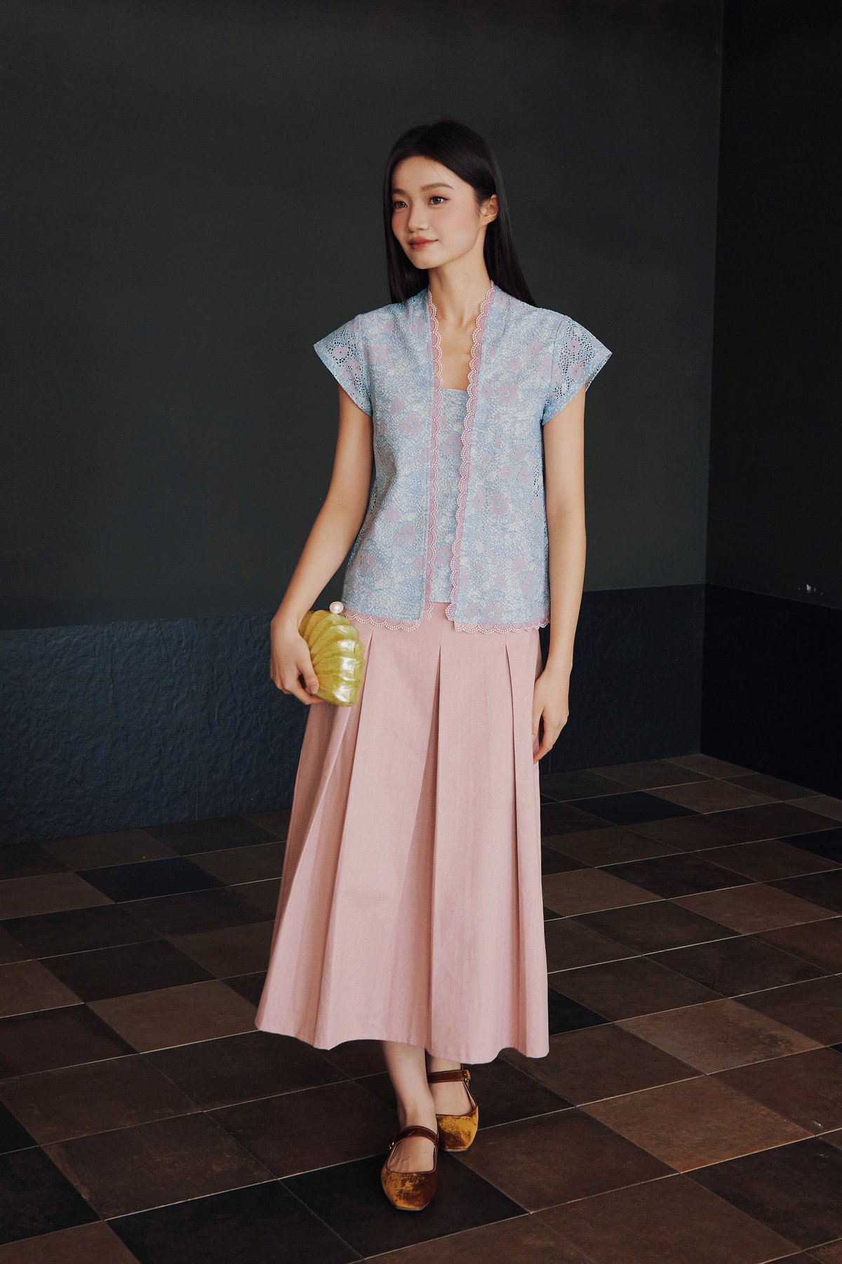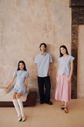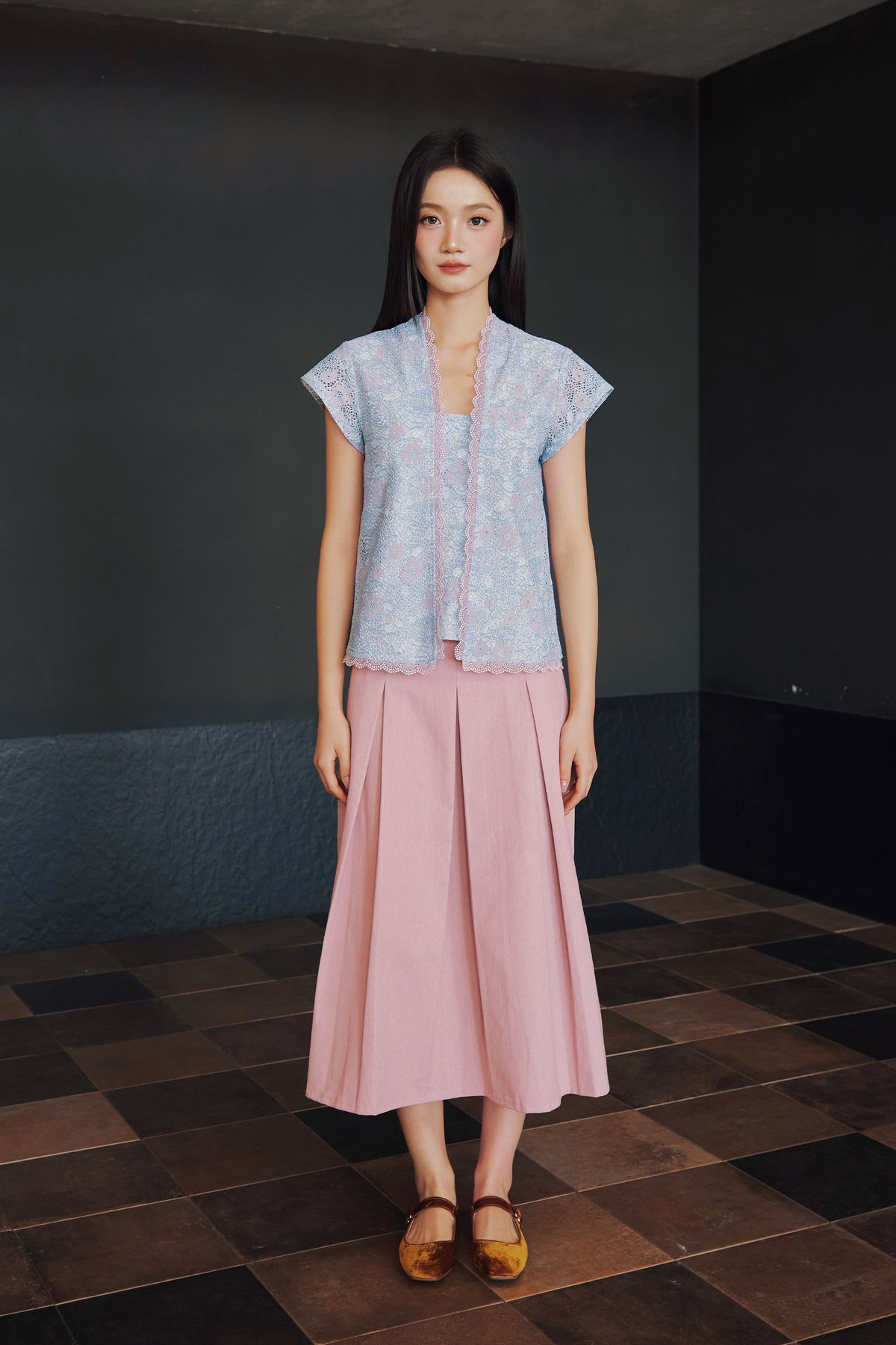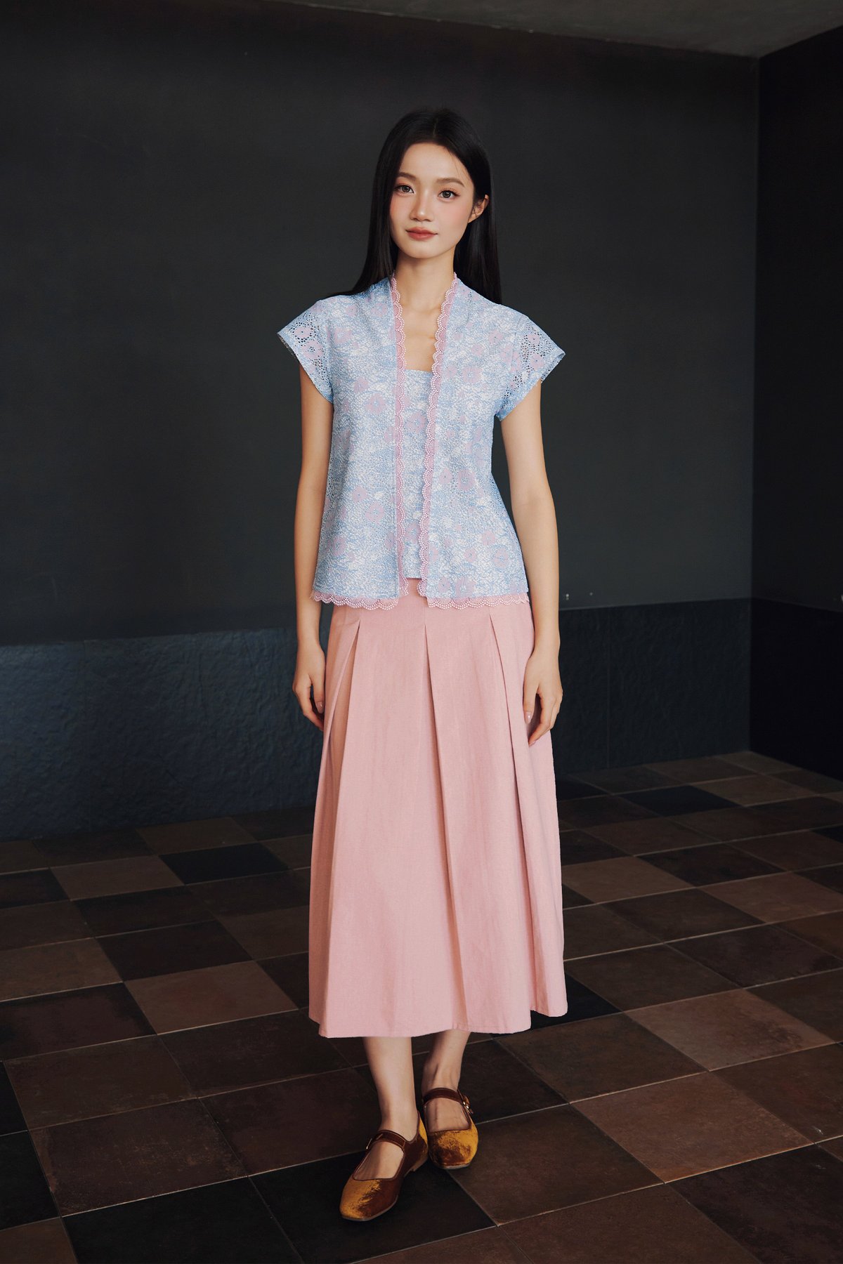 A Peranakan-inspired kebaya top featuring hidden front snap buttons and delicate lace trimmings along the neckline and hem.