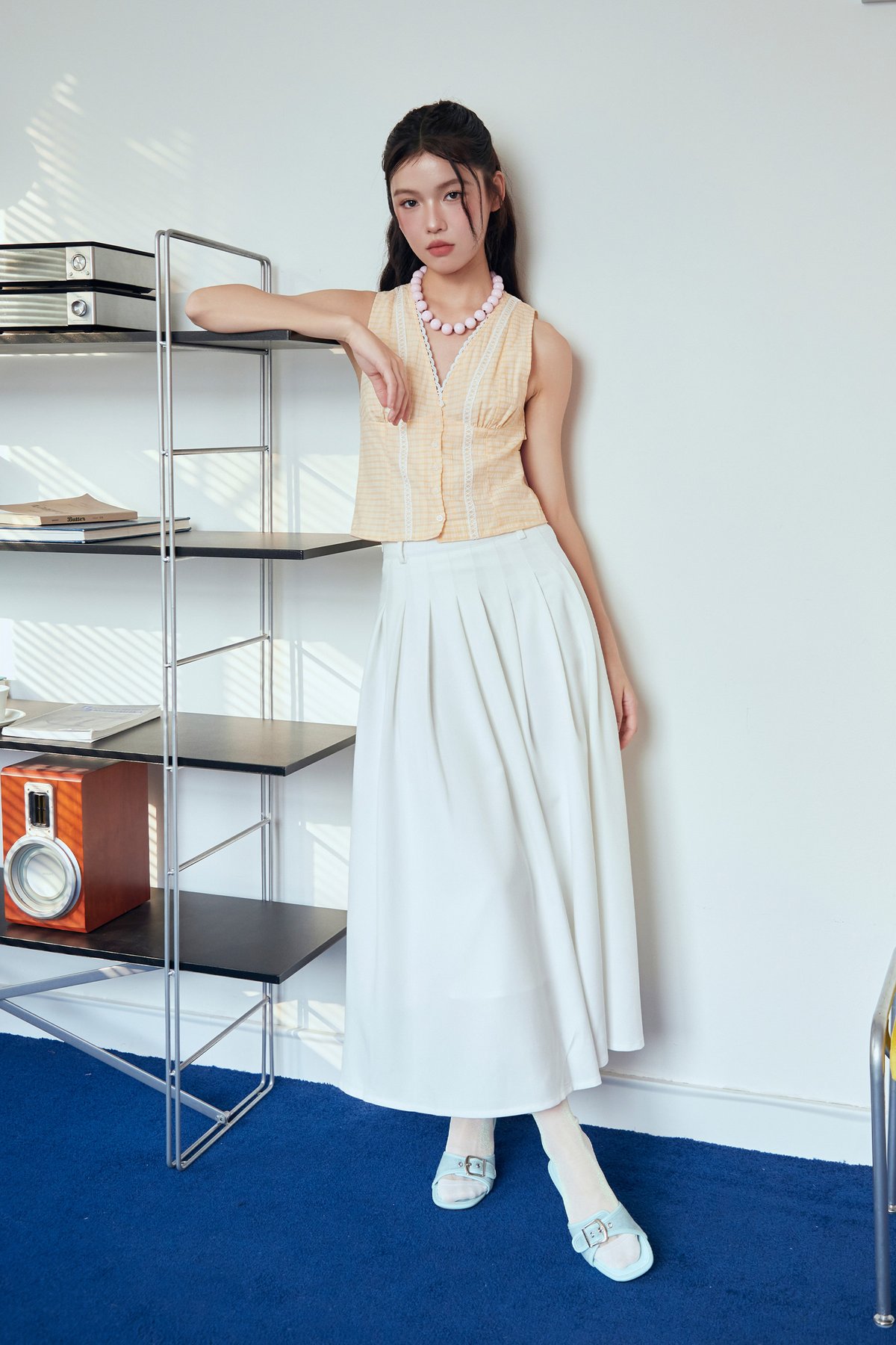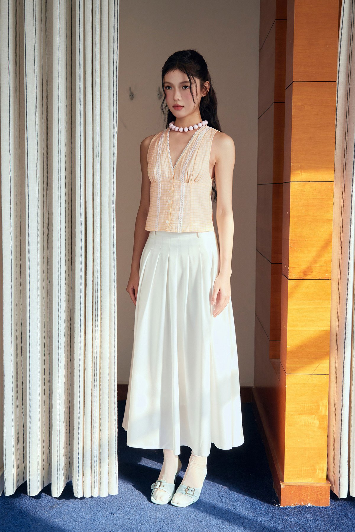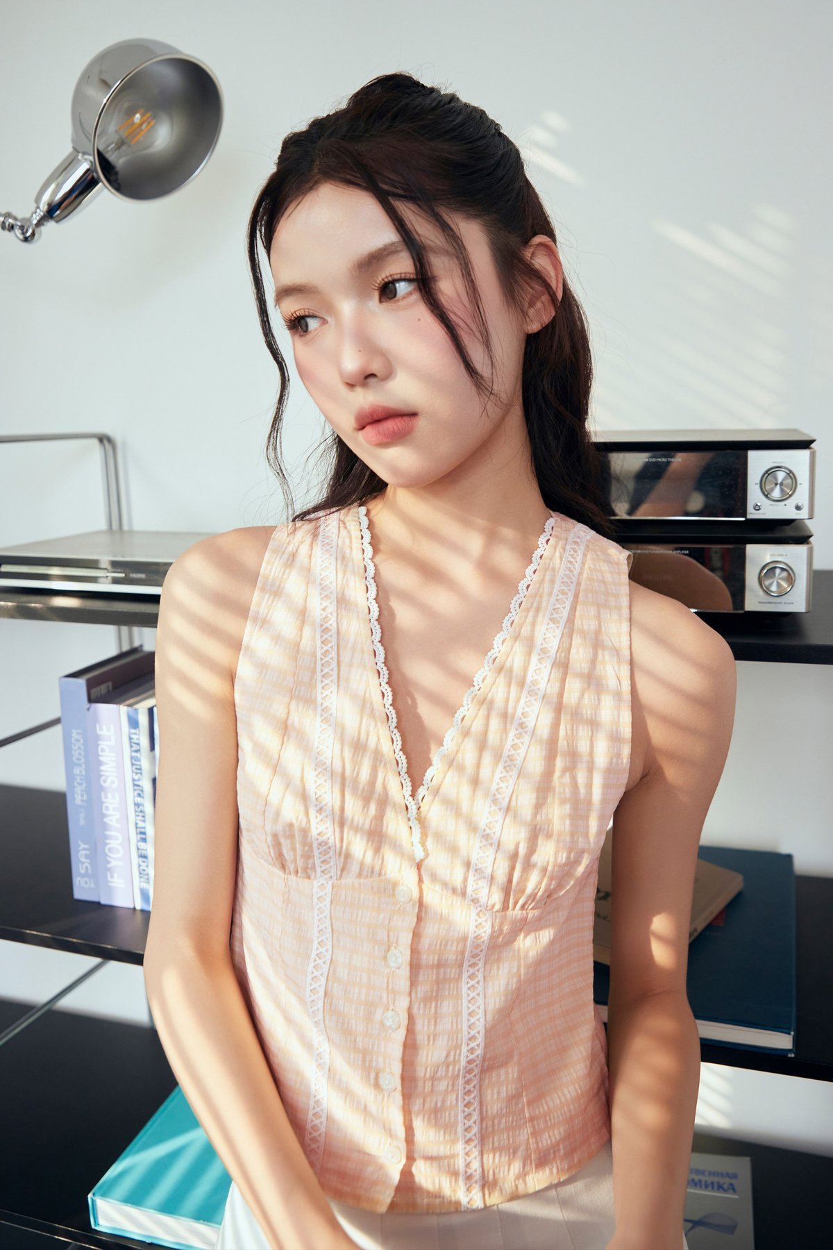 A sleeveless V-neck blouse featuring functional buttons, trimmings along the neckline and bodice, and subtle gathers at the bust for added shape.