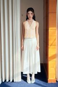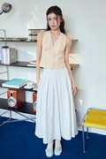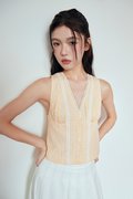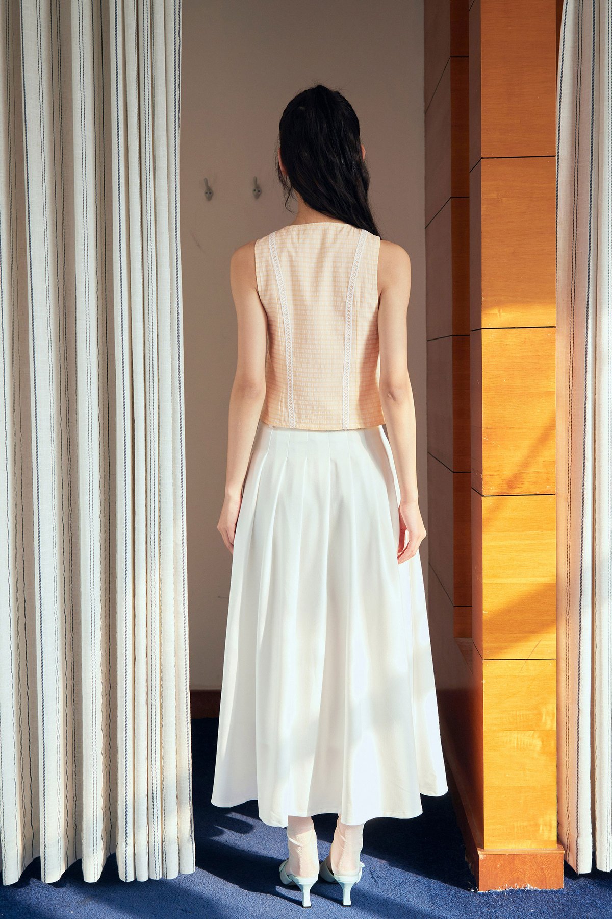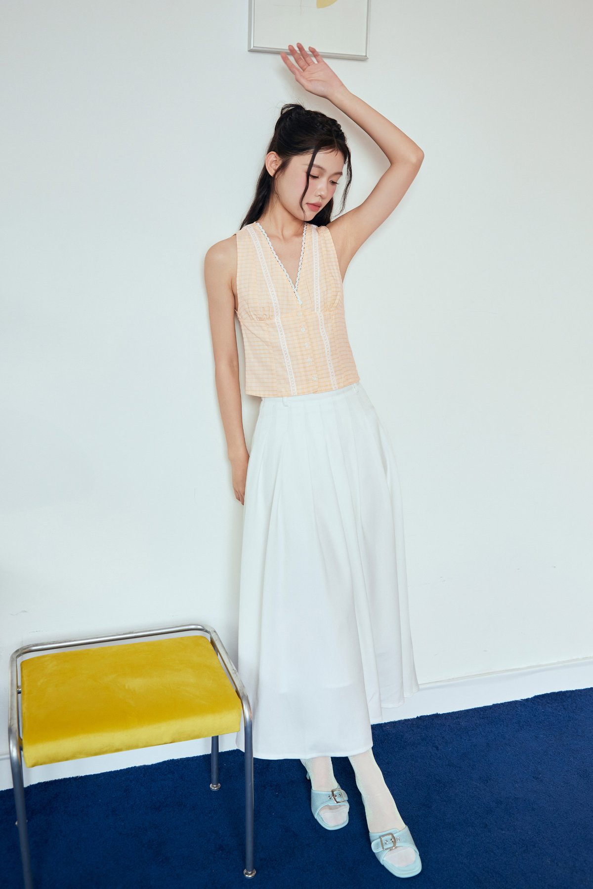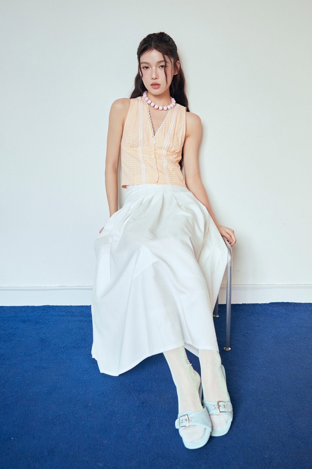 A sleeveless V-neck blouse featuring functional buttons, trimmings along the neckline and bodice, and subtle gathers at the bust for added shape.