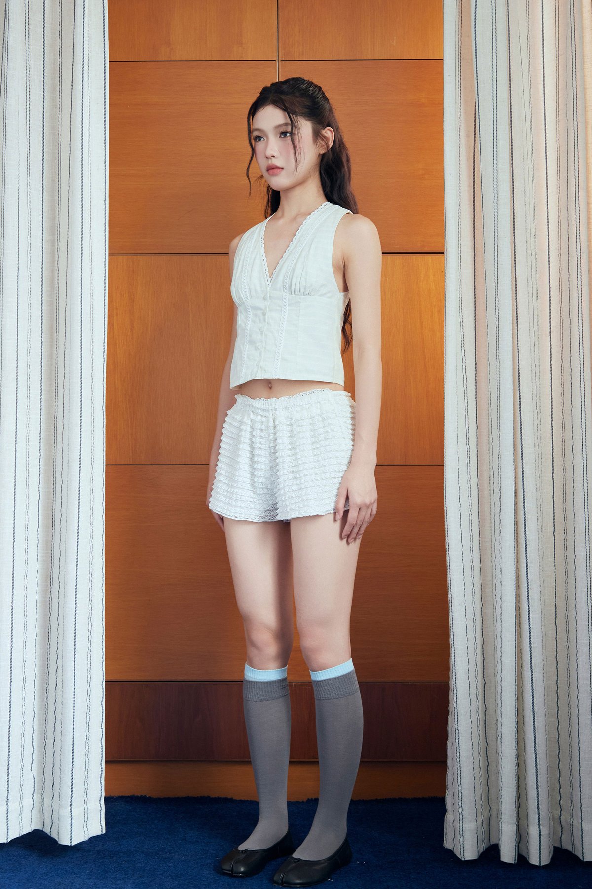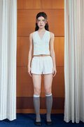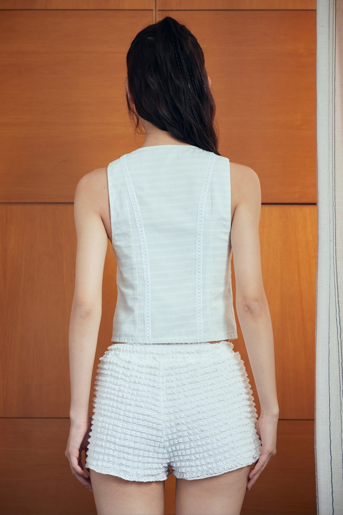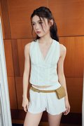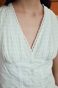 A sleeveless V-neck blouse featuring functional buttons, trimmings along the neckline and bodice, and subtle gathers at the bust for added shape.