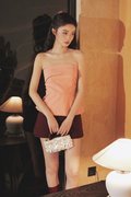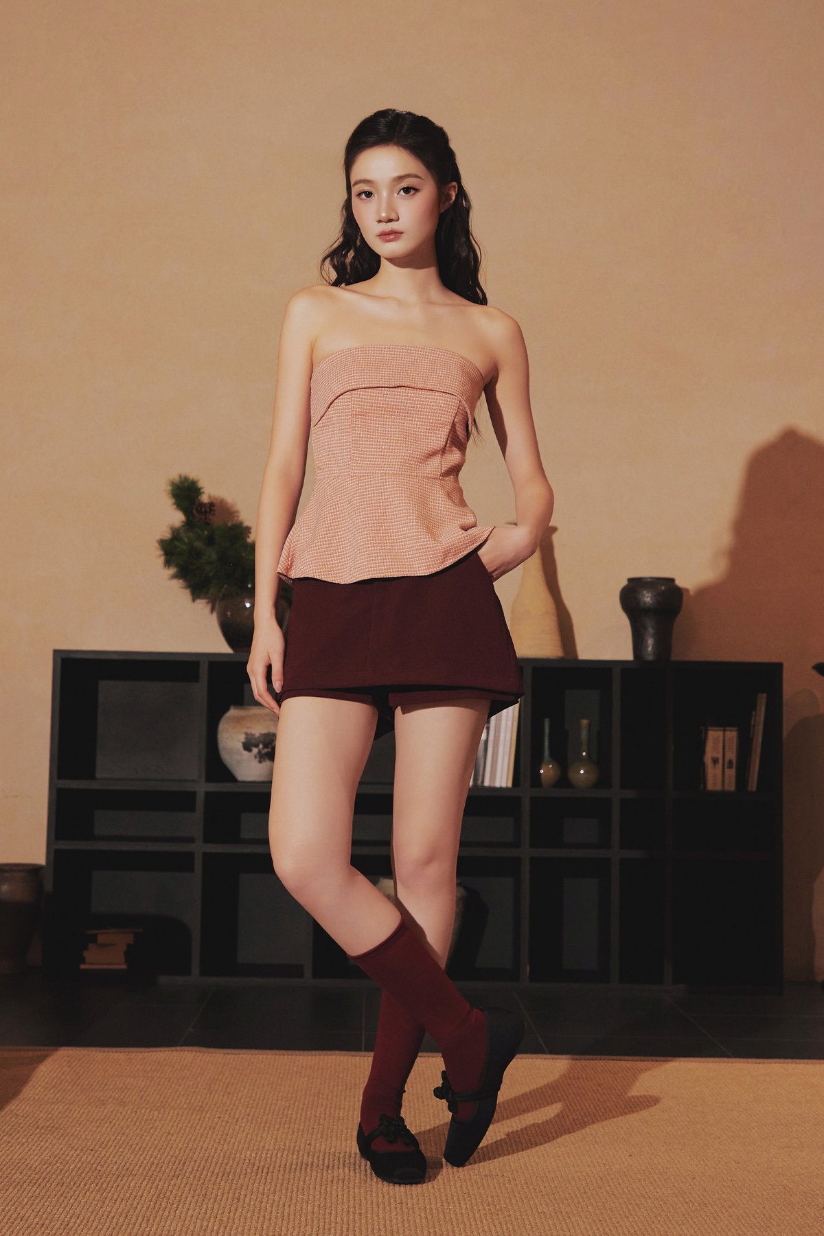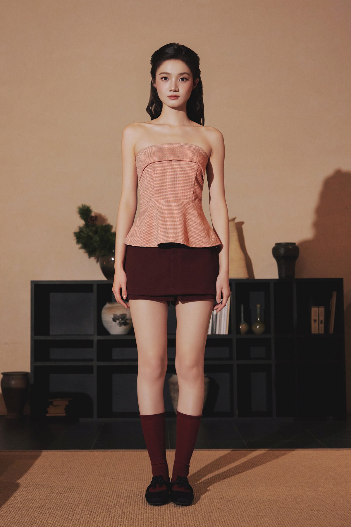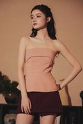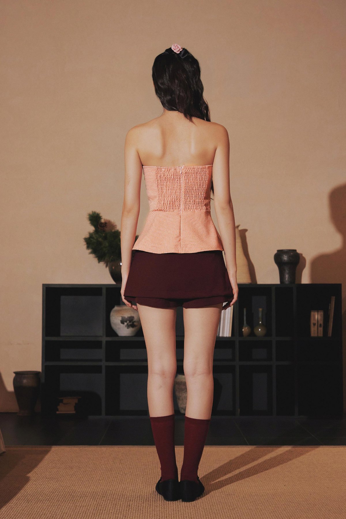 A tube top designed with a padded bust area and an anti-slip band for a secure, flattering fit. Featuring a foldover detail at the neckline, a peplum flare silhouette, and a back concealed zipper with smocked detailing. Fully lined, except at the smocked area.