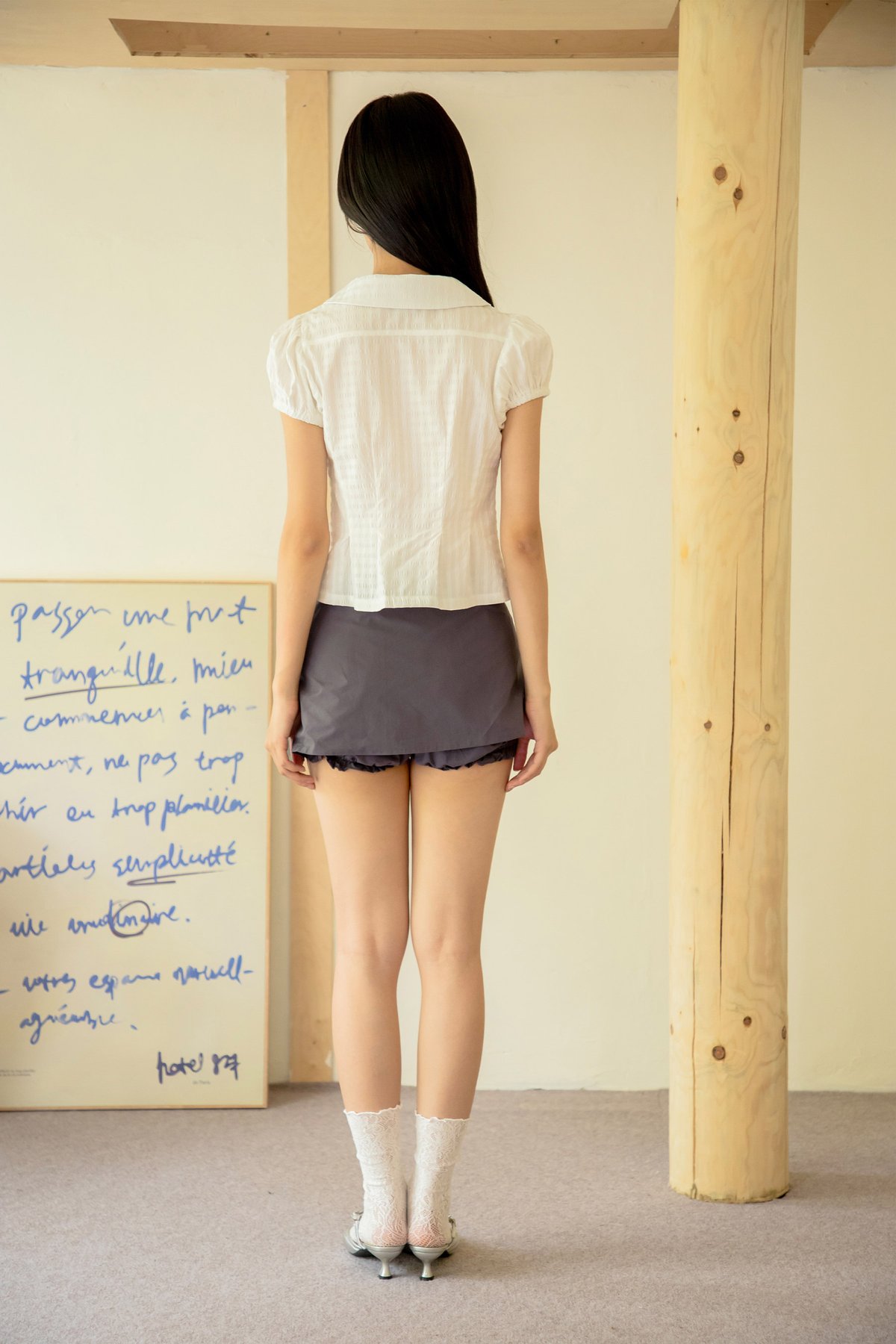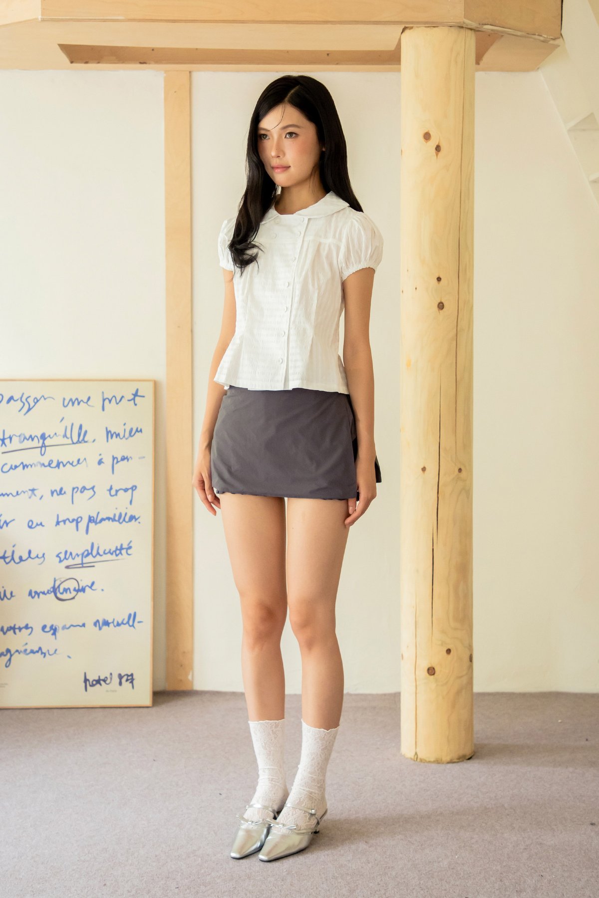 This top features puff sleeves with elasticated hems, a Peter Pan collar, functional front buttons, and box pleat details near the hem.