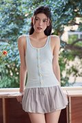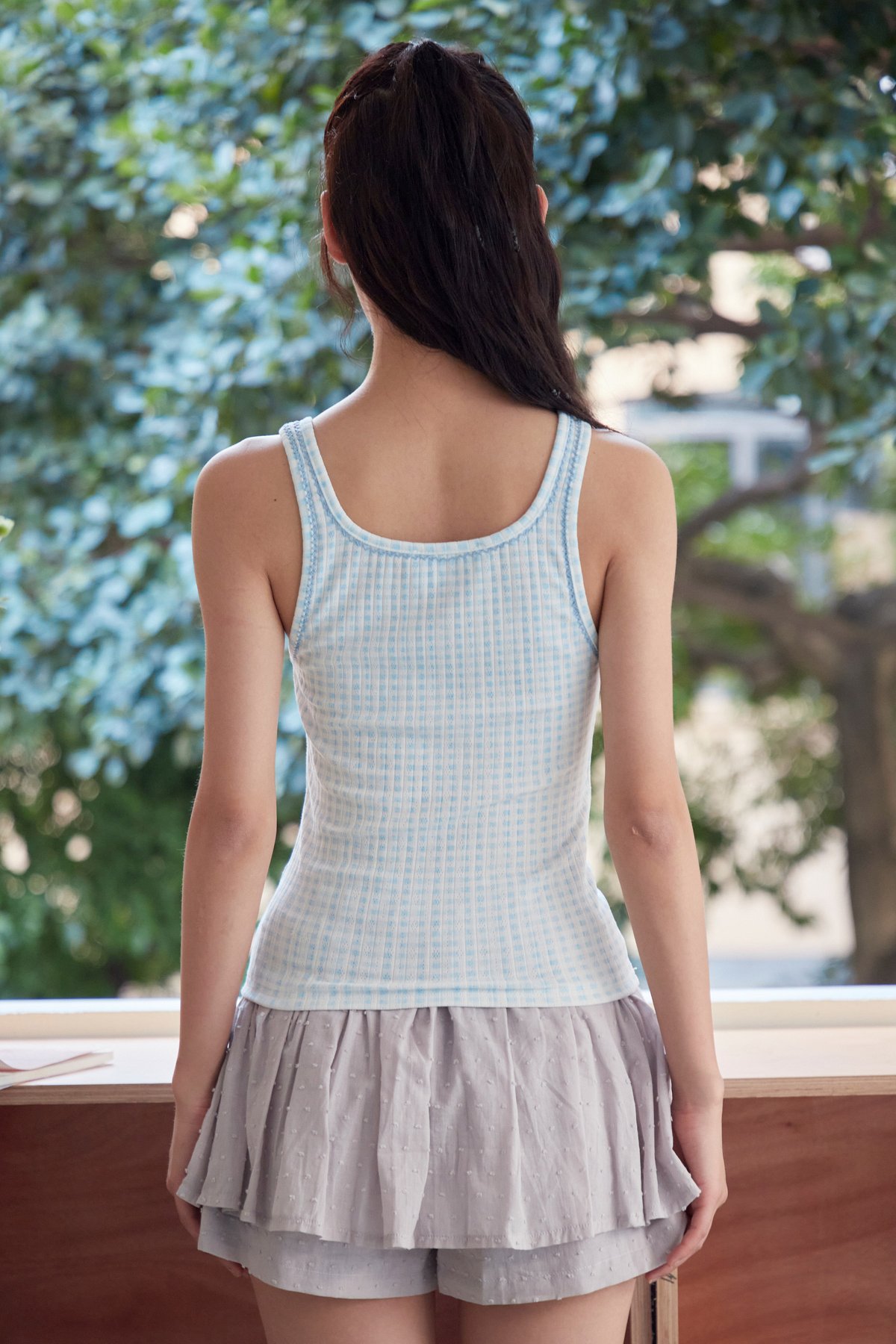 A pointelle knit tank top with contrast zigzag stitching, flower decorative buttons, stretch fit and easy slip-on style.