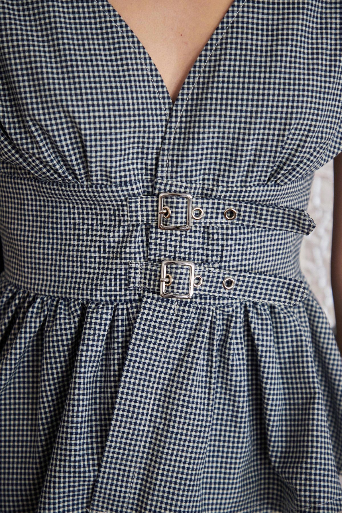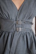 Designed with a V-neckline and a hidden snap button closure. Features two functional adjustable front waist belts and is finished with a back concealed zipper for a clean, structured fit.