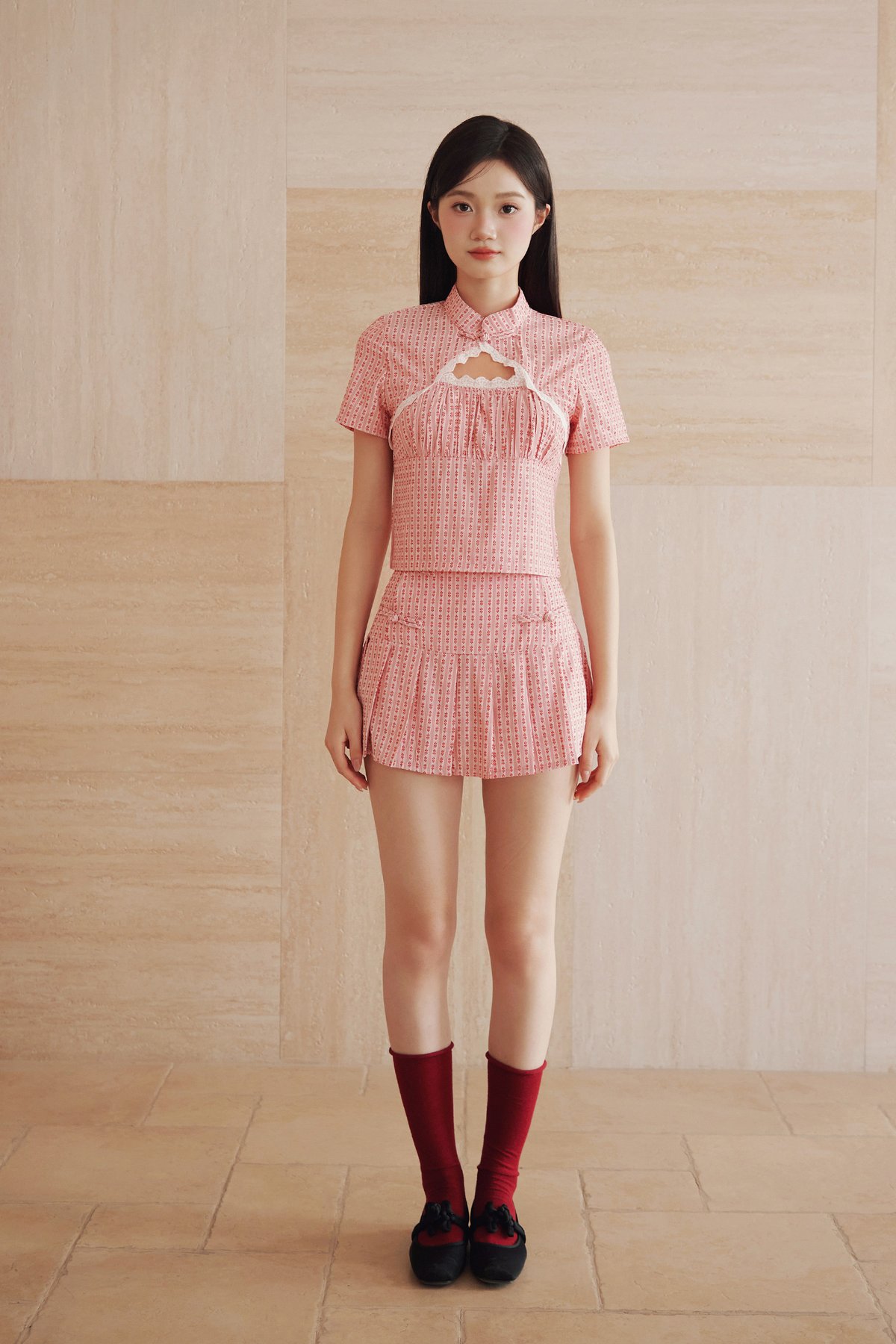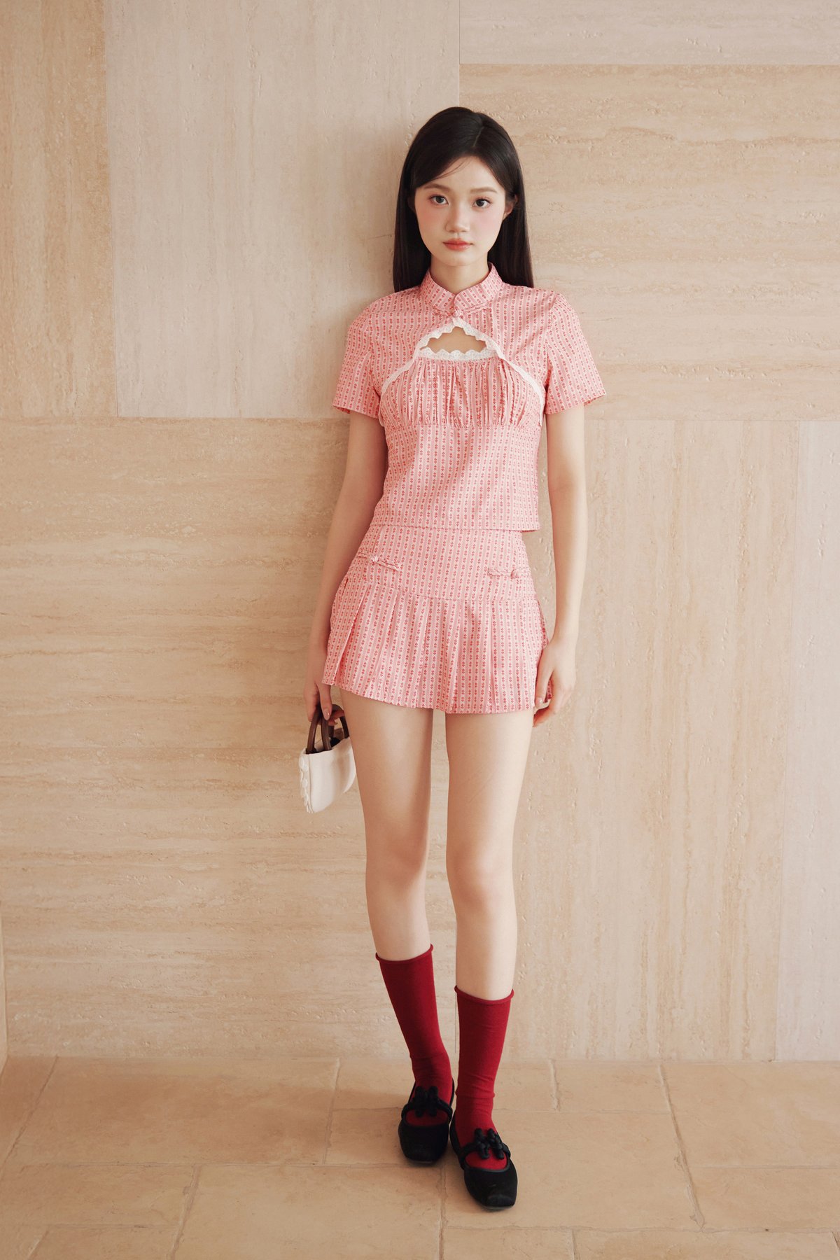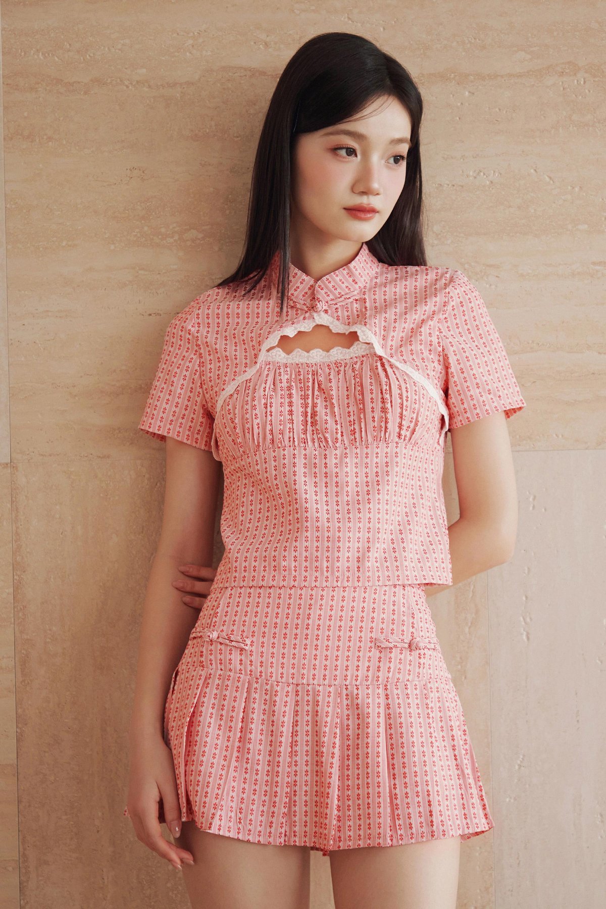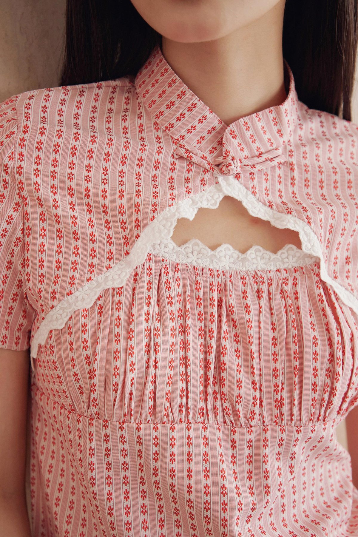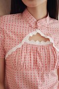 A Cheongsam top featuring a Chinese stand collar, functional Chinese frog buttons at the front, a cutout detail with lace trimming, gathered bust detailing, and a concealed zipper at the back.