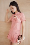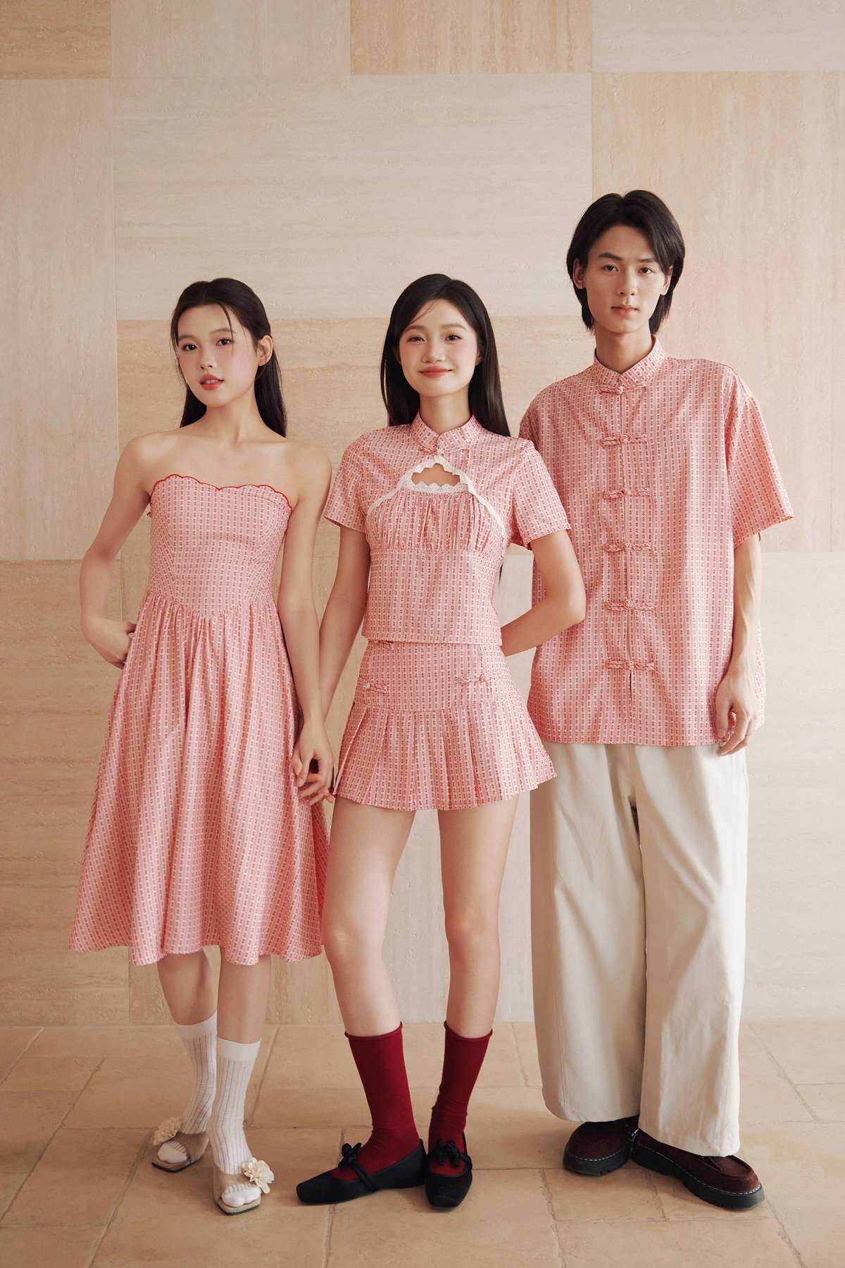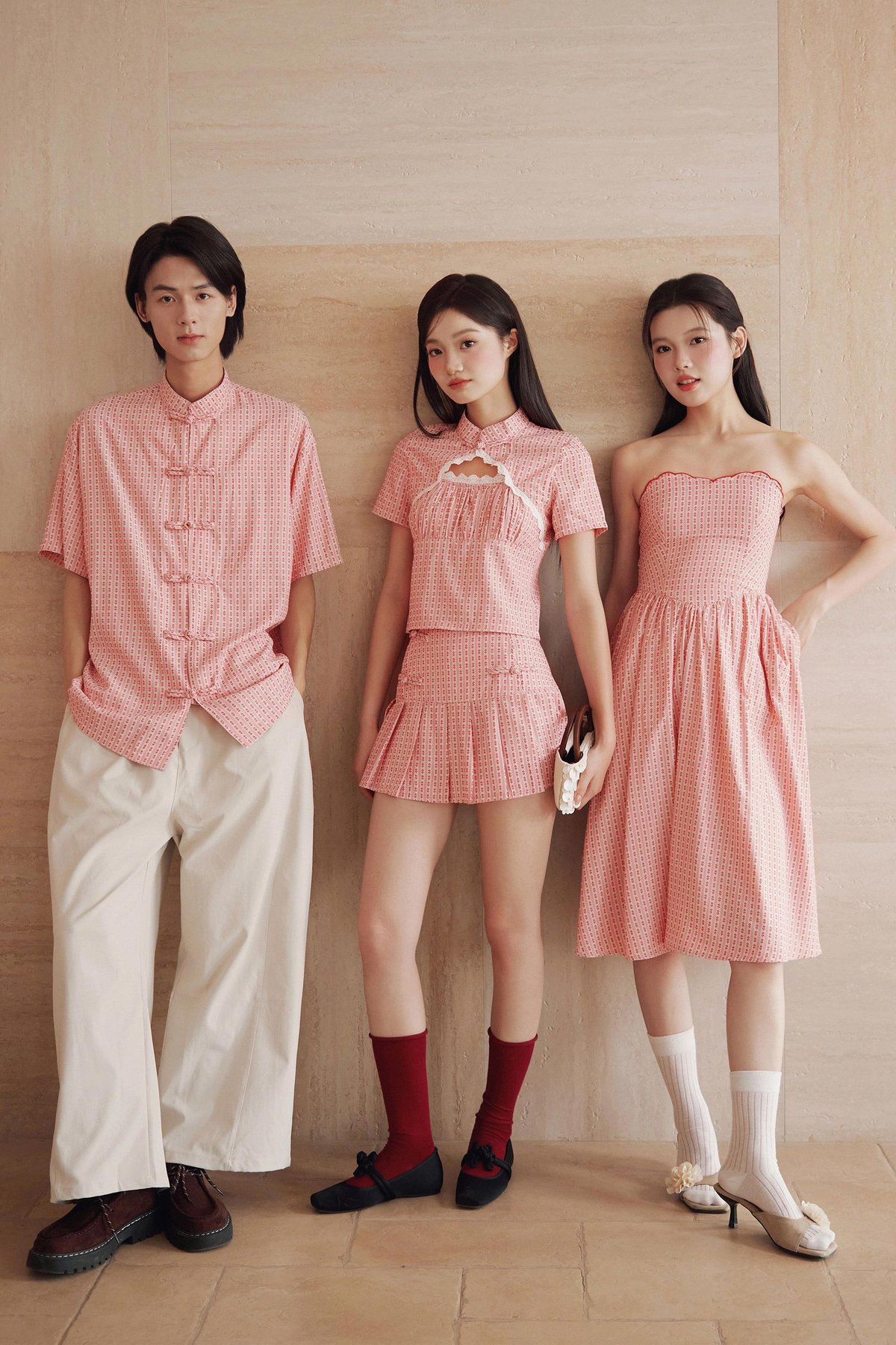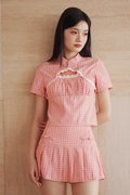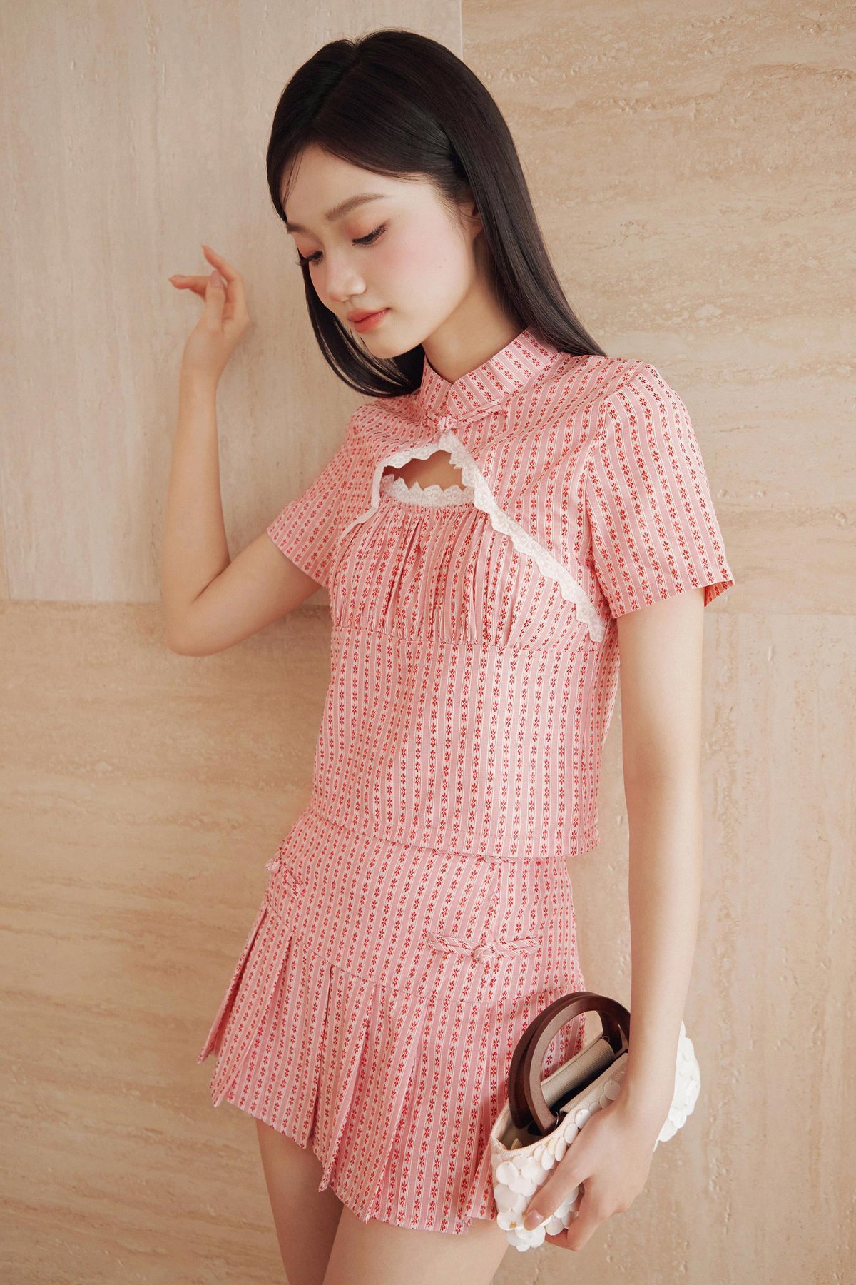 A Cheongsam top featuring a Chinese stand collar, functional Chinese frog buttons at the front, a cutout detail with lace trimming, gathered bust detailing, and a concealed zipper at the back.