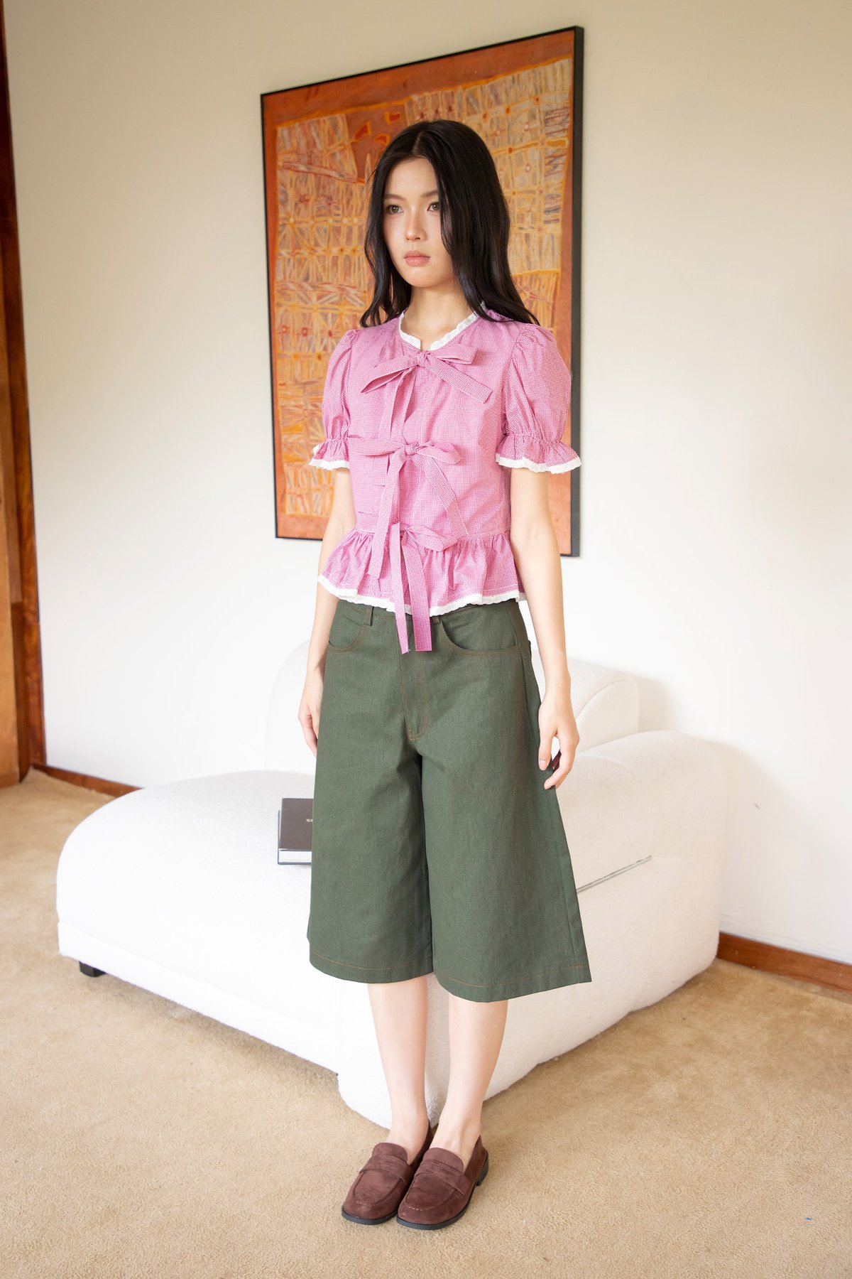 A puff sleeve blouse with adjustable ribbon tie. Comes with elastic band along the sleeves.