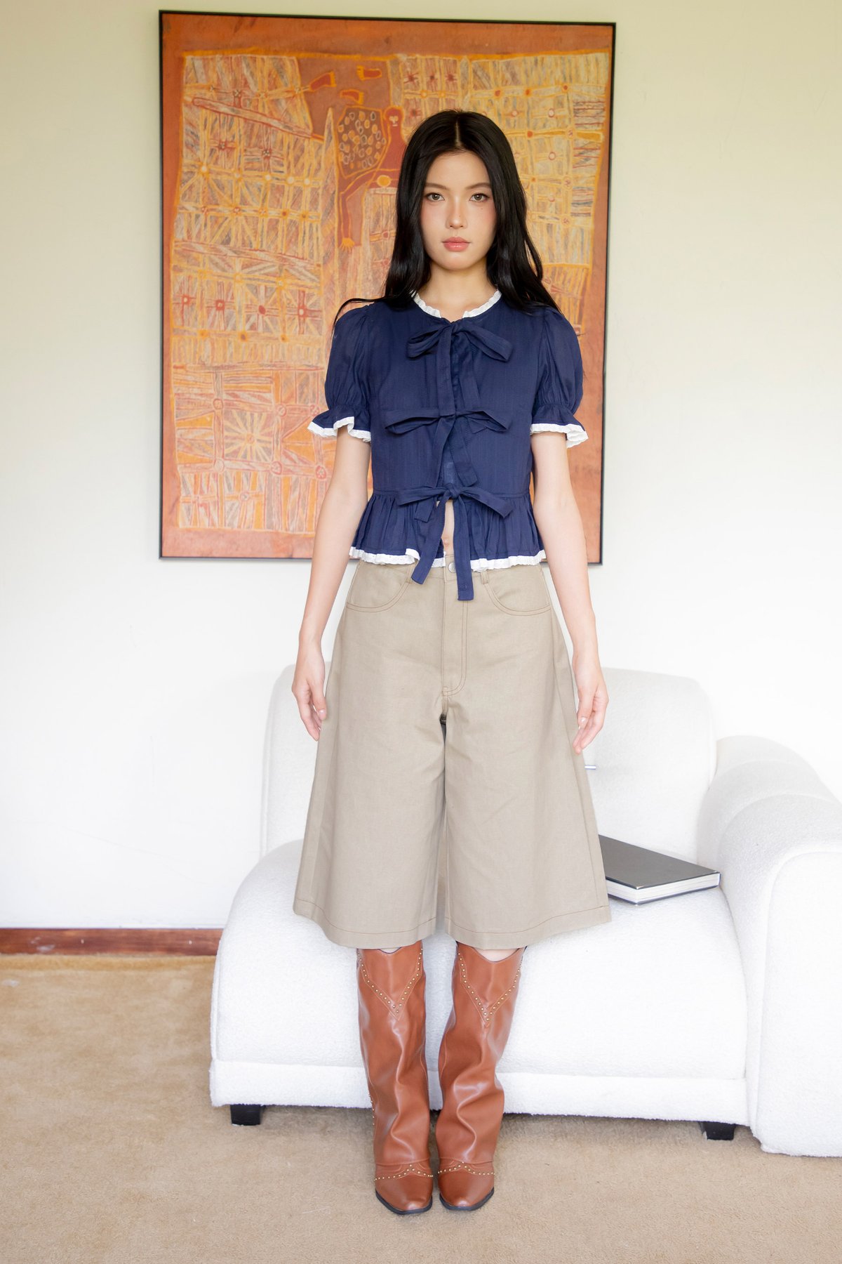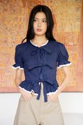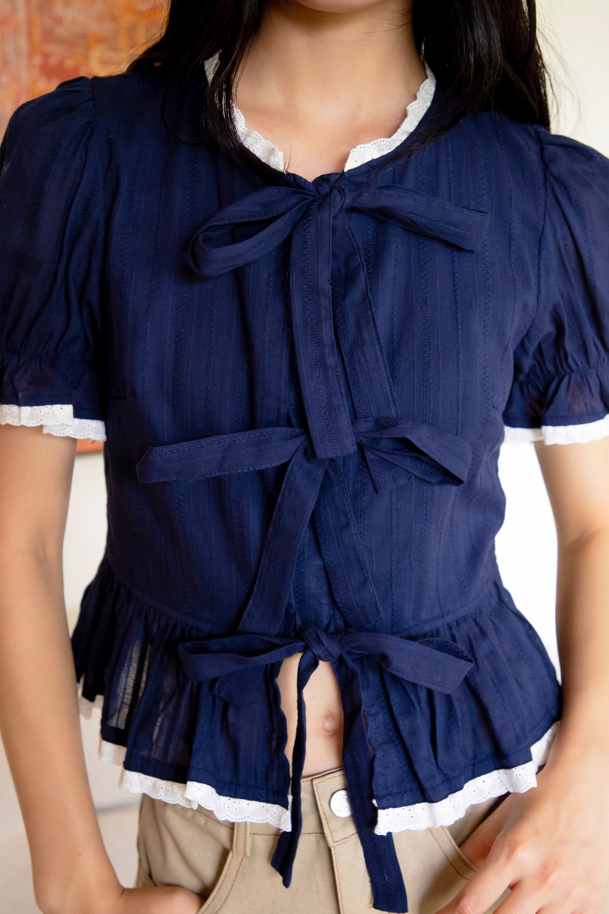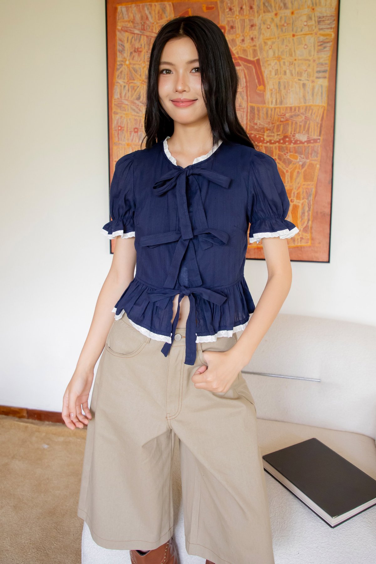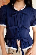 A puff sleeve blouse with adjustable ribbon tie. Comes with elastic band along the sleeves.