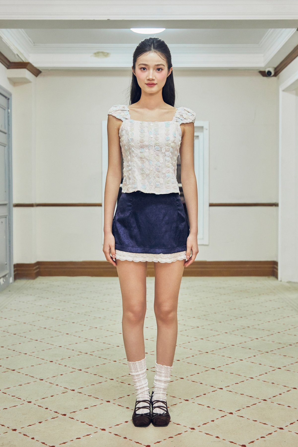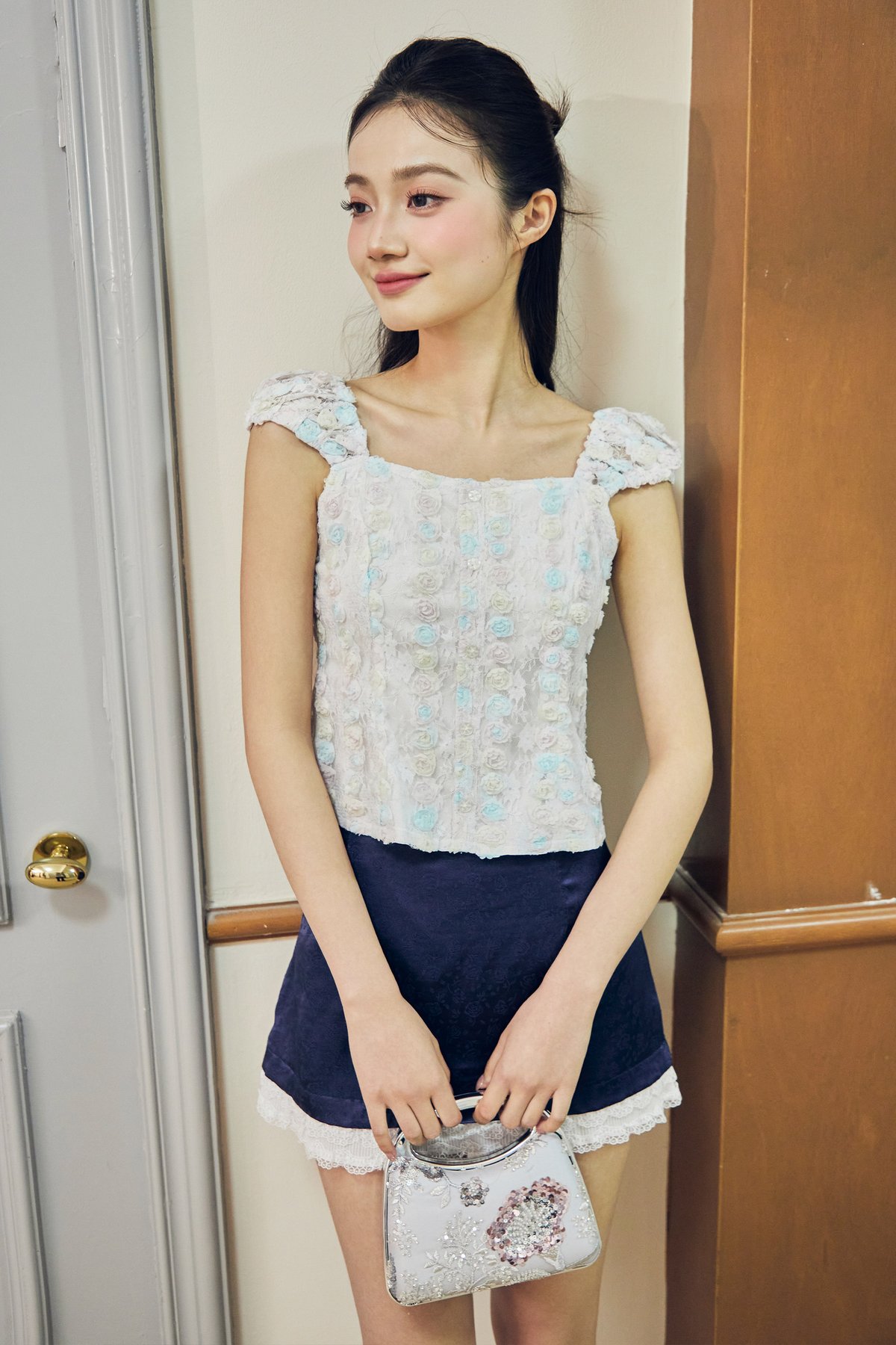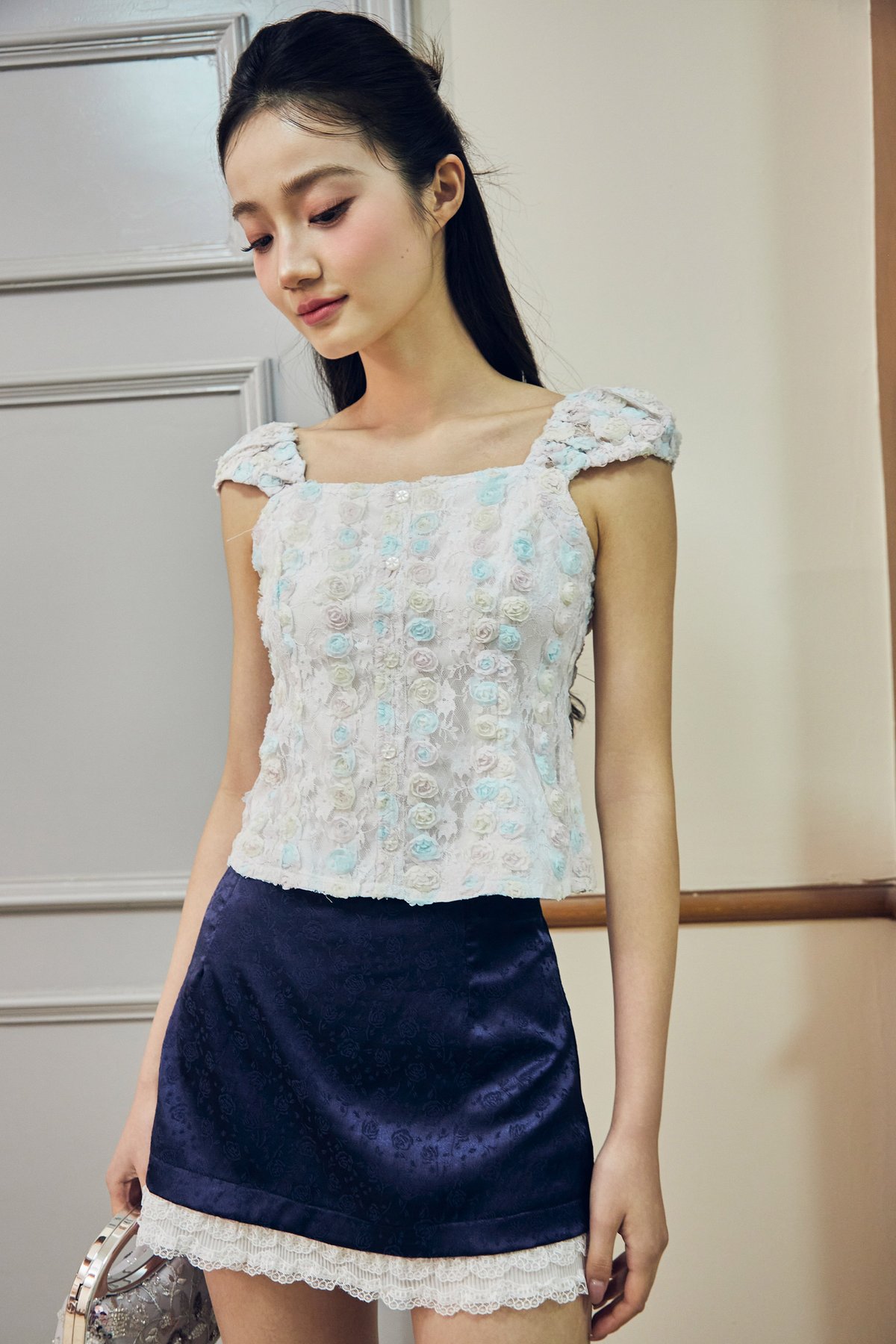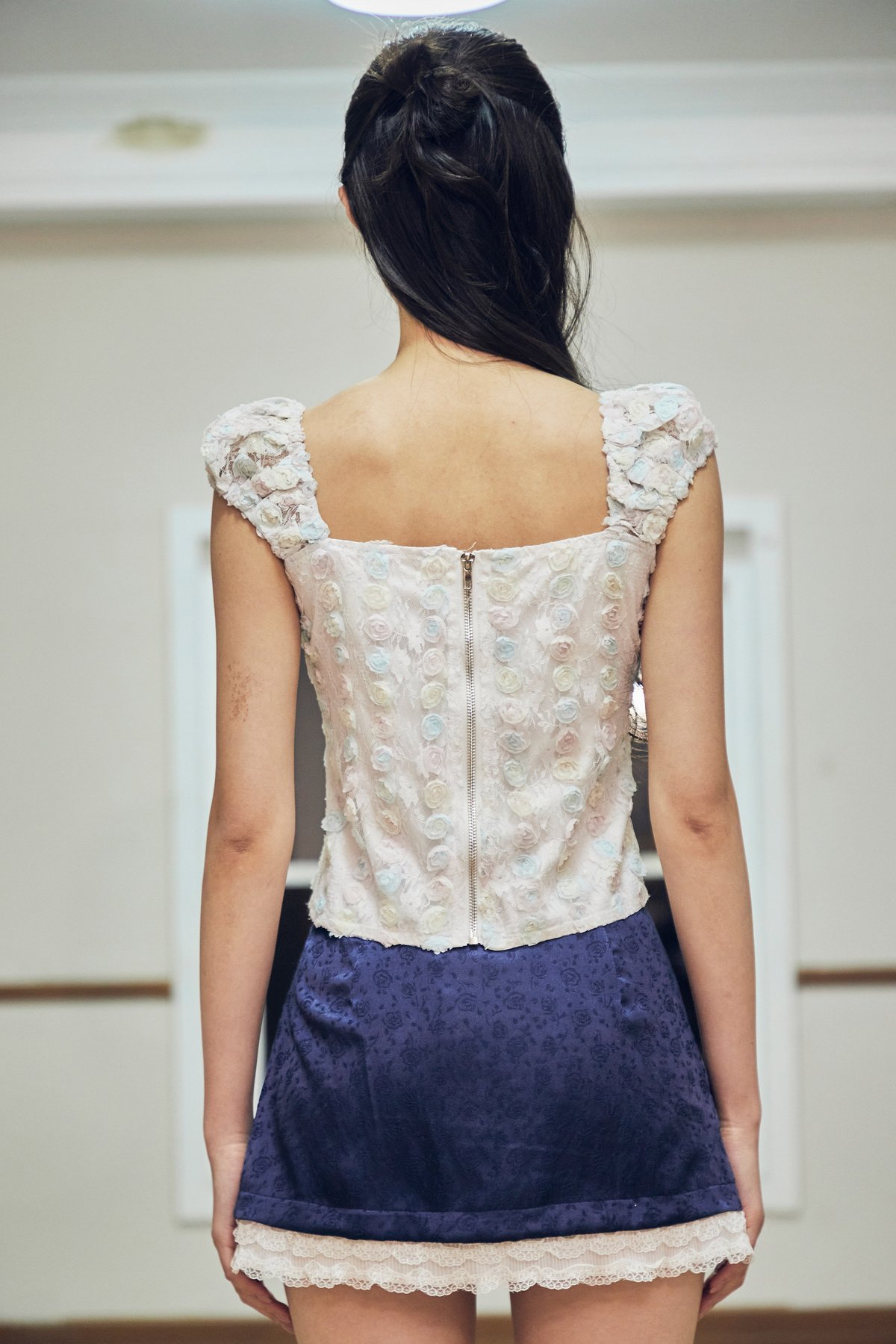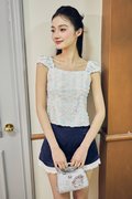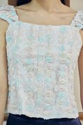 This top features faux front buttons and a back open-ended zipper for ease of wear. Designed with mini cap sleeves finished with elasticated detailing at the shoulders and sleeve hems, it is fully lined for comfort and coverage. Crafted in lace with a three-dimensional texture, it adds a delicate yet elevated touch to the overall look.