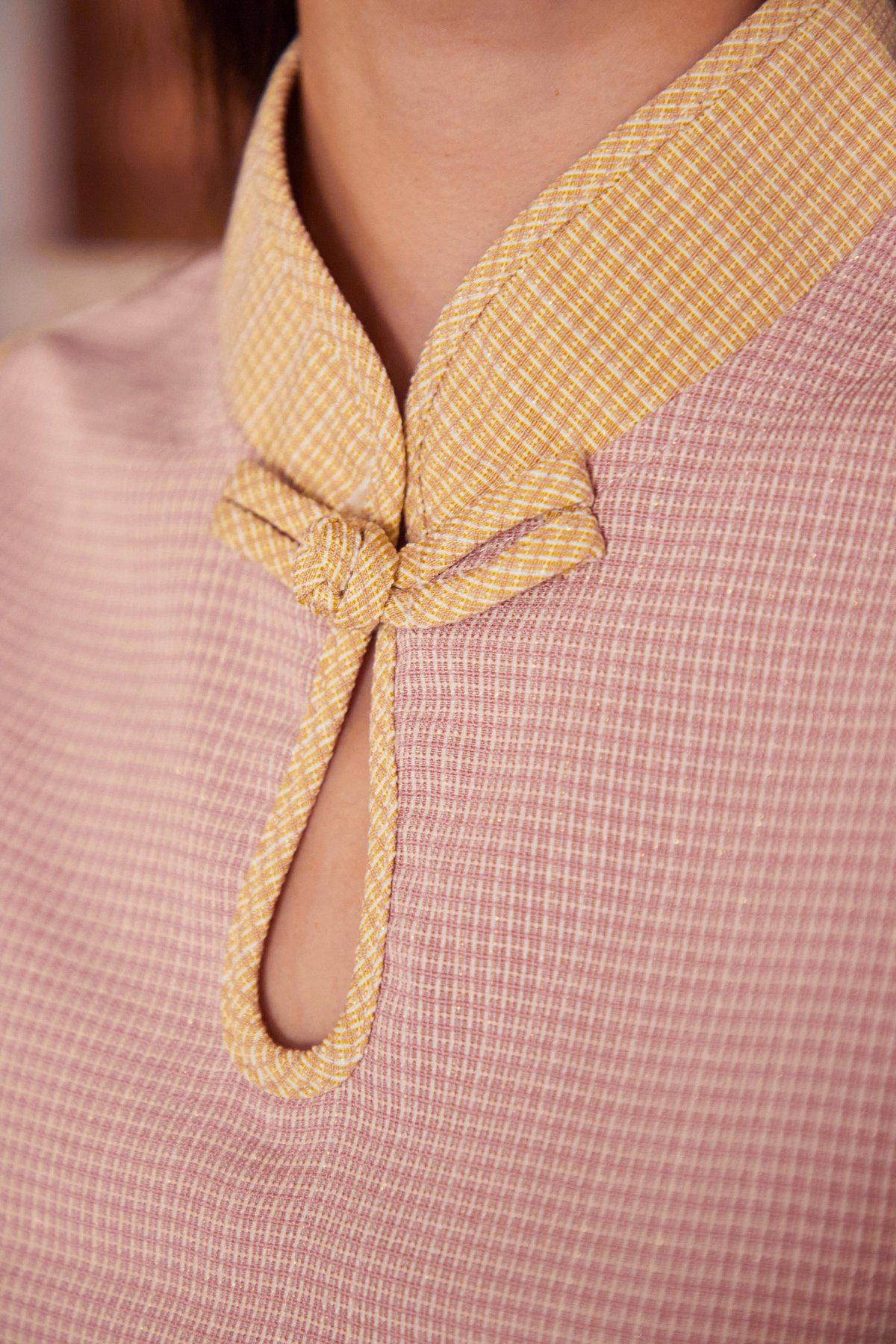 A cheongsam top designed with a mandarin stand collar and functional Chinese frog buttons at the front. Finished with a front keyhole detail, colour-blocking piping accents, and a back concealed zipper.