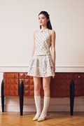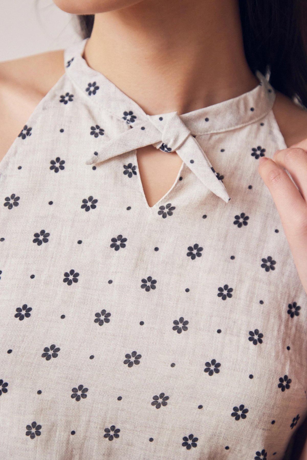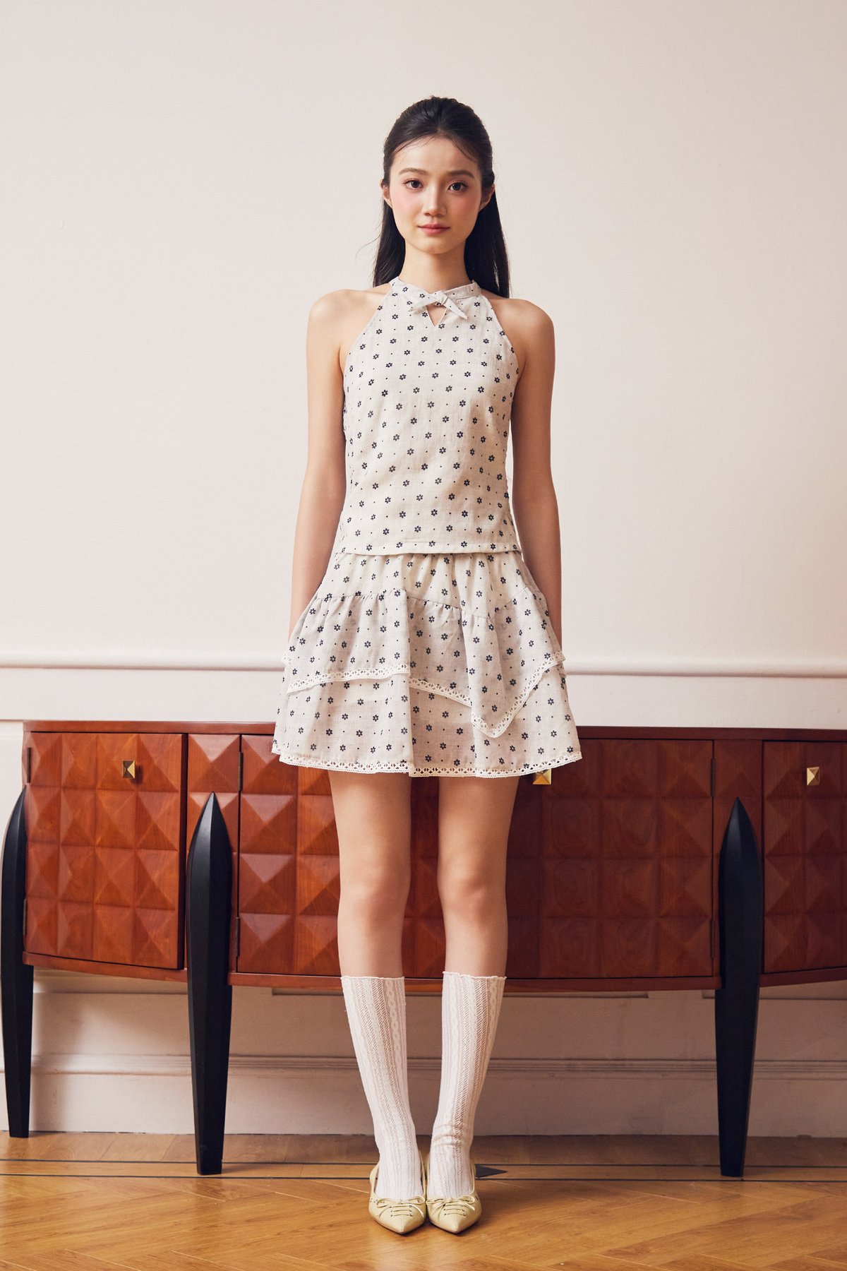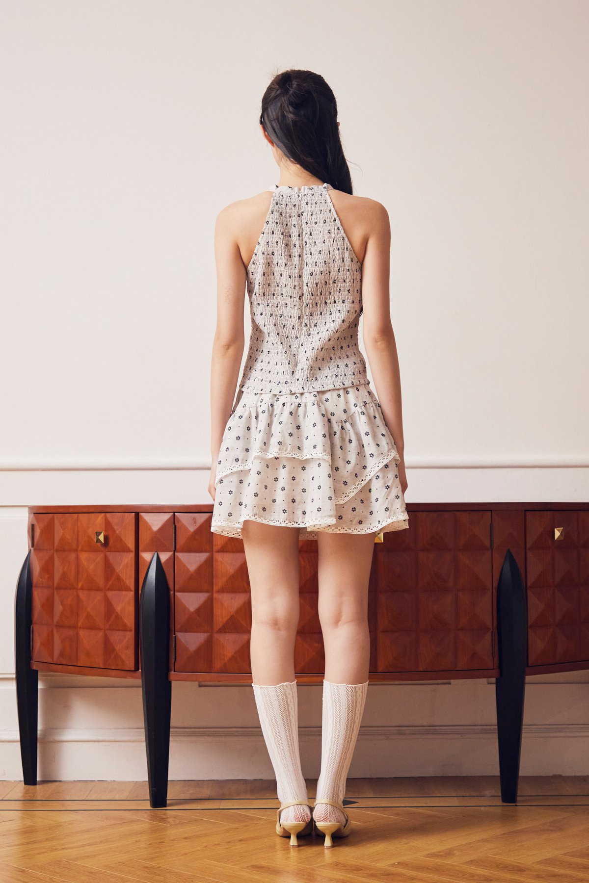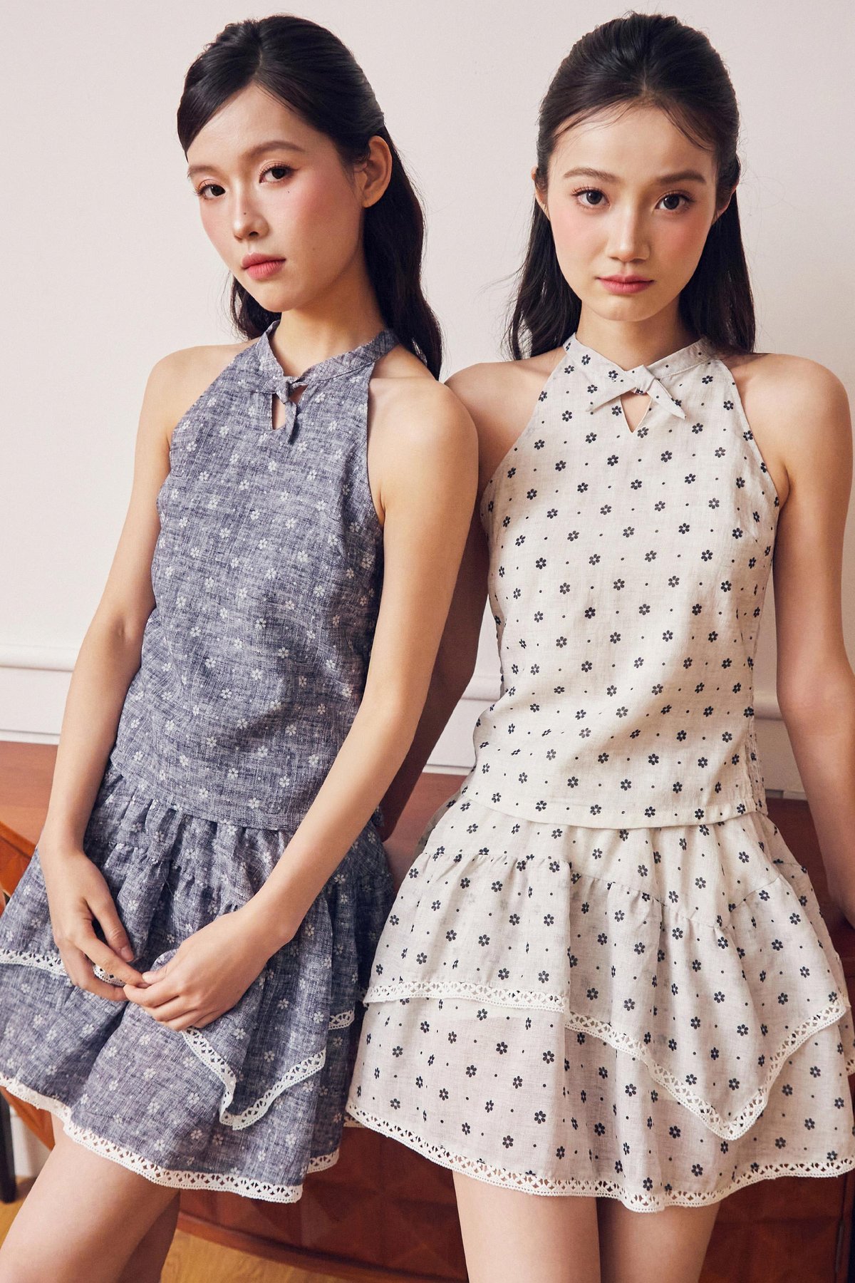 This top features a Chinese stand collar with an adjustable front ribbon tie for a refined yet feminine touch. Designed with a fully smocked back for comfort and flexibility, it is finished with a concealed zipper at the back for a clean, seamless look.