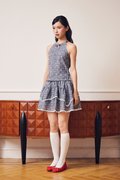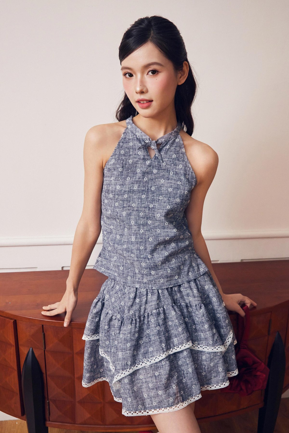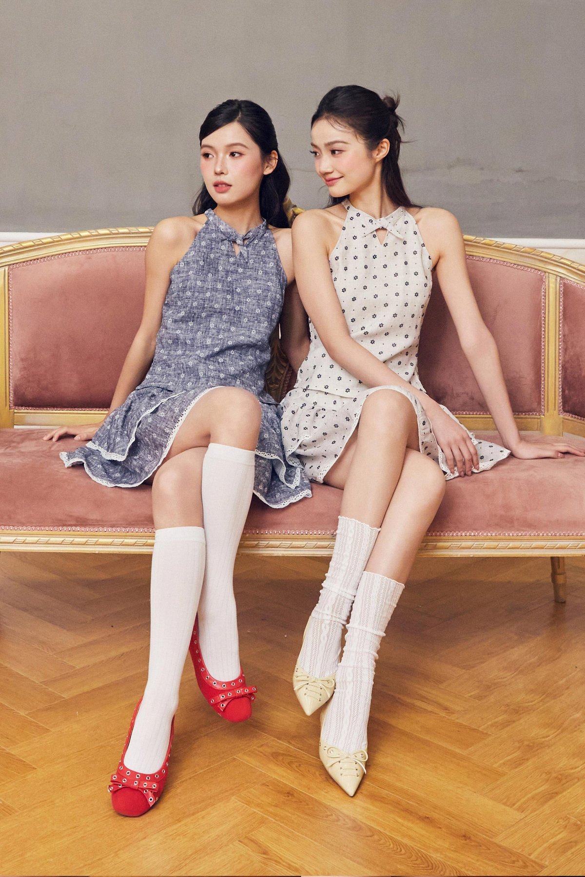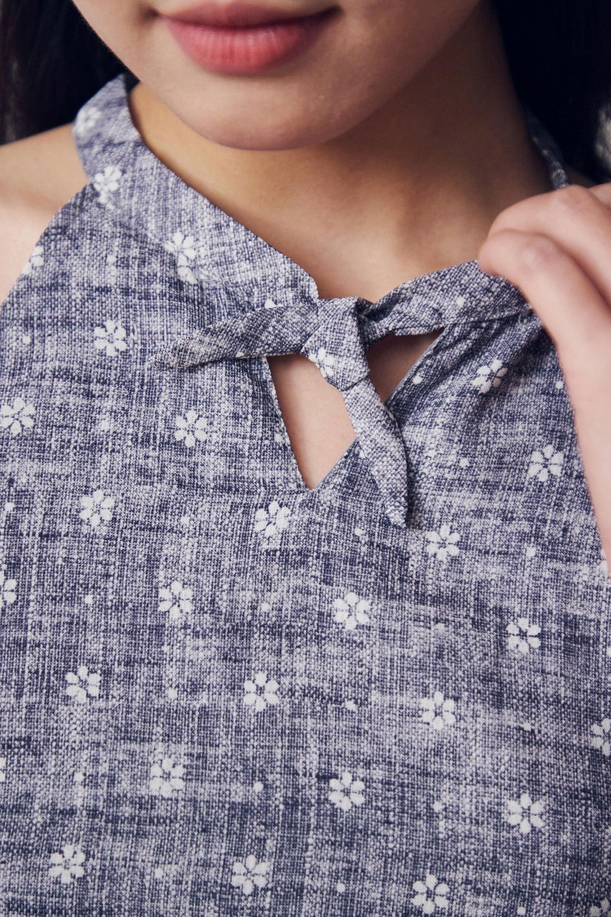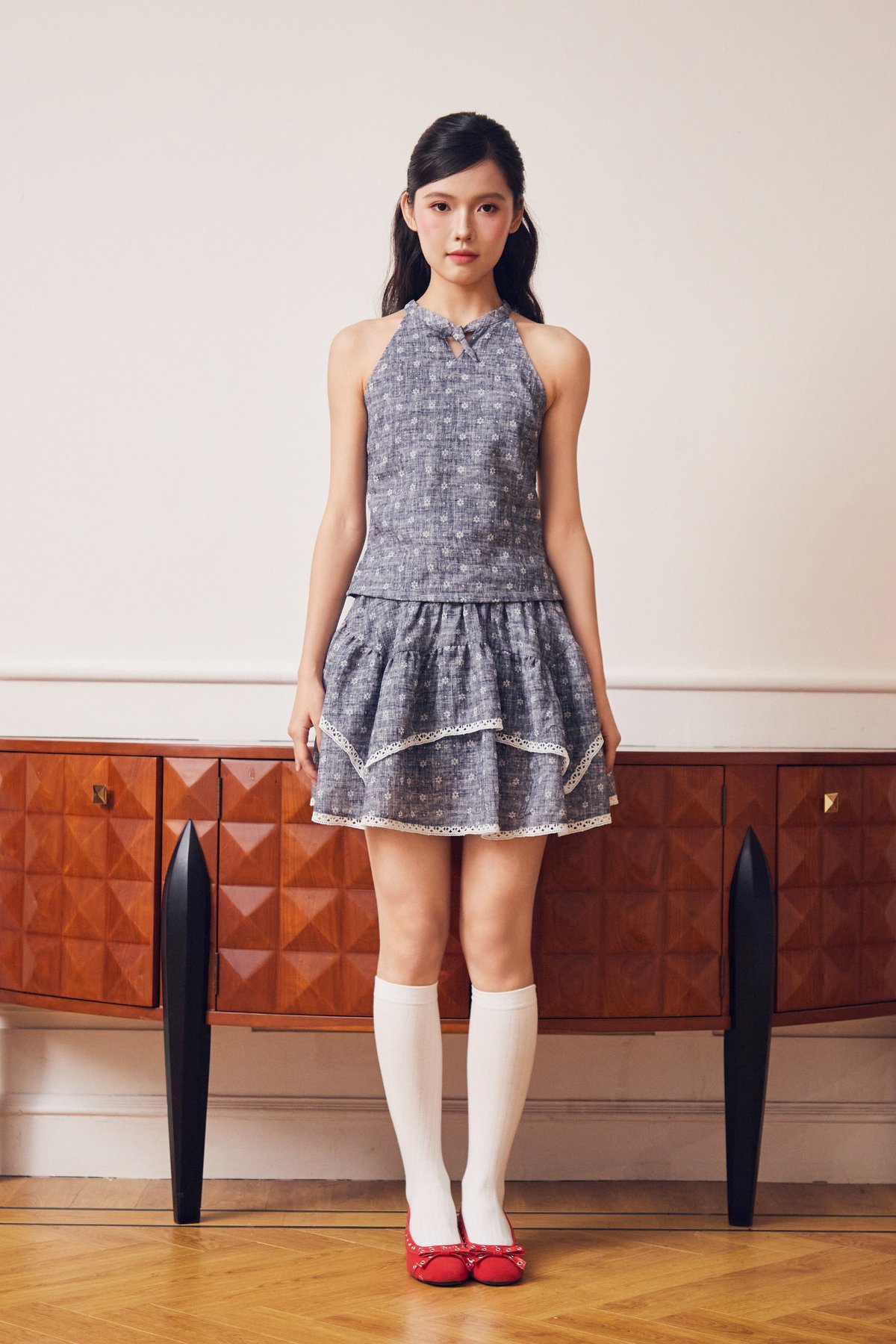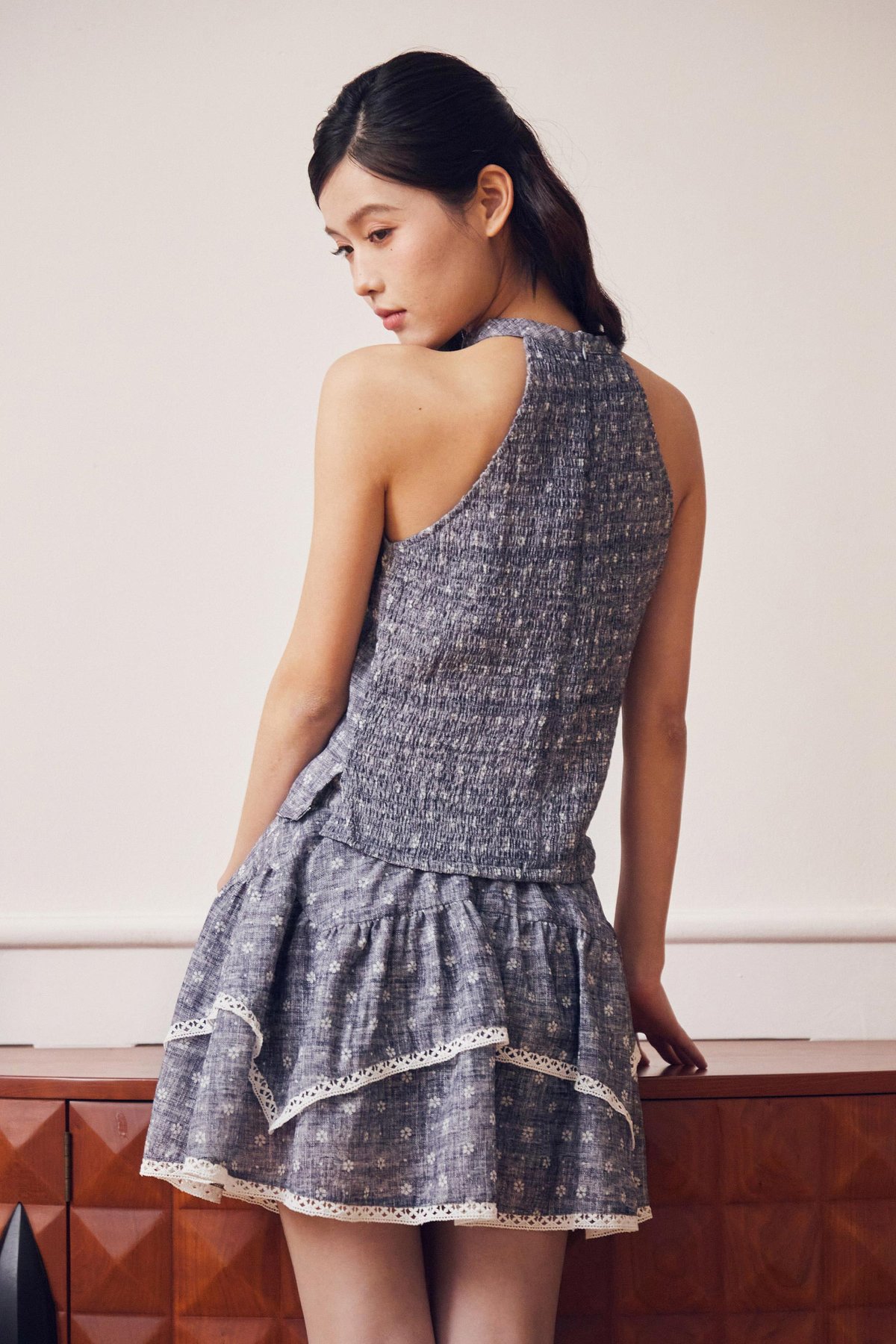 This top features a Chinese stand collar with an adjustable front ribbon tie for a refined yet feminine touch. Designed with a fully smocked back for comfort and flexibility, it is finished with a concealed zipper at the back for a clean, seamless look.