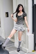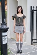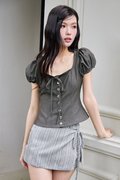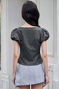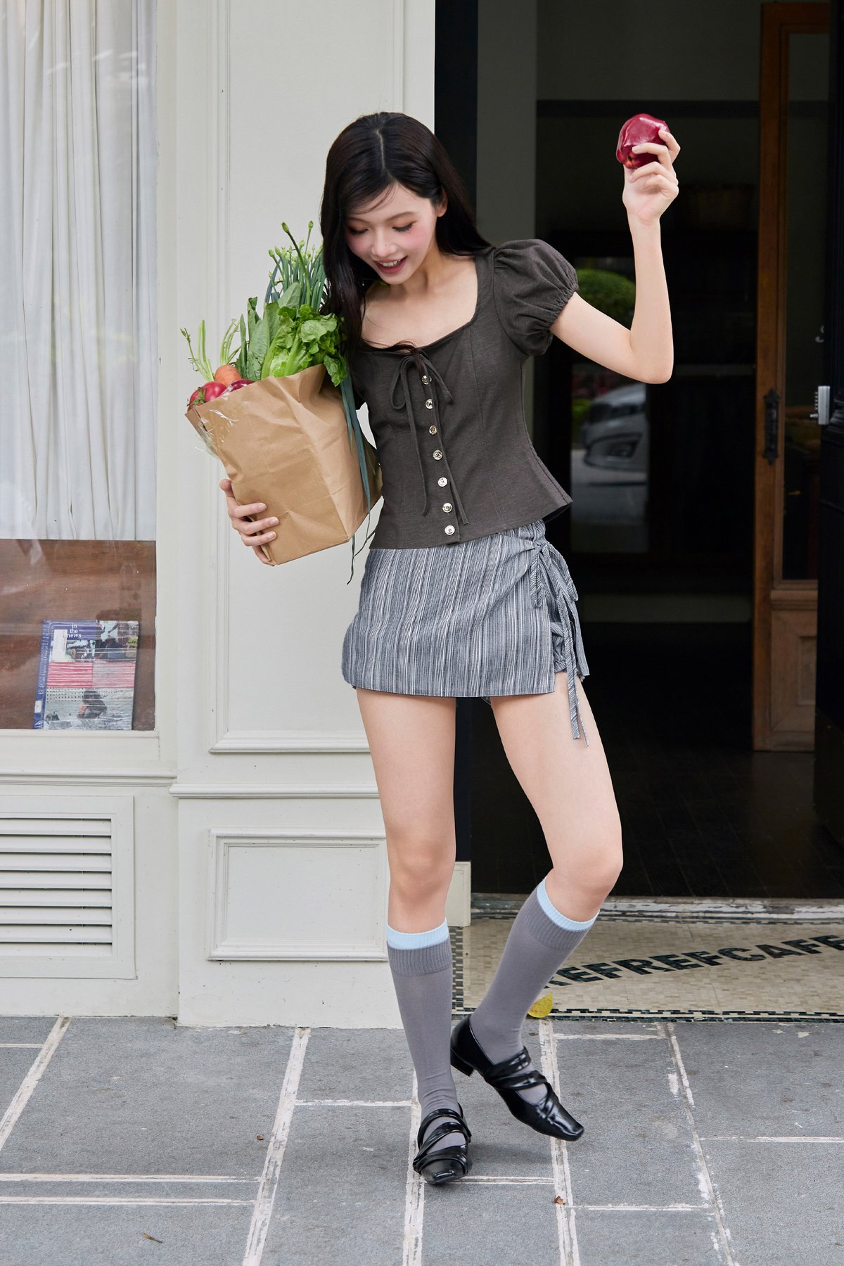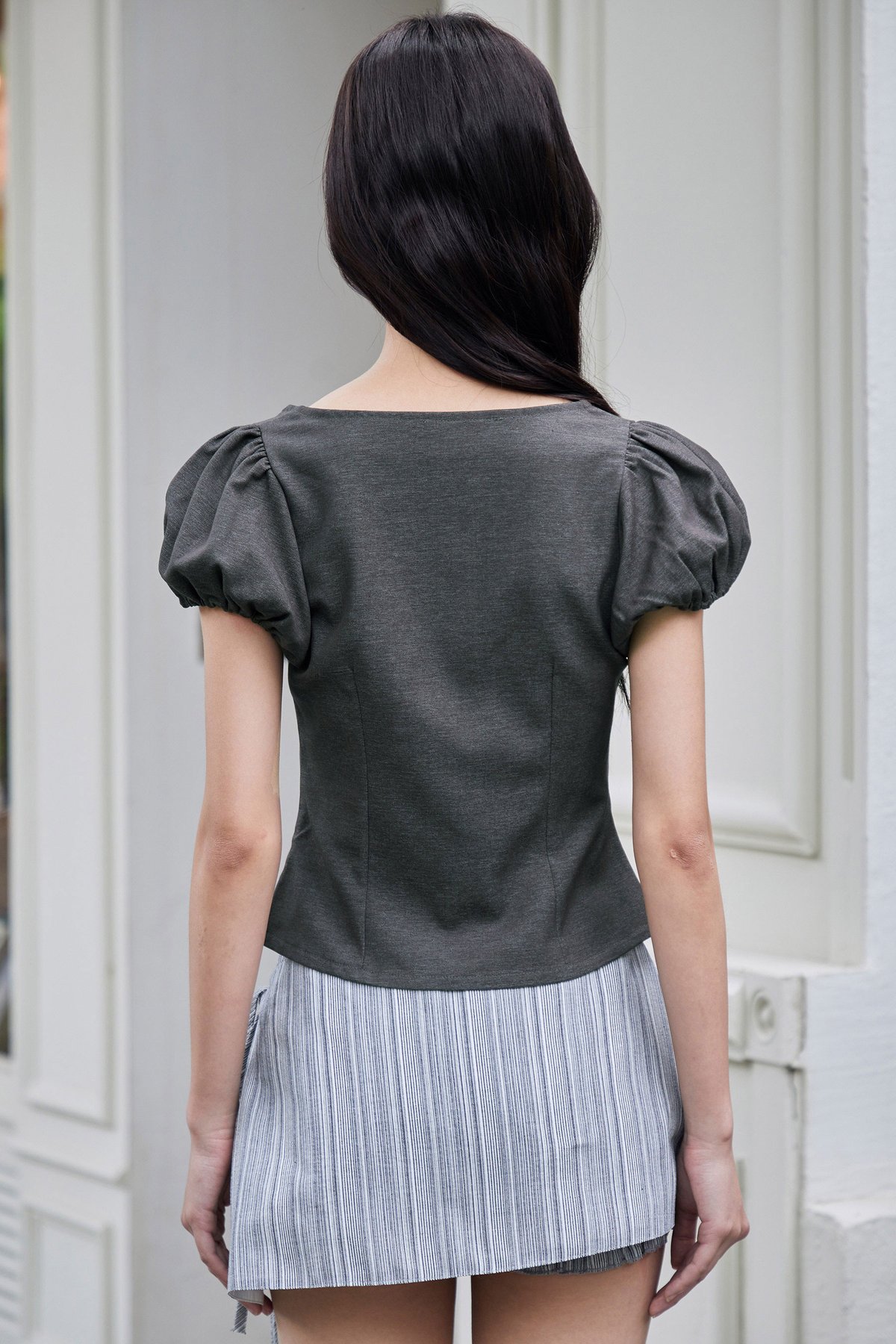 This top features puff sleeves with elasticated hems, a rounded square neckline, functional front buttons, and a faux ribbon detail for a charming finish.