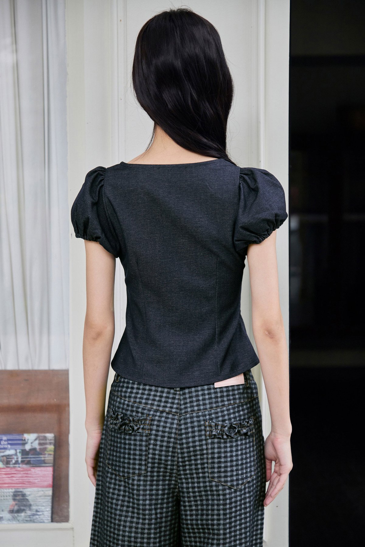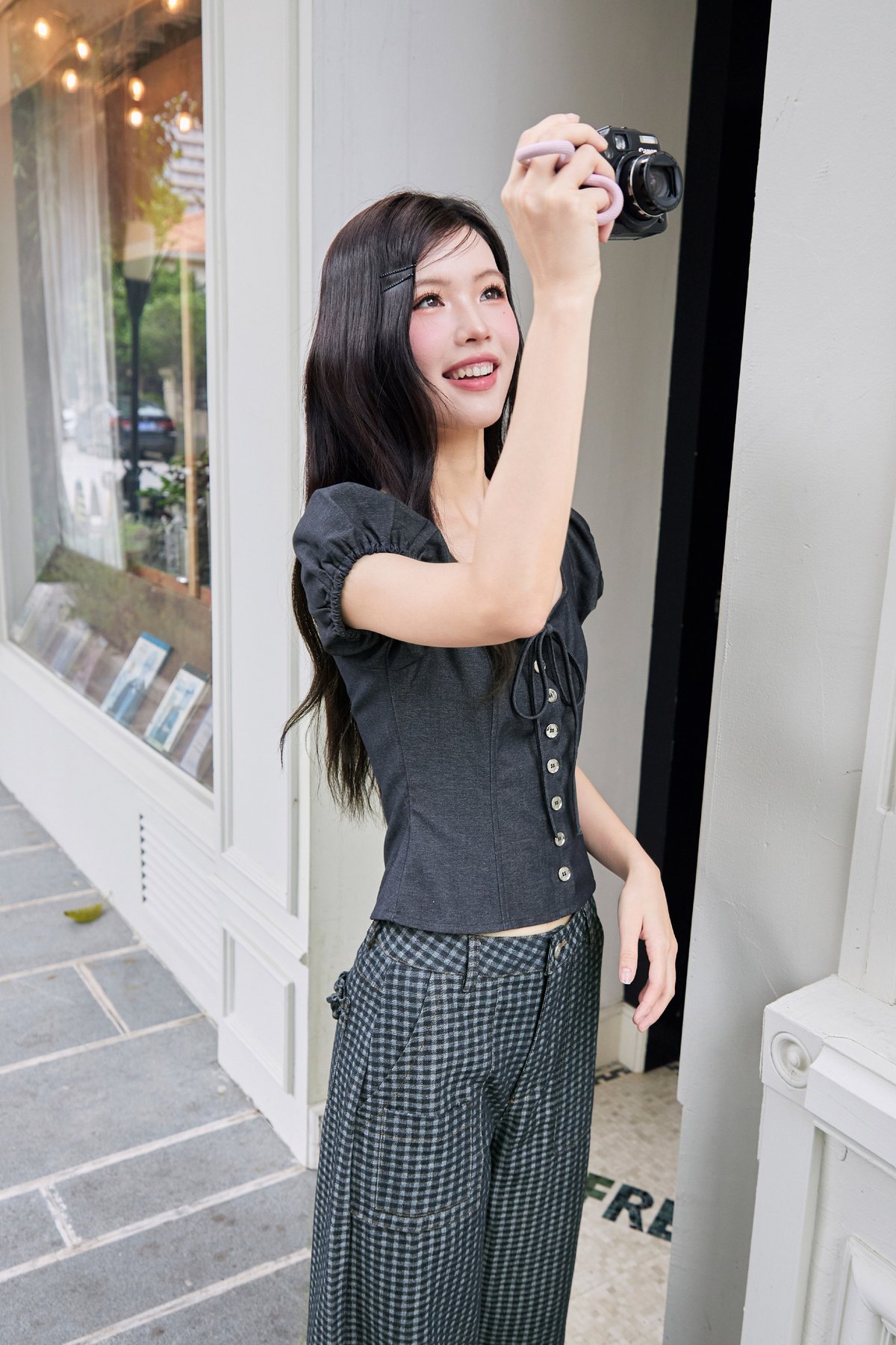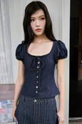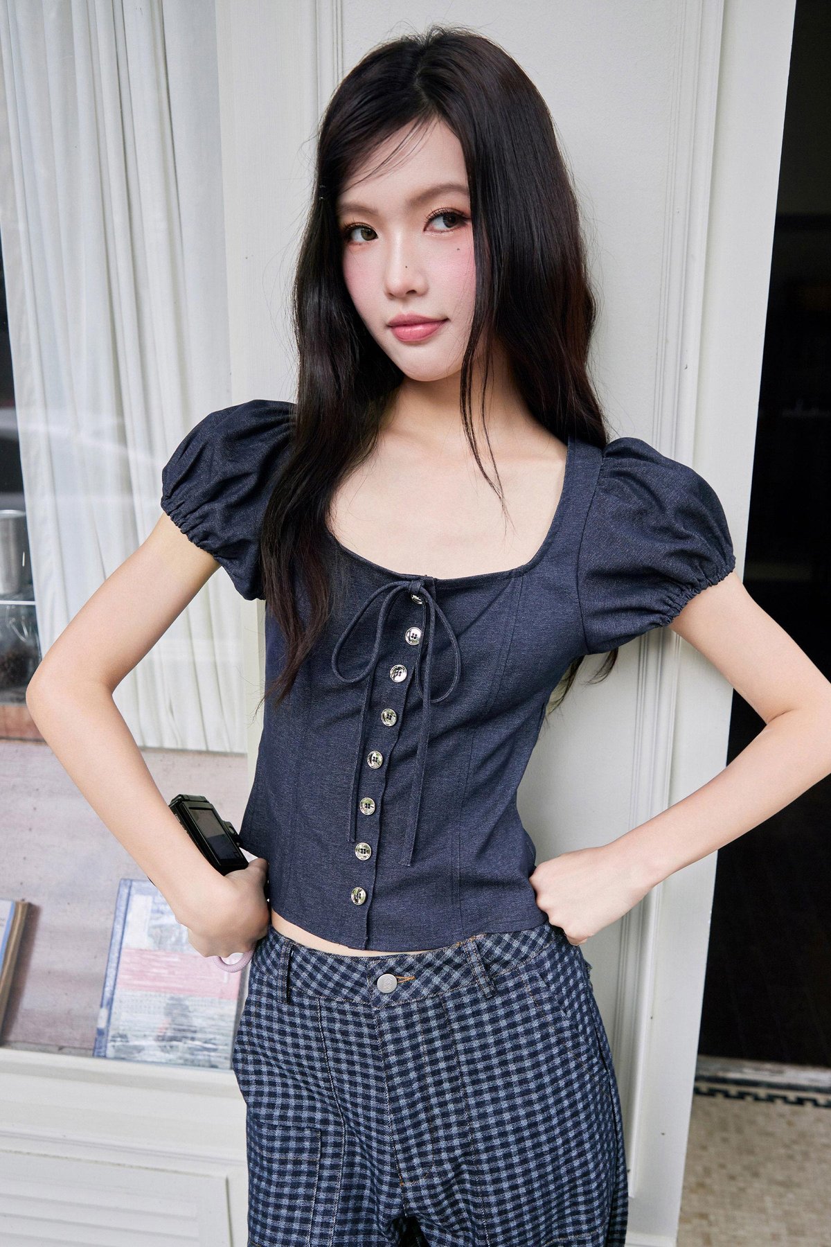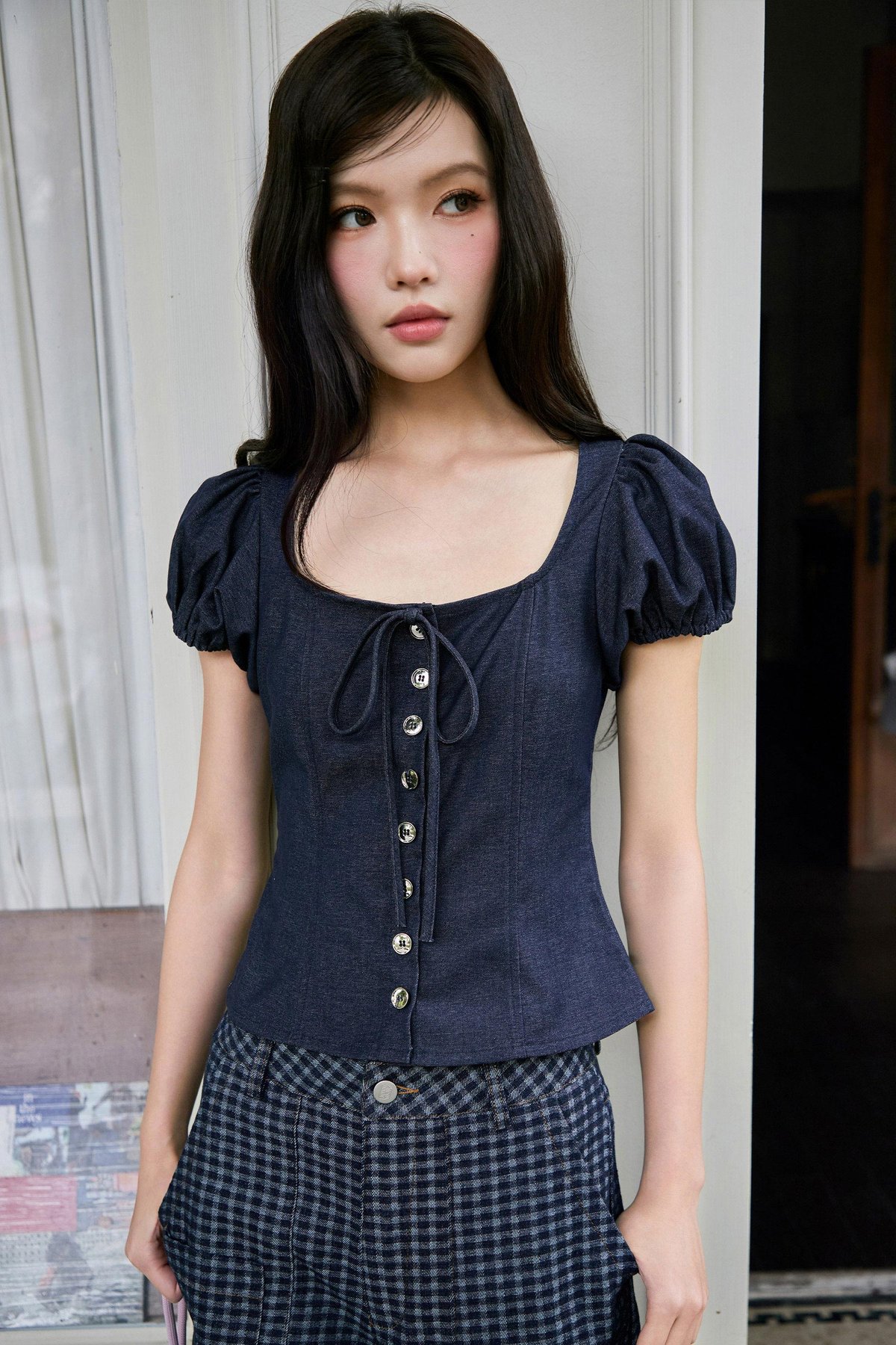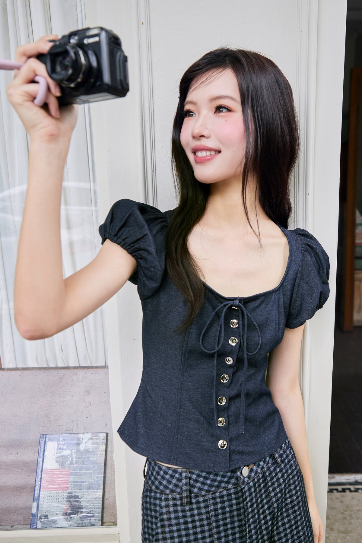 This top features puff sleeves with elasticated hems, a rounded square neckline, functional front buttons, and a faux ribbon detail for a charming finish.