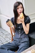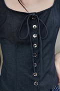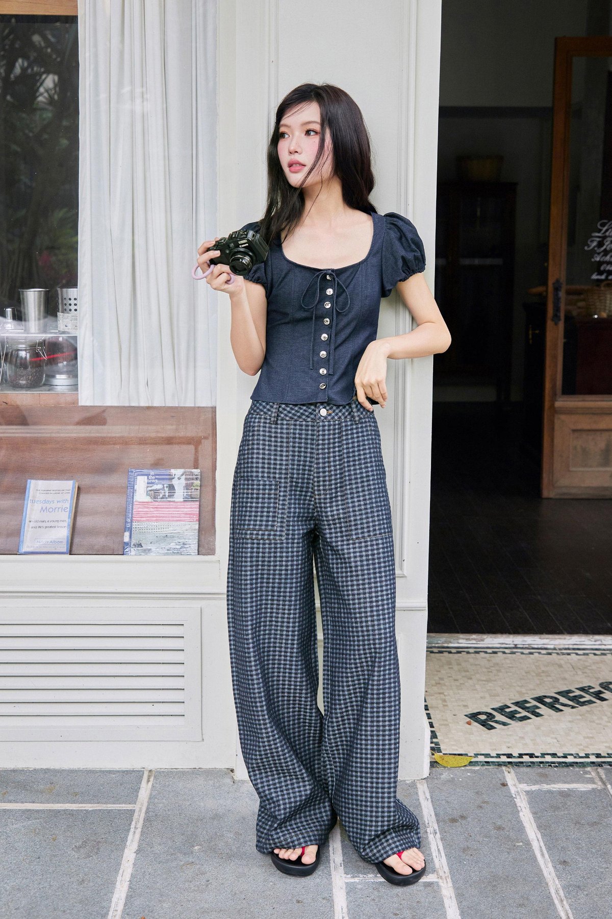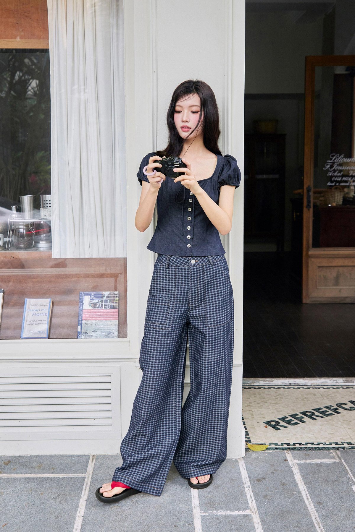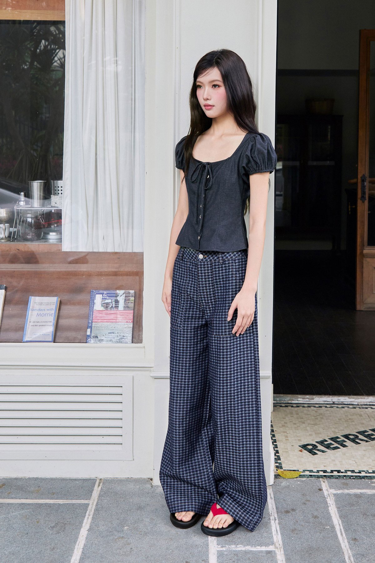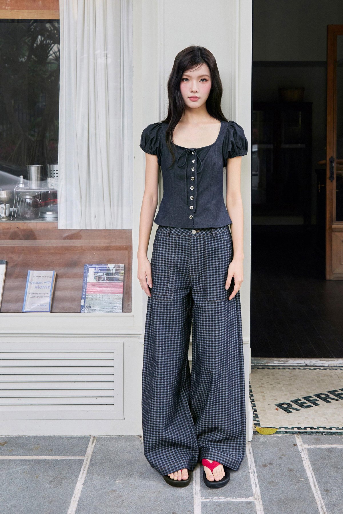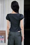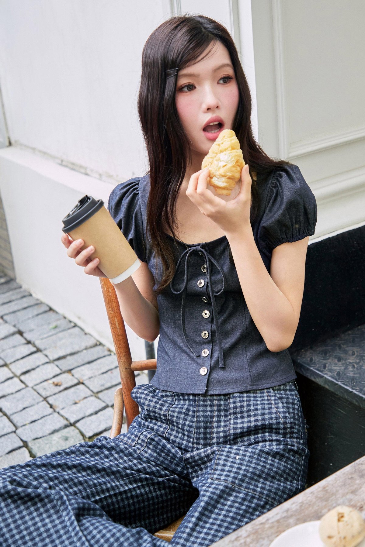 This top features puff sleeves with elasticated hems, a rounded square neckline, functional front buttons, and a faux ribbon detail for a charming finish.