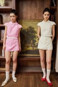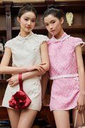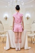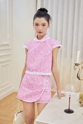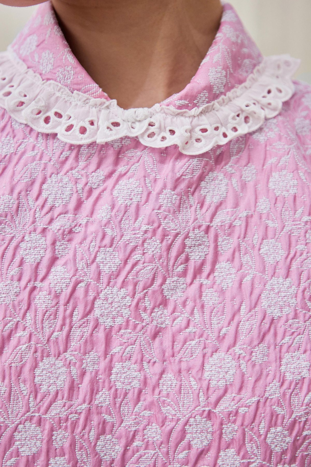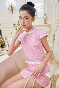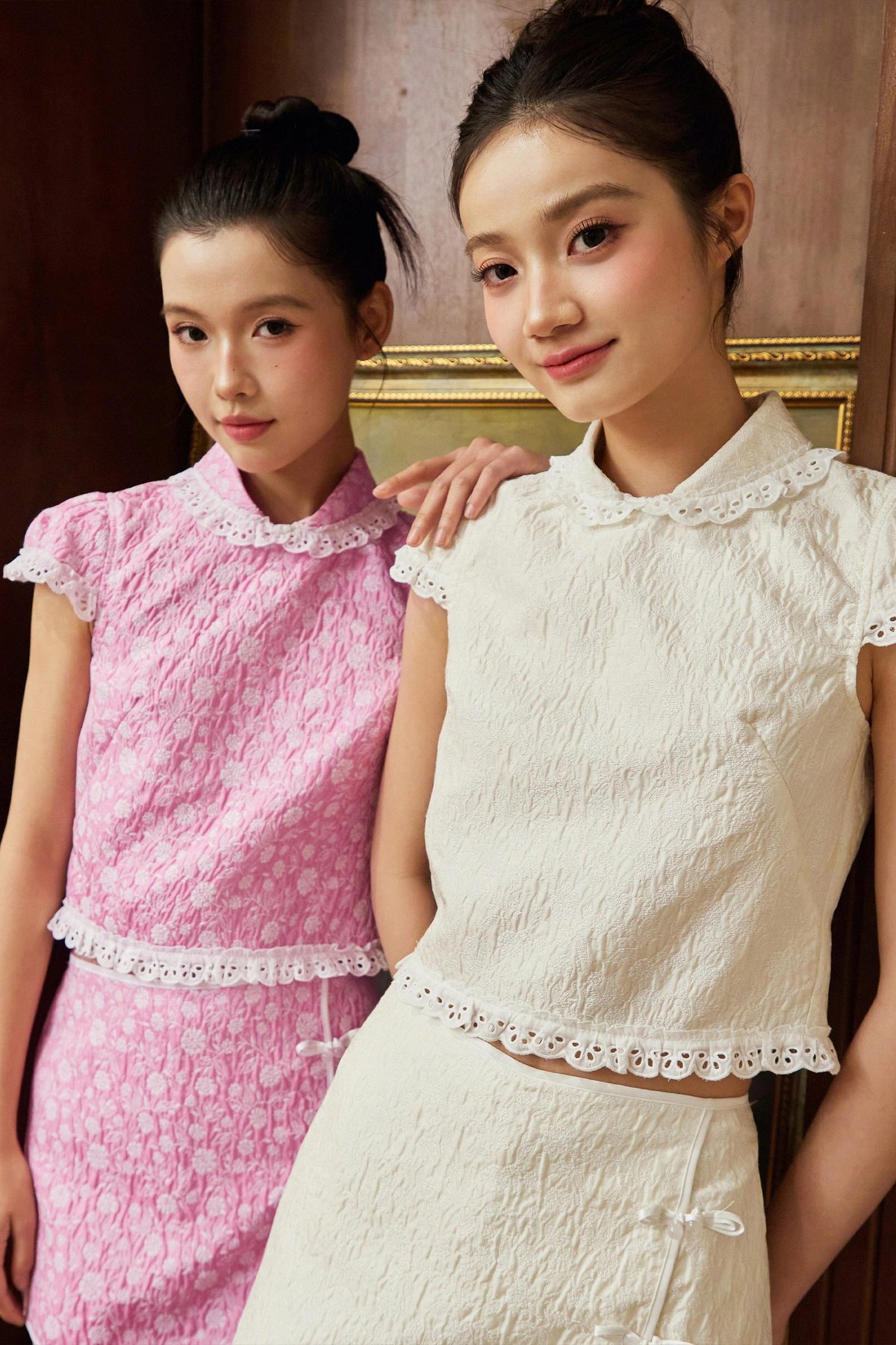 A top finished with lace trimmings at the sleeve hem, hem, and collar, designed with cap sleeves, a Peter Pan collar, and a back open-ended zipper.