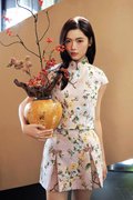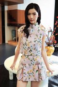 A top featuring a Chinese stand collar, an asymmetrical front closure with a self-tie ribbon and hidden snap buttons, finished with semi cap sleeves.