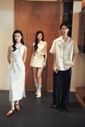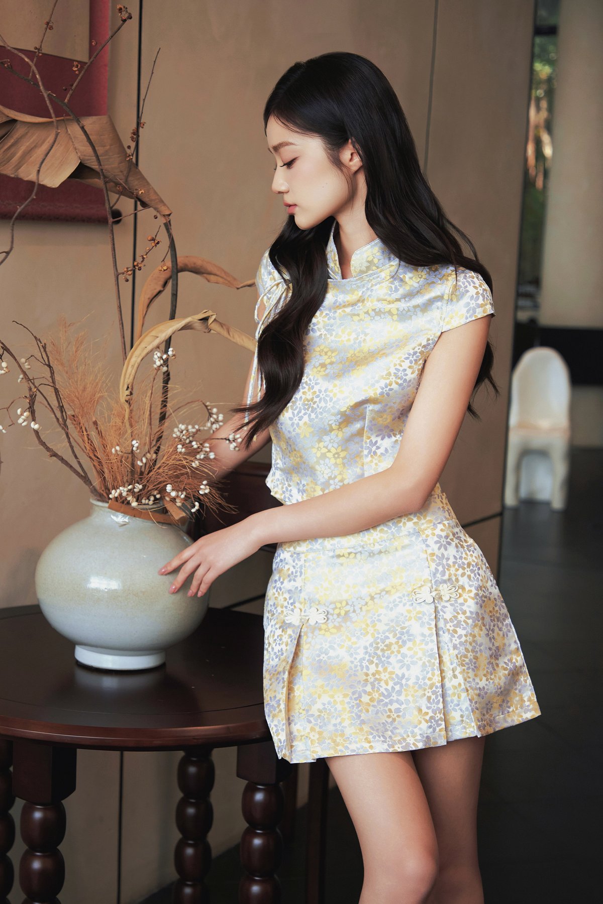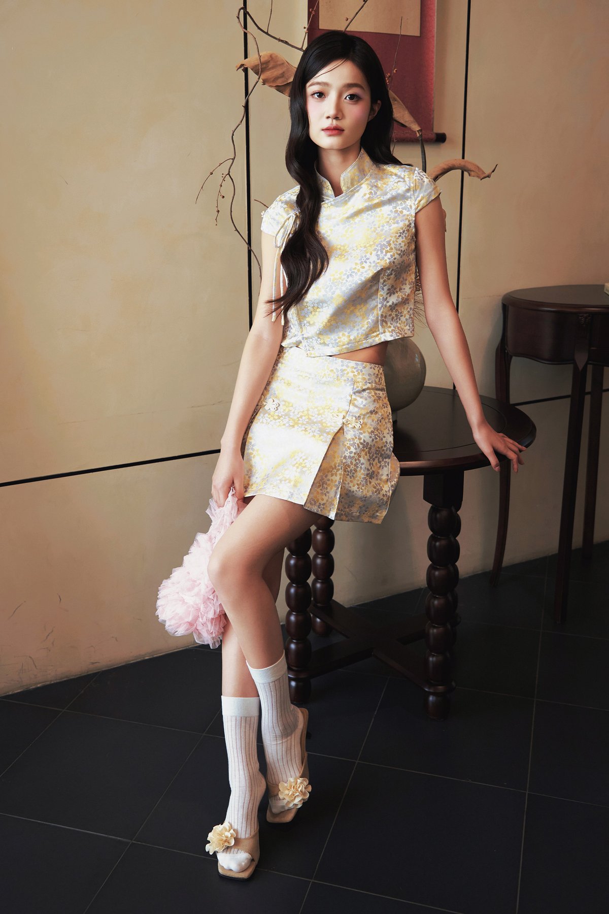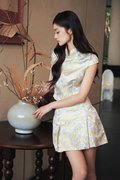 A top featuring a Chinese stand collar, an asymmetrical front closure with a self-tie ribbon and hidden snap buttons, finished with semi cap sleeves.