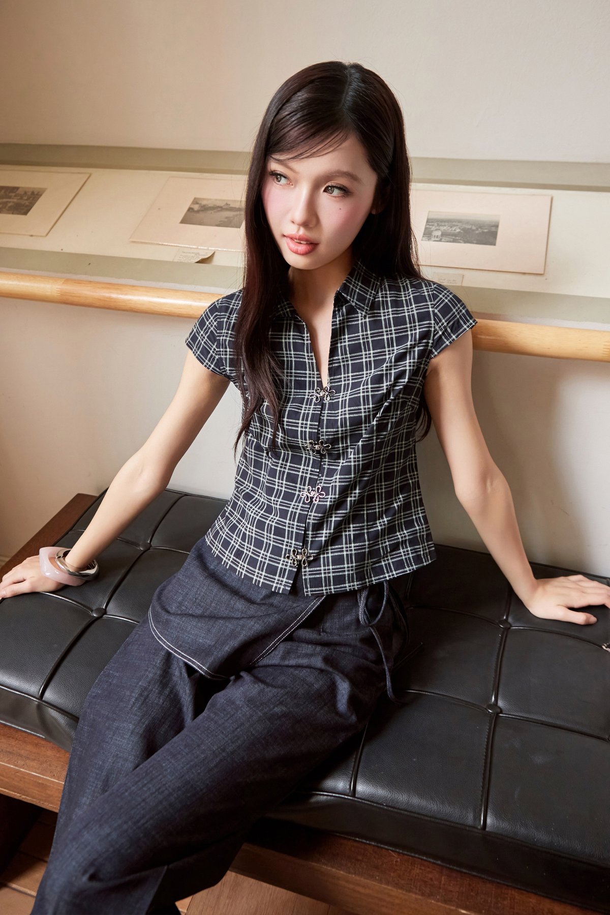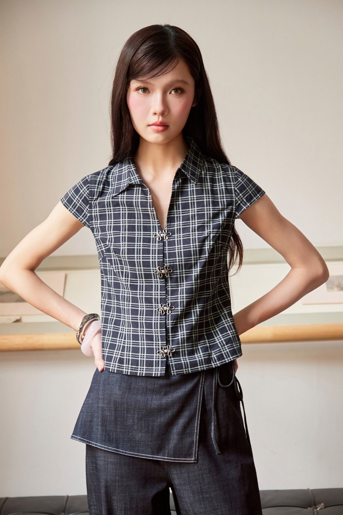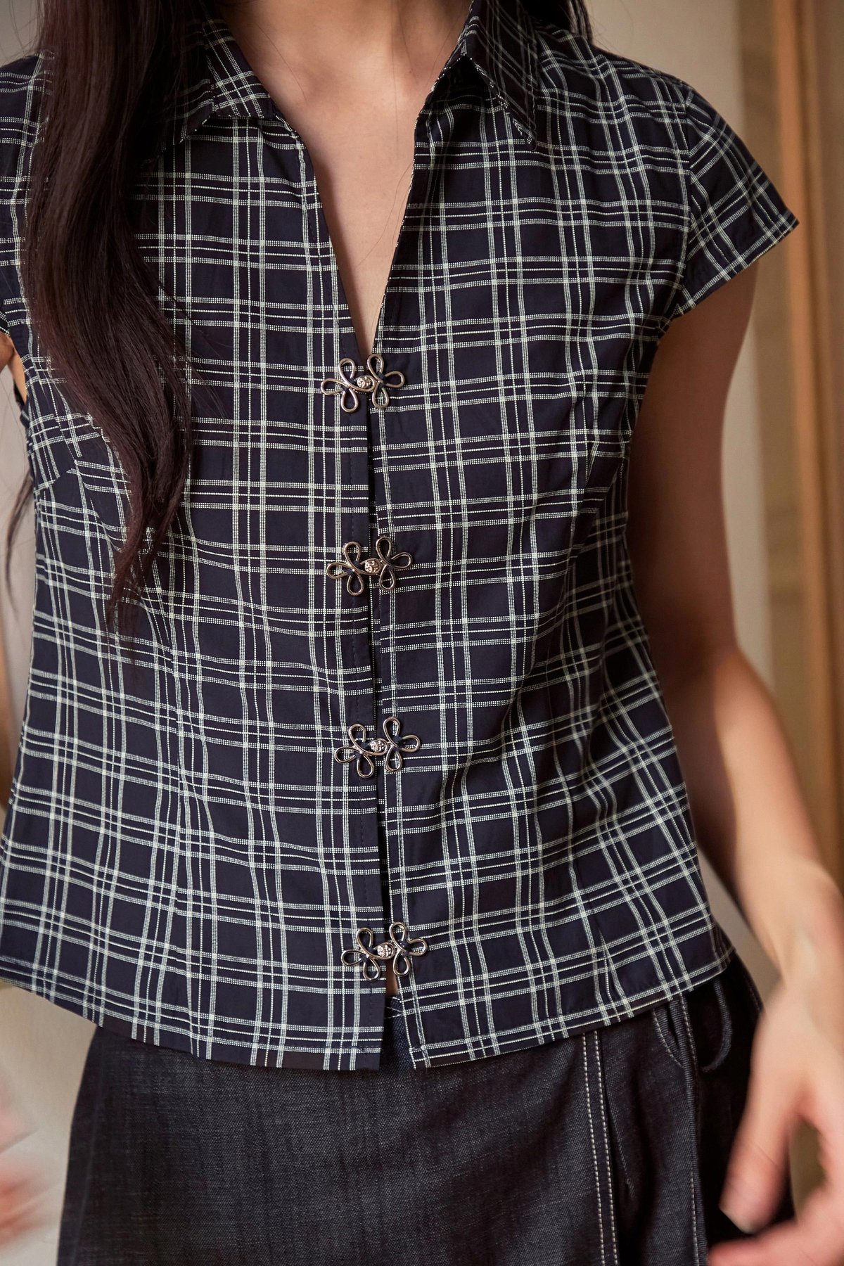 A top with semi cap sleeves and a functional, decorative metal hook button.