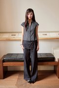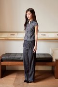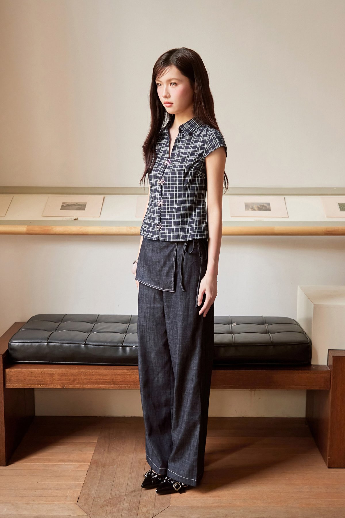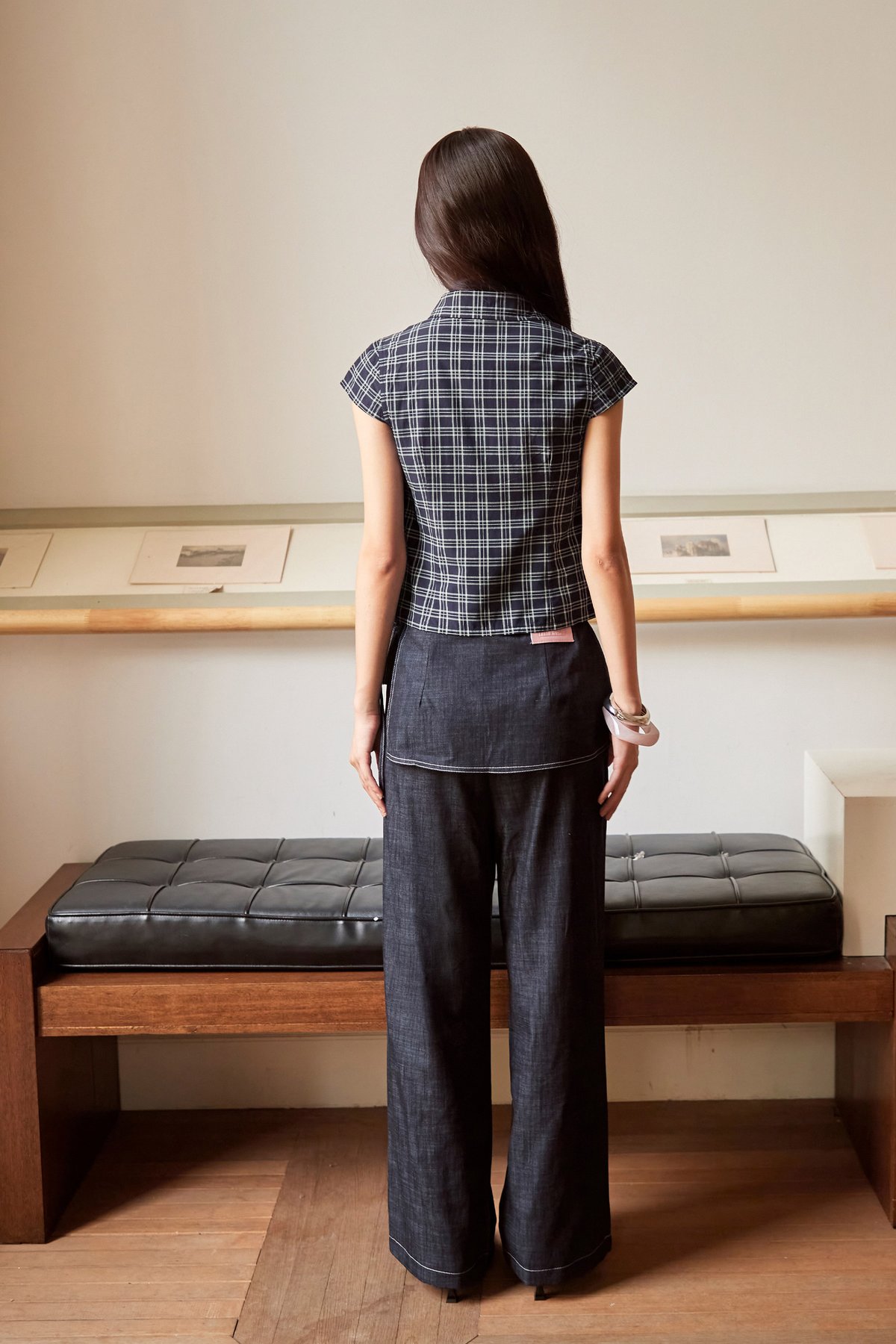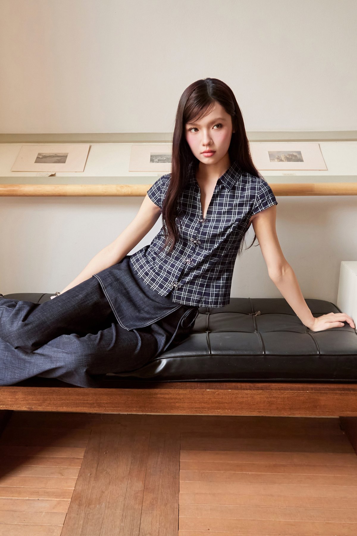 A top with semi cap sleeves and a functional, decorative metal hook button.