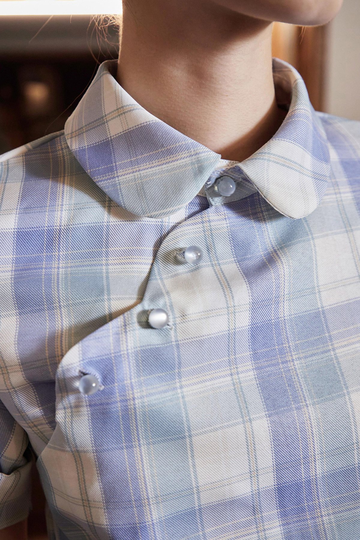 A top featuring a Peter Pan collar with scalloped button detailing, cuffed sleeves, subtle side slits on both sides, and a concealed back zipper for a clean finish.