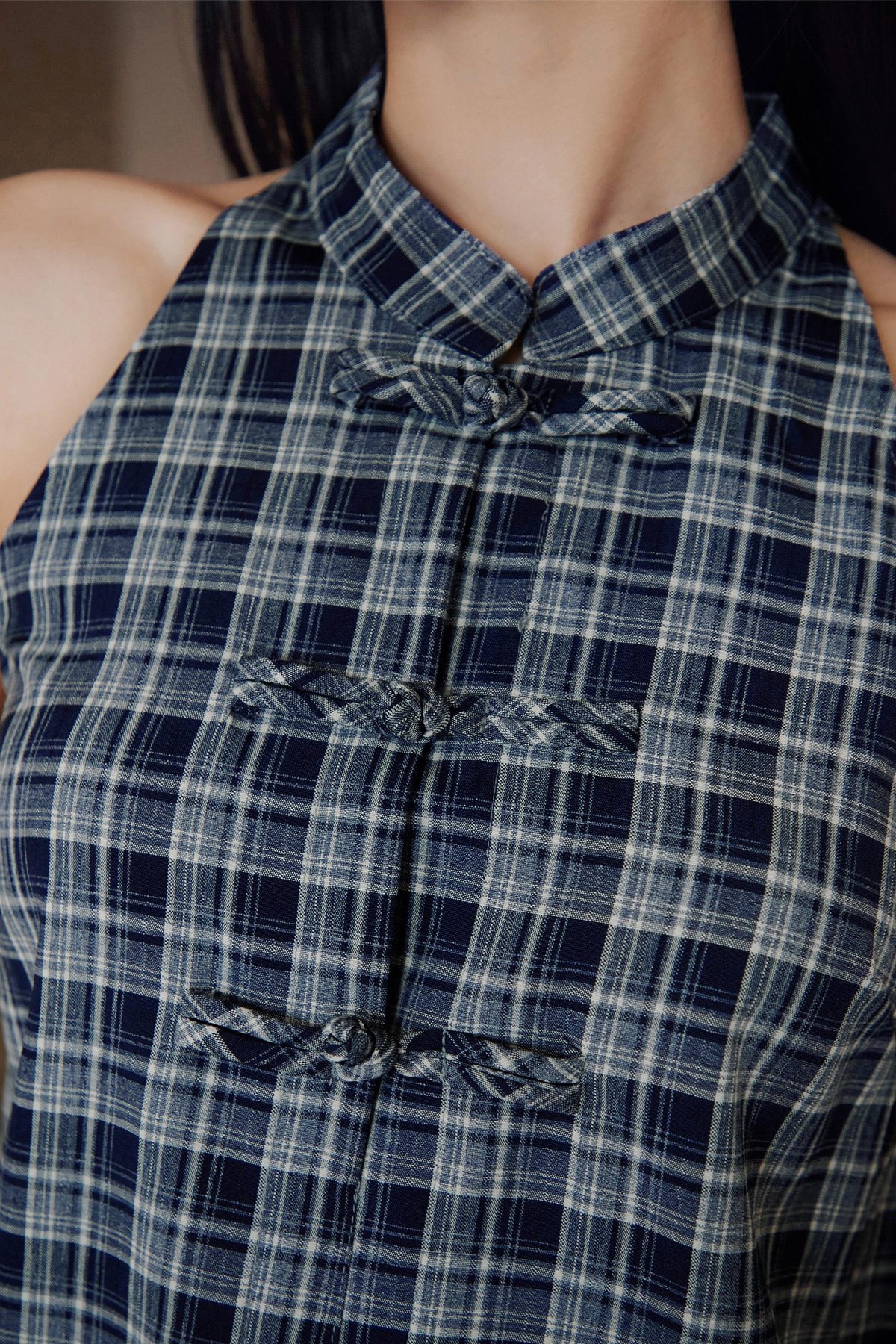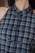 A flared halter neck Cheongsam top featuring a Chinese stand collar, curved hem, and functional Chinese frog buttons at the front.