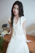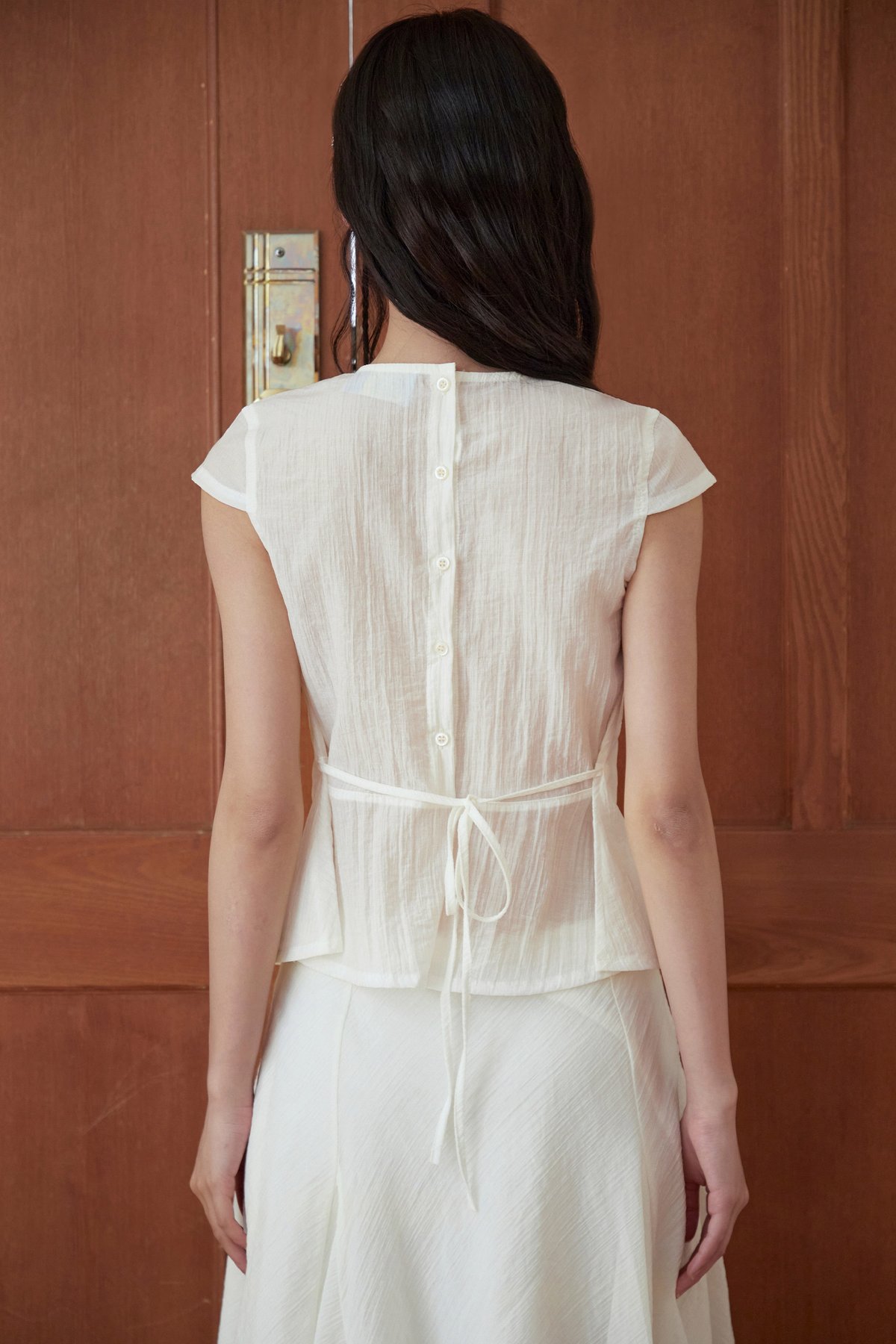 This top features a V-neckline, semi cap sleeves, and a flared silhouette. It comes with a back ribbon tie to cinch the waist and functional back buttons for added detail. It is lined at the bust area only.
