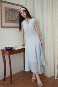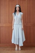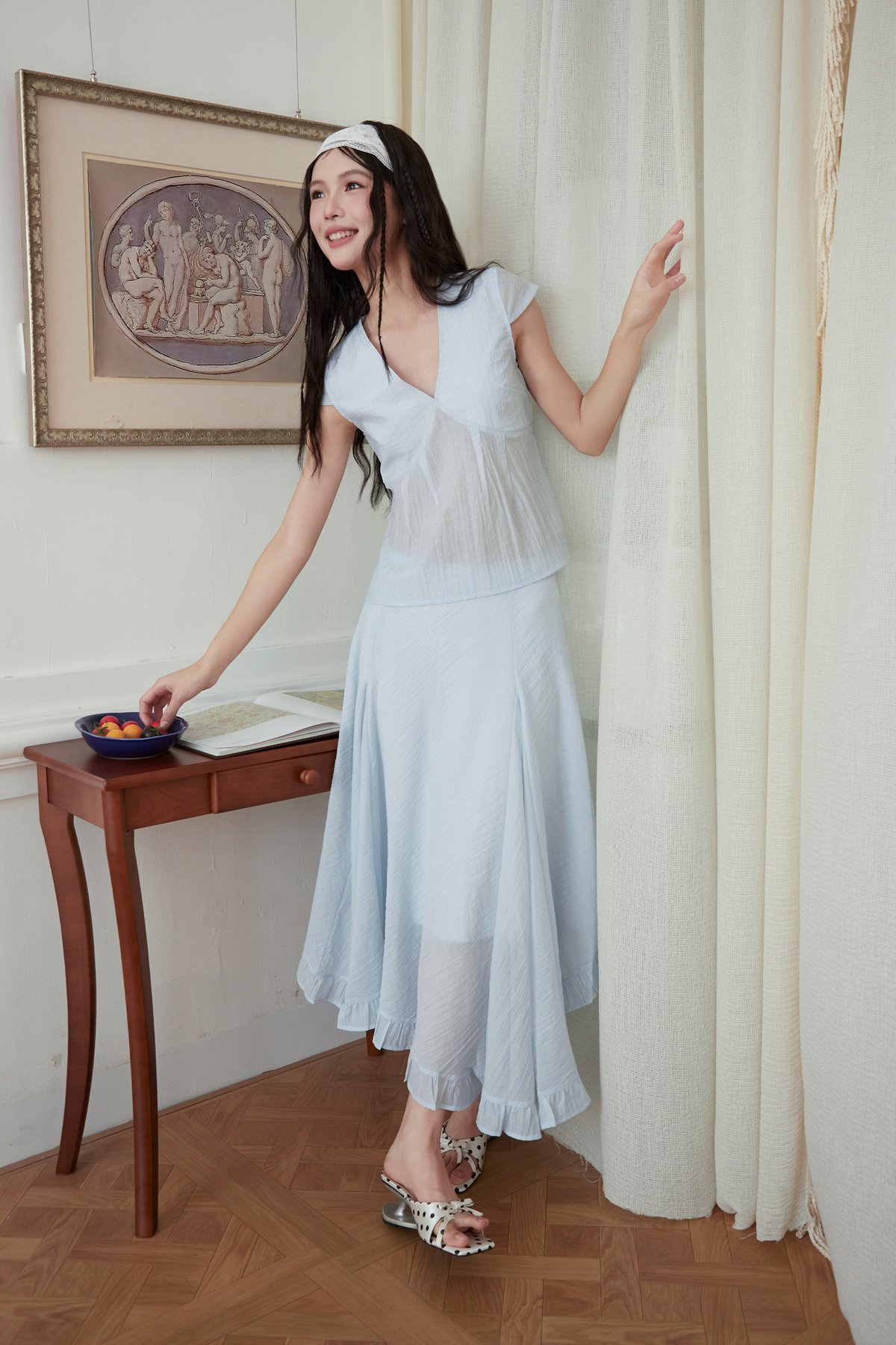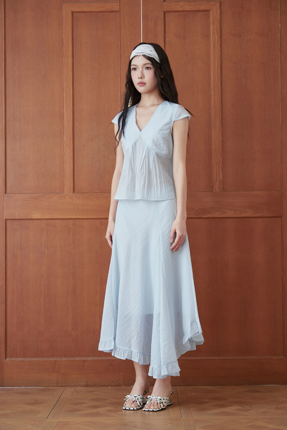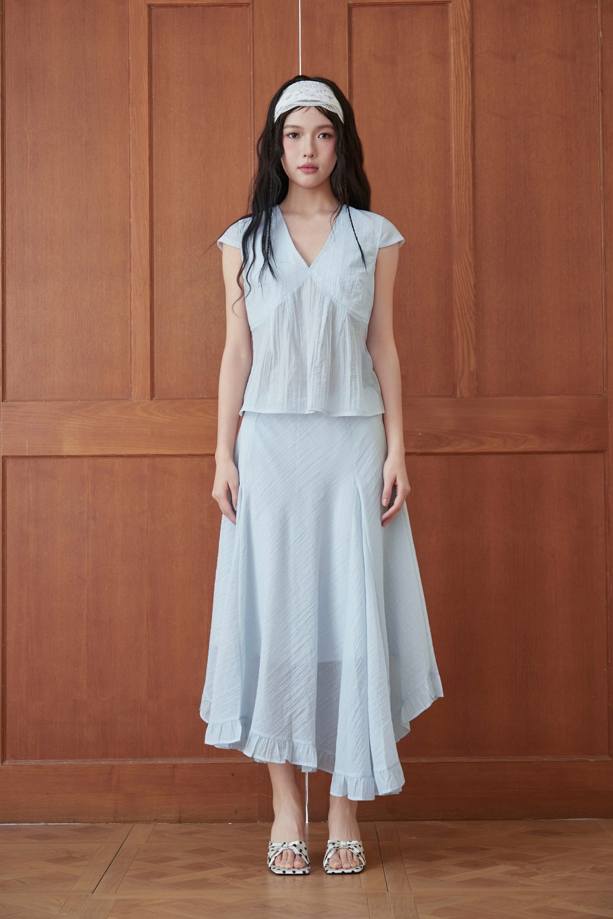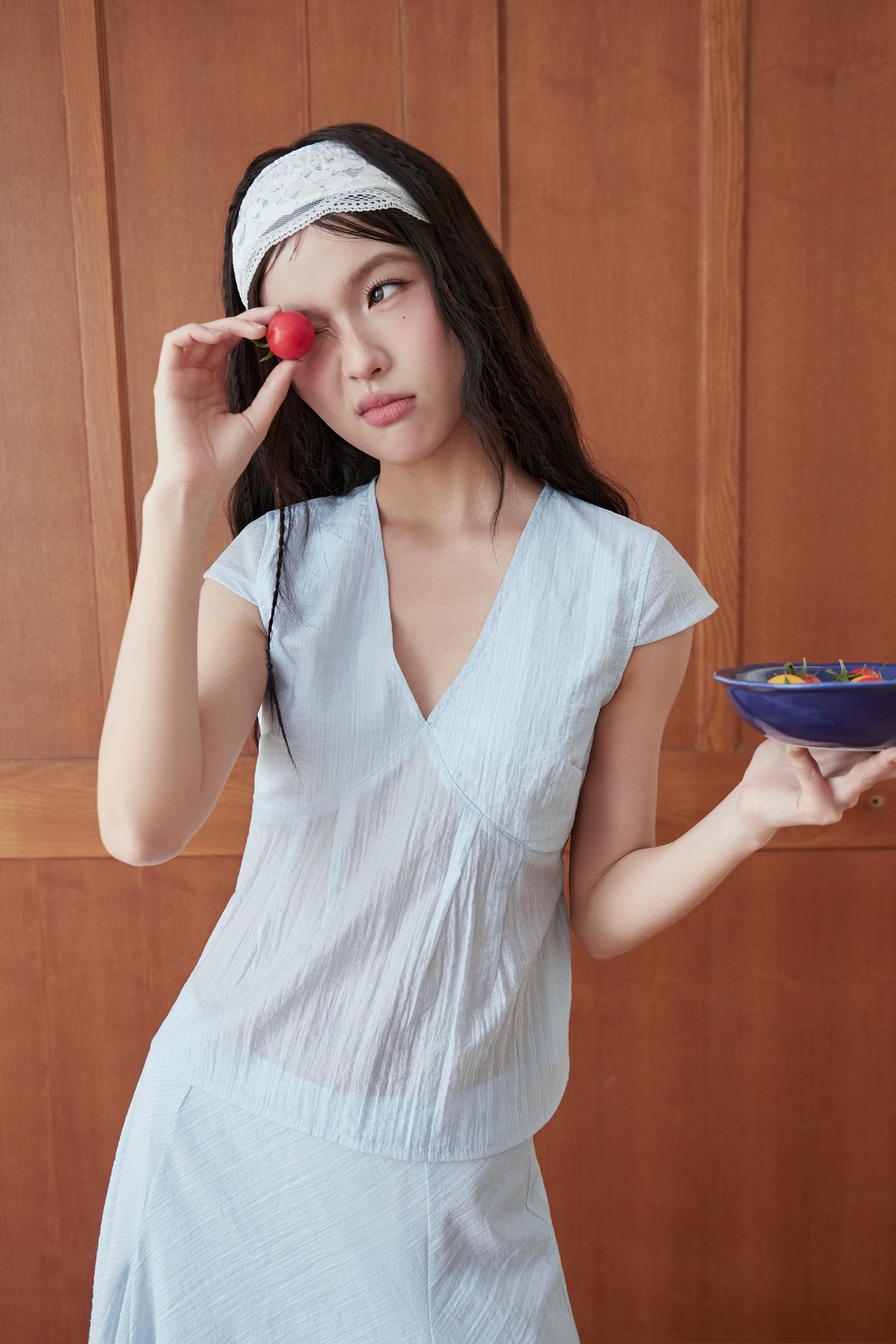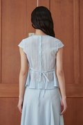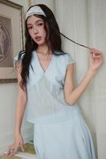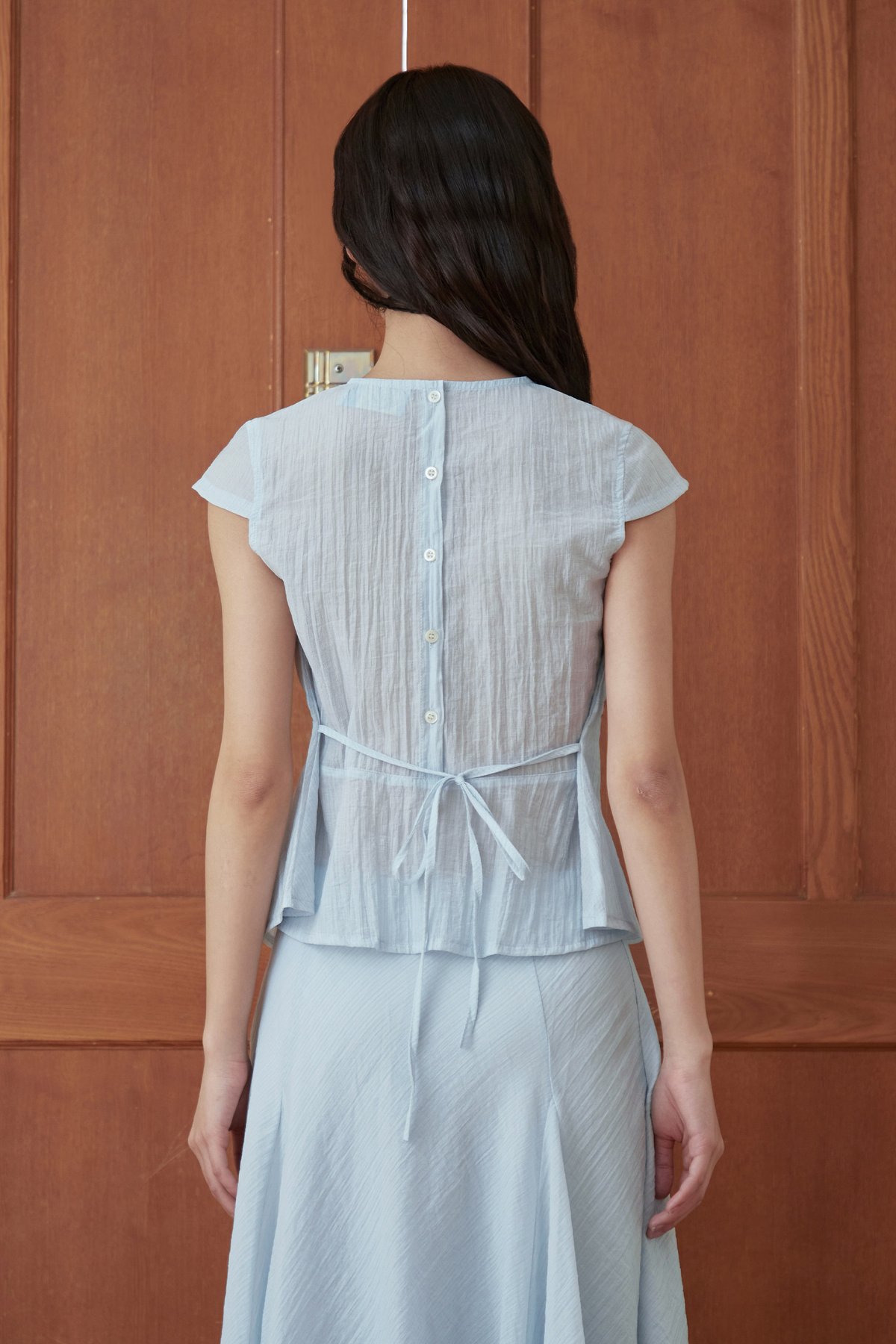 This top features a V-neckline, semi cap sleeves, and a flared silhouette. It comes with a back ribbon tie to cinch the waist and functional back buttons for added detail. It is lined at the bust area only.