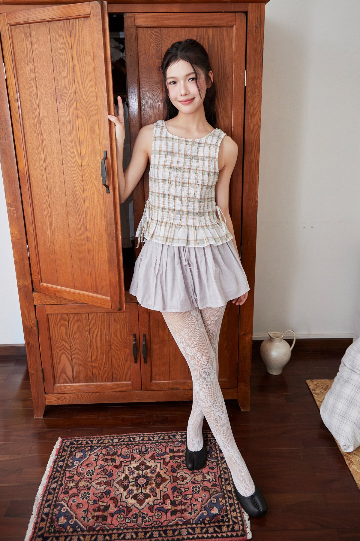 Fully smocked top with adjustable ribbon side slits. Highly stretchable for a comfortable fit.